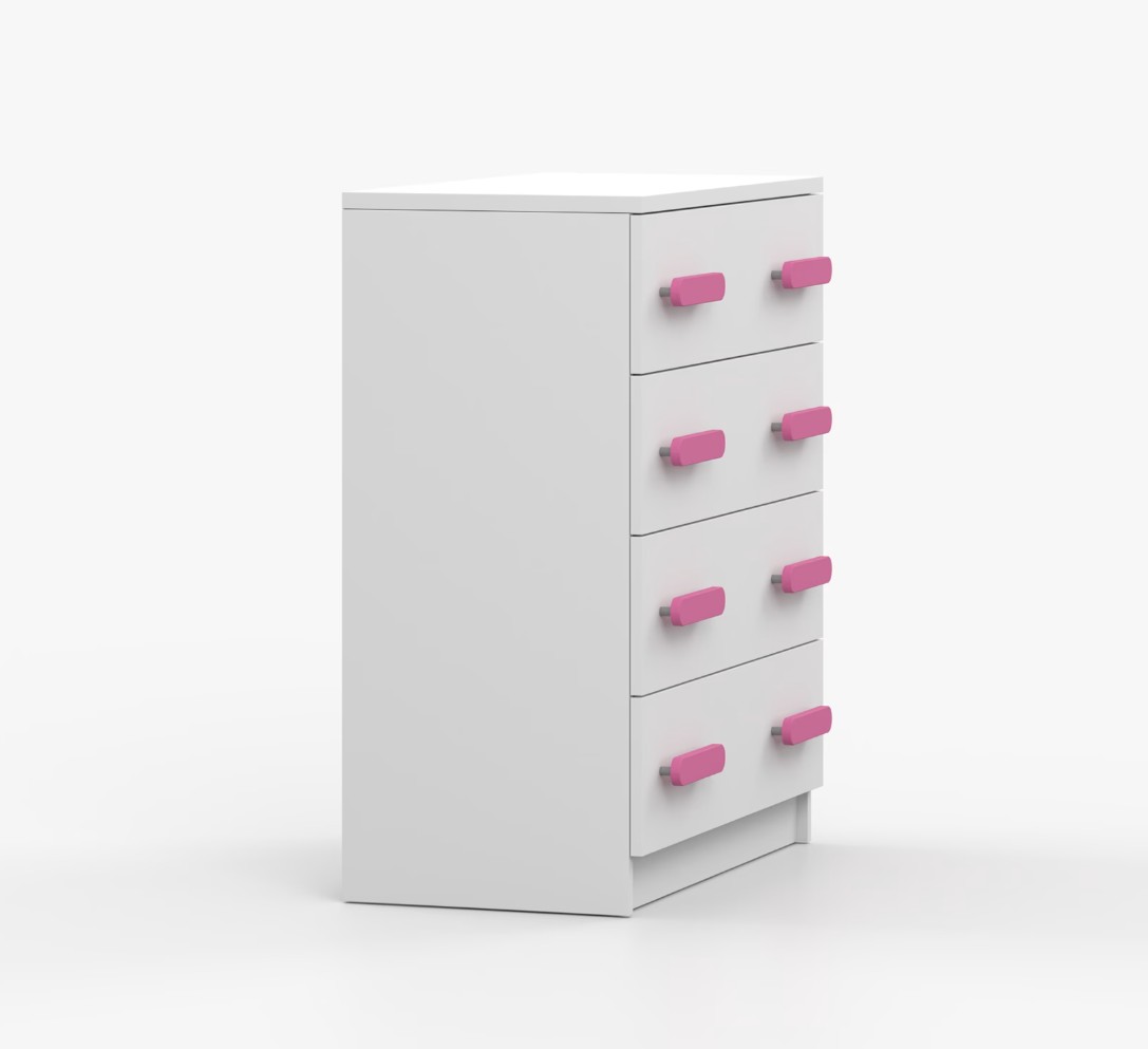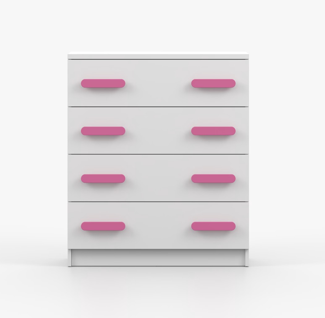 Komoda SMYK je praktický kus nábytku s moderním designem, který se snadno začlení do jakéhokoliv interiéru. Čtyři prostorné zásuvky s barevnými úchytkami poskytují dostatek úložného prostoru. Komoda je vyrobena z kvalitní laminované desky o tloušťce 16 mm, která je odolná proti poškrábání, poškození, vlhkosti a vysokým teplotám. Hrany jsou zakončeny ABS lištou, což zajišťuje jejich odolnost a pevnost.