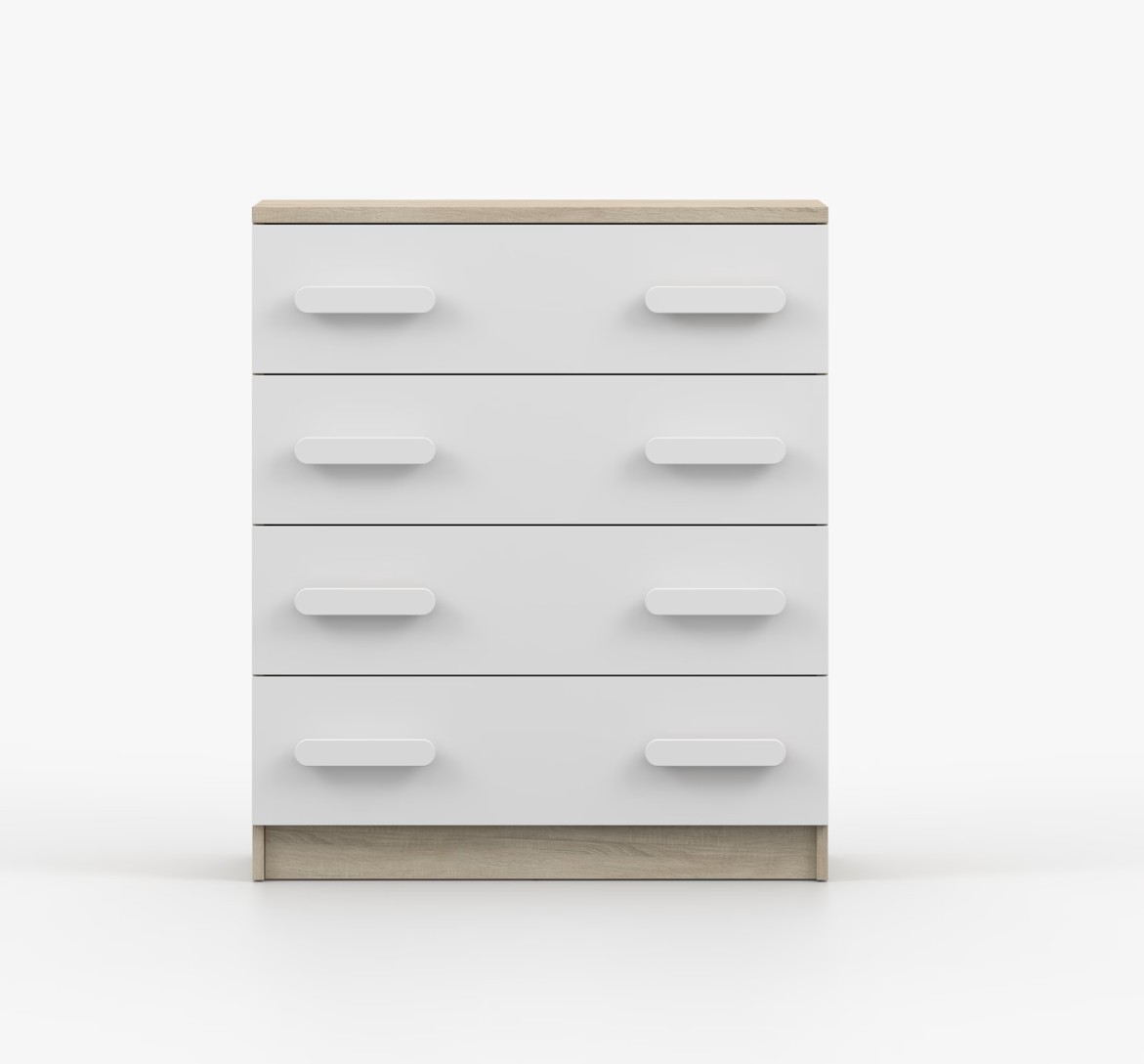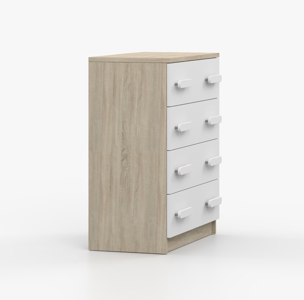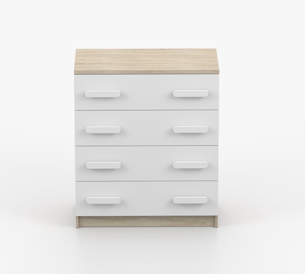 Komoda SMYK je praktický kus nábytku s moderním designem, který se snadno začlení do jakéhokoliv interiéru. Čtyři prostorné zásuvky s barevnými úchytkami poskytují dostatek úložného prostoru. Komoda je vyrobena z kvalitní laminované desky o tloušťce 16 mm, která je odolná proti poškrábání, poškození, vlhkosti a vysokým teplotám. Hrany jsou zakončeny ABS lištou, což zajišťuje jejich odolnost a pevnost.