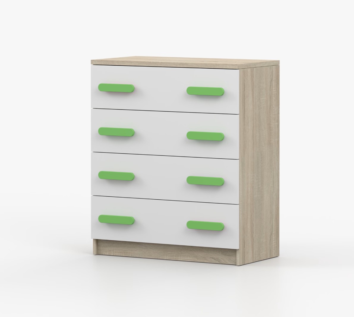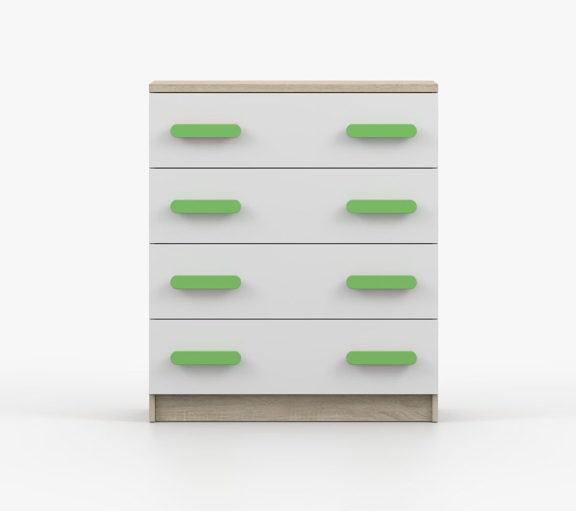 Komoda SMYK je praktický kus nábytku s moderním designem, který se snadno začlení do jakéhokoliv interiéru. Čtyři prostorné zásuvky s barevnými úchytkami poskytují dostatek úložného prostoru. Komoda je vyrobena z kvalitní laminované desky o tloušťce 16 mm, která je odolná proti poškrábání, poškození, vlhkosti a vysokým teplotám. Hrany jsou zakončeny ABS lištou, což zajišťuje jejich odolnost a pevnost.