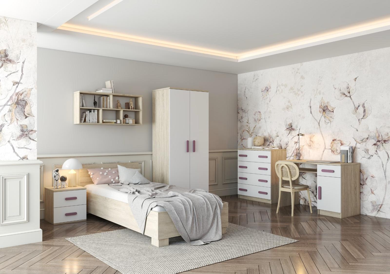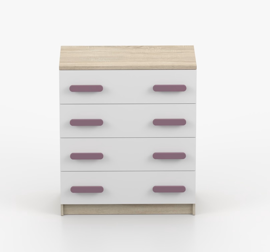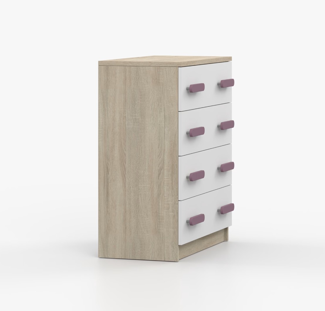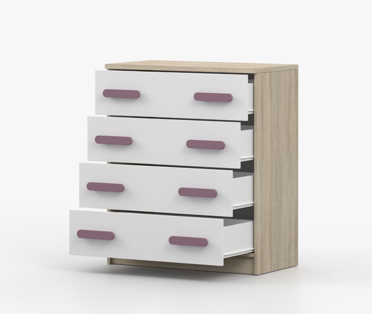 Komoda SMYK je praktický kus nábytku s moderním designem, který se snadno začlení do jakéhokoliv interiéru. Čtyři prostorné zásuvky s barevnými úchytkami poskytují dostatek úložného prostoru. Komoda je vyrobena z kvalitní laminované desky o tloušťce 16 mm, která je odolná proti poškrábání, poškození, vlhkosti a vysokým teplotám. Hrany jsou zakončeny ABS lištou, což zajišťuje jejich odolnost a pevnost.