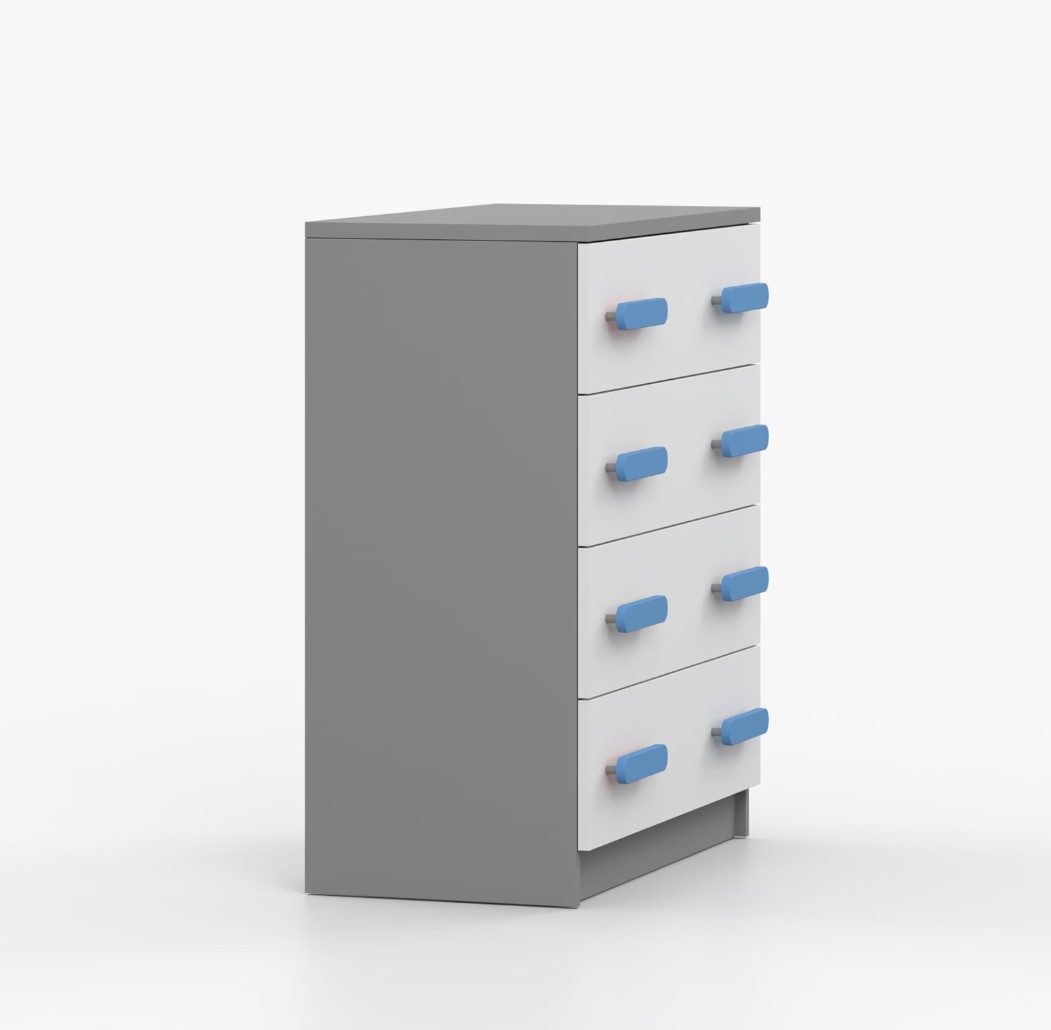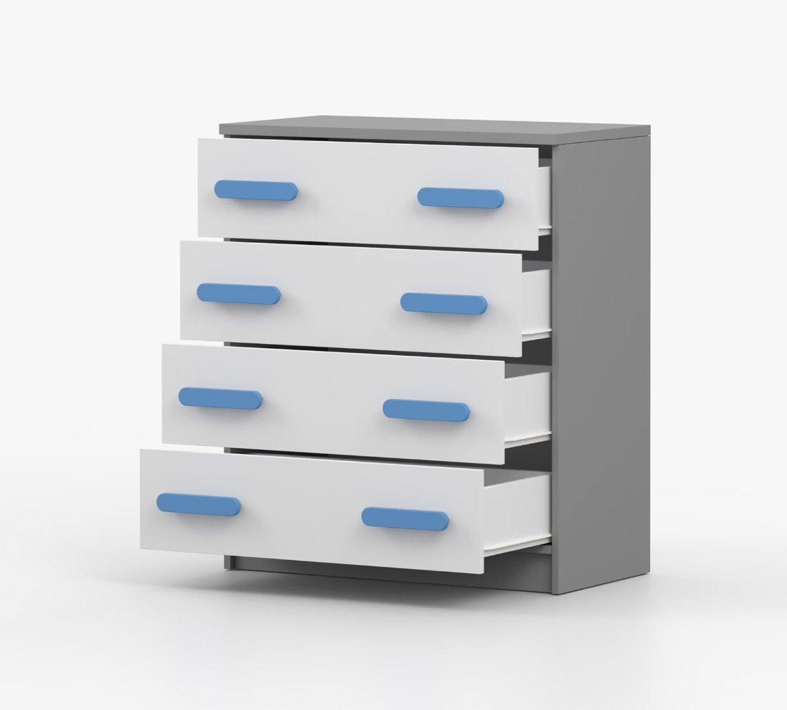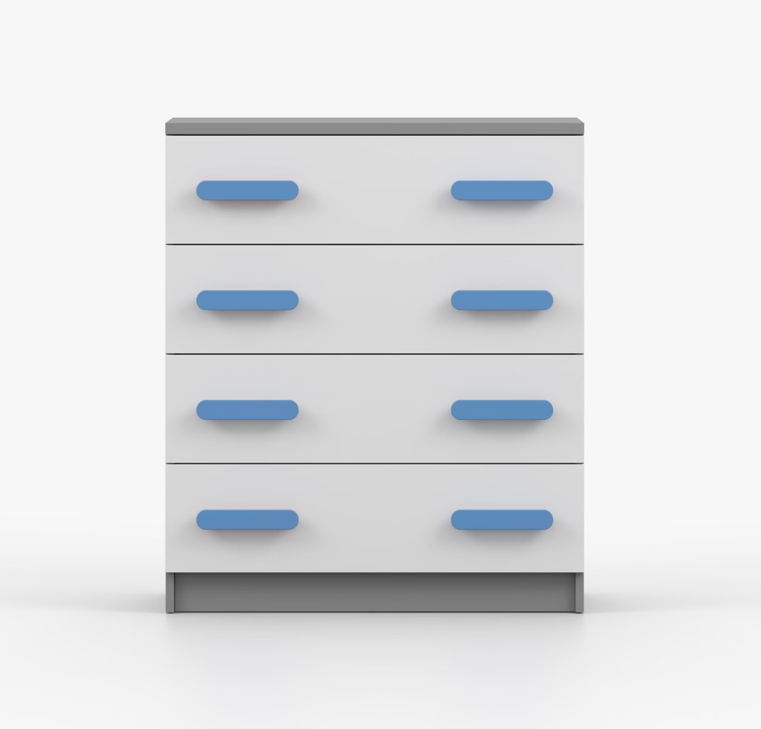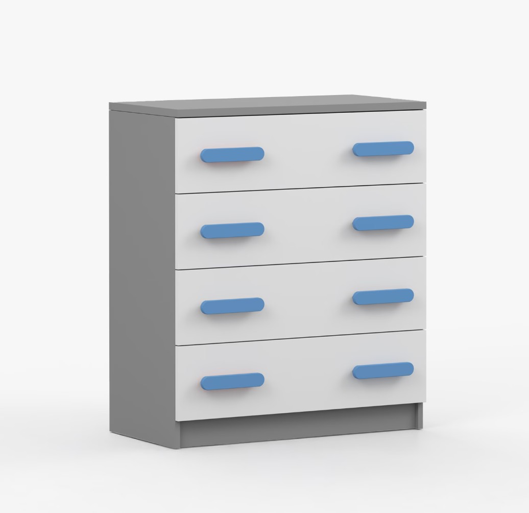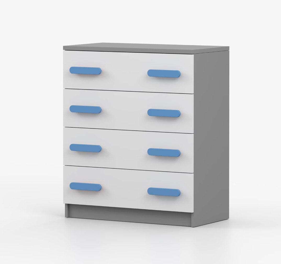 Komoda SMYK je praktický kus nábytku s moderním designem, který se snadno začlení do jakéhokoliv interiéru. Čtyři prostorné zásuvky s barevnými úchytkami poskytují dostatek úložného prostoru. Komoda je vyrobena z kvalitní laminované desky o tloušťce 16 mm, která je odolná proti poškrábání, poškození, vlhkosti a vysokým teplotám. Hrany jsou zakončeny ABS lištou, což zajišťuje jejich odolnost a pevnost.
