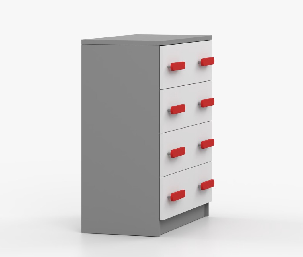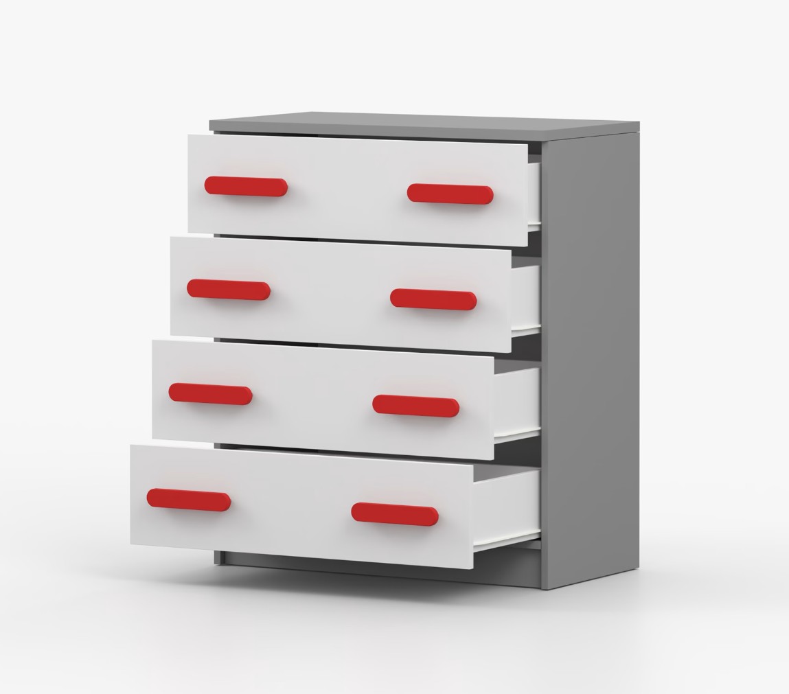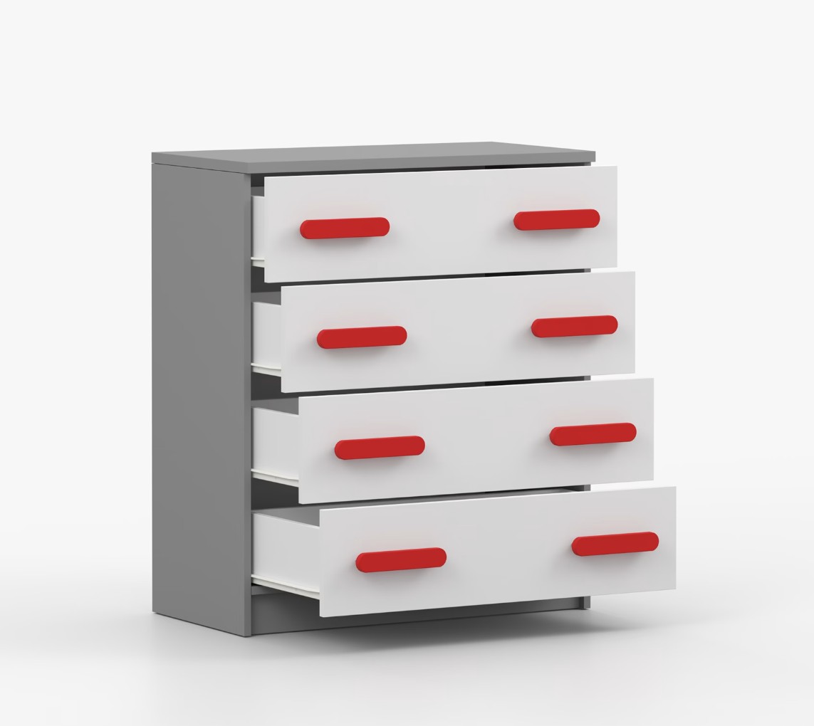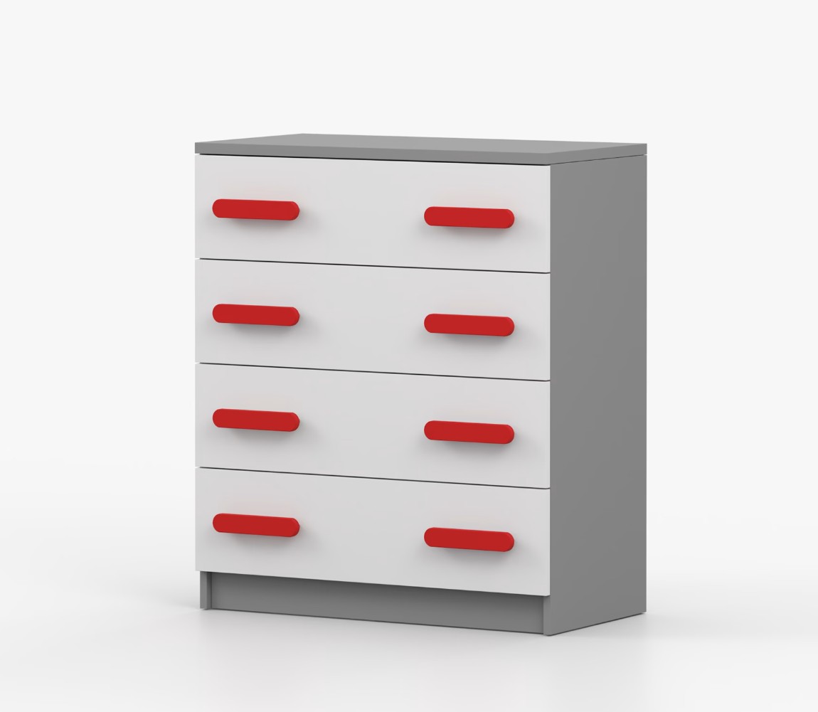 Komoda SMYK je praktický kus nábytku s moderním designem, který se snadno začlení do jakéhokoliv interiéru. Čtyři prostorné zásuvky s barevnými úchytkami poskytují dostatek úložného prostoru. Komoda je vyrobena z kvalitní laminované desky o tloušťce 16 mm, která je odolná proti poškrábání, poškození, vlhkosti a vysokým teplotám. Hrany jsou zakončeny ABS lištou, což zajišťuje jejich odolnost a pevnost.