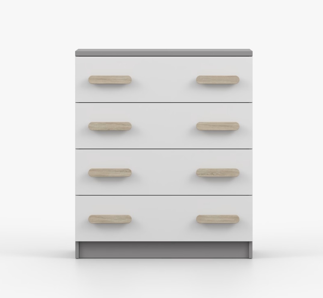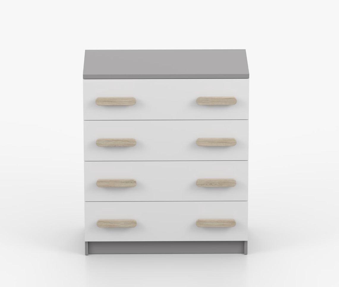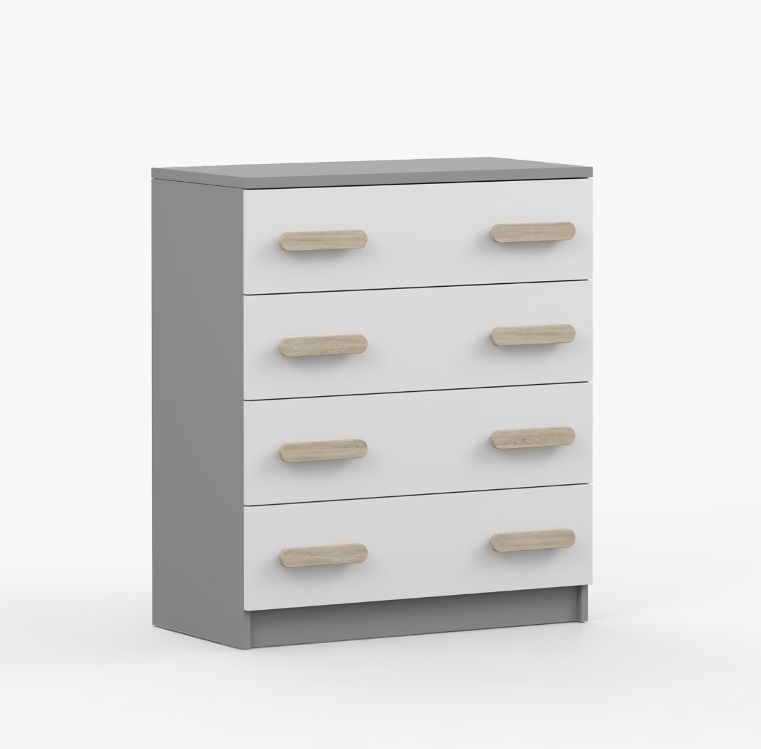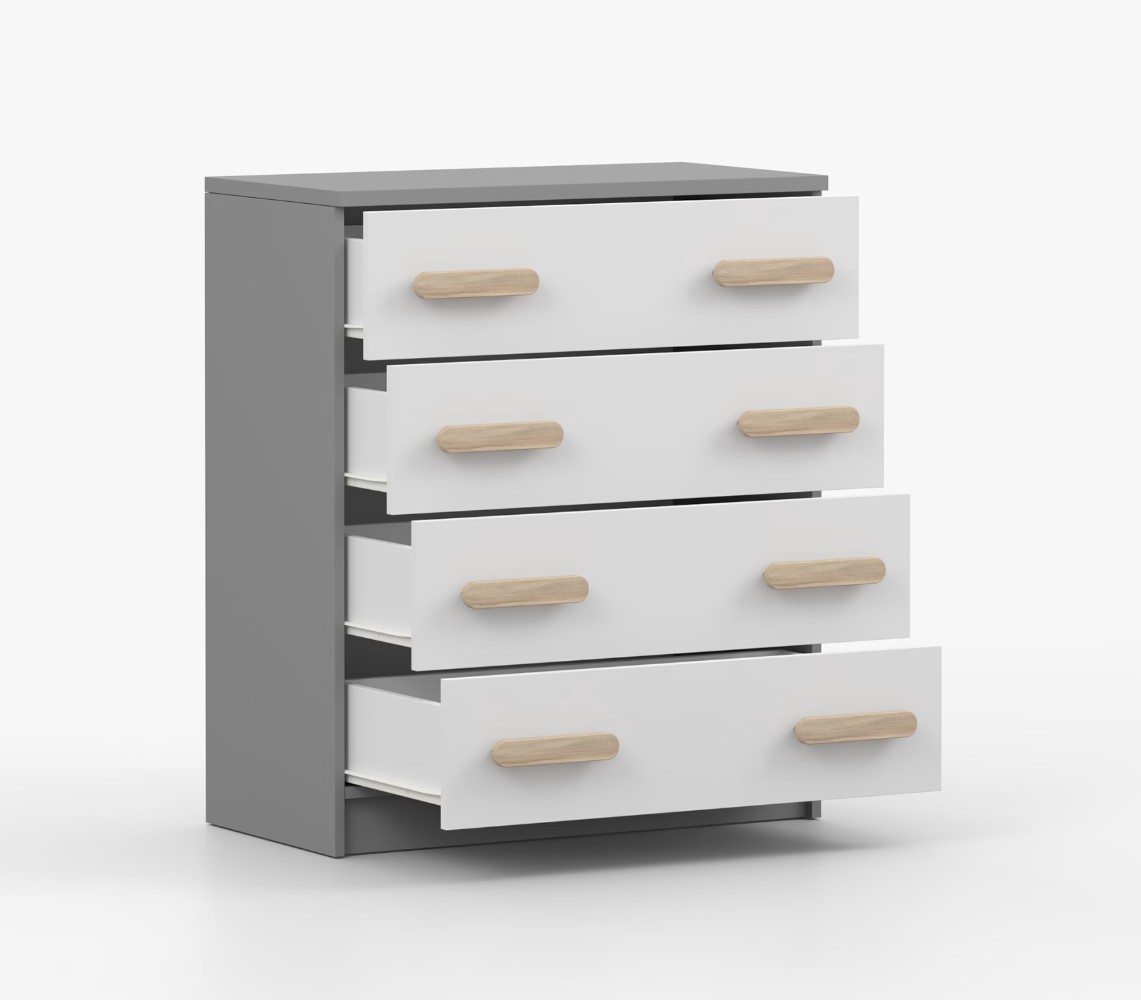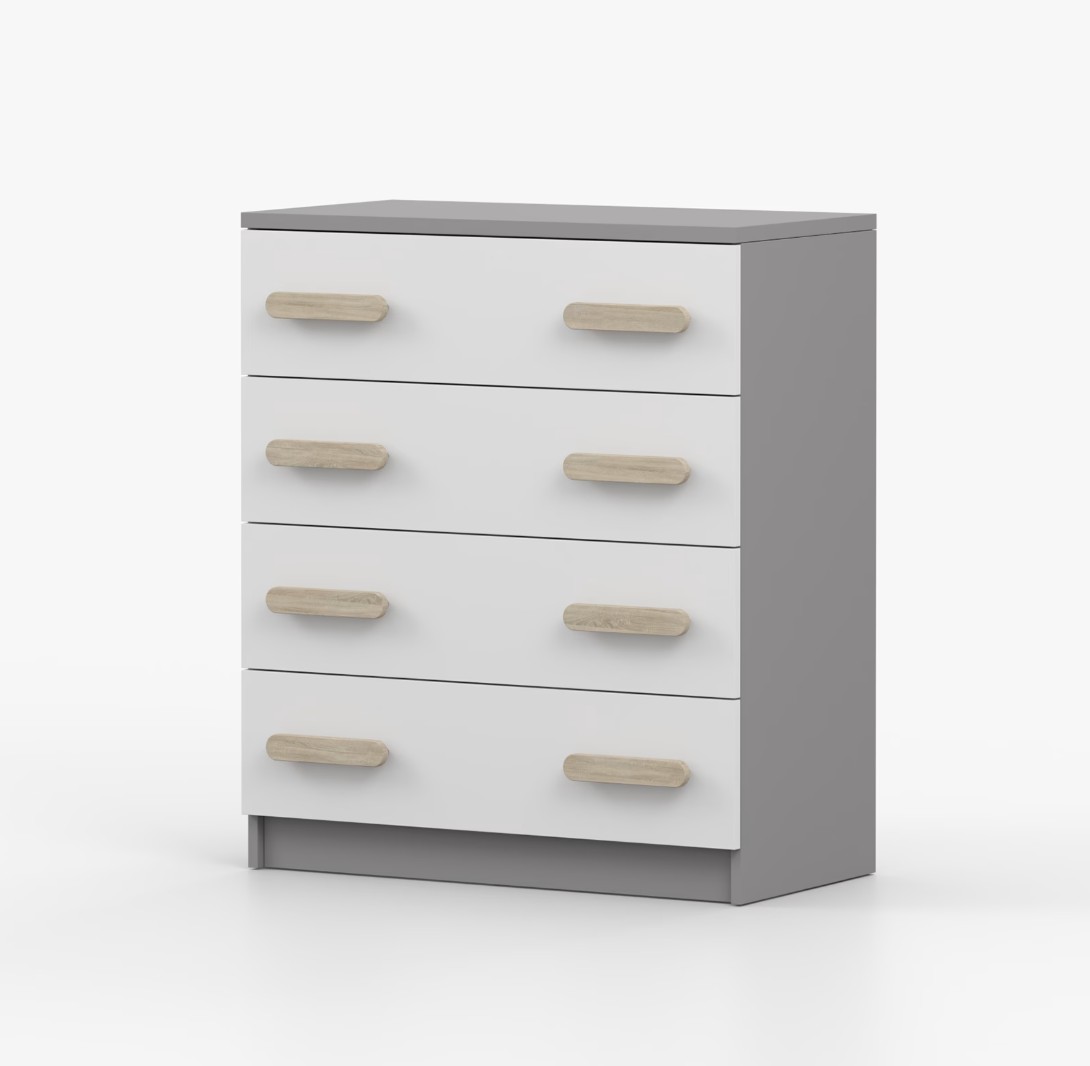 Komoda SMYK je praktický kus nábytku s moderním designem, který se snadno začlení do jakéhokoliv interiéru. Čtyři prostorné zásuvky s barevnými úchytkami poskytují dostatek úložného prostoru. Komoda je vyrobena z kvalitní laminované desky o tloušťce 16 mm, která je odolná proti poškrábání, poškození, vlhkosti a vysokým teplotám. Hrany jsou zakončeny ABS lištou, což zajišťuje jejich odolnost a pevnost.