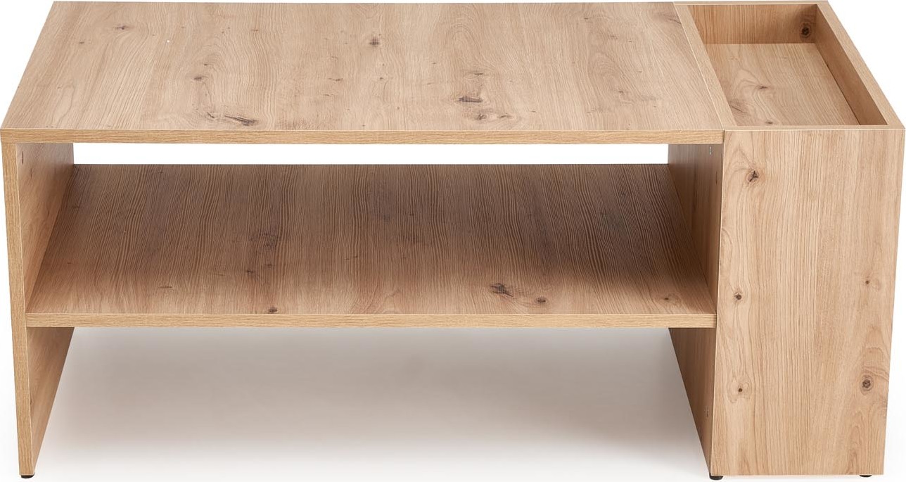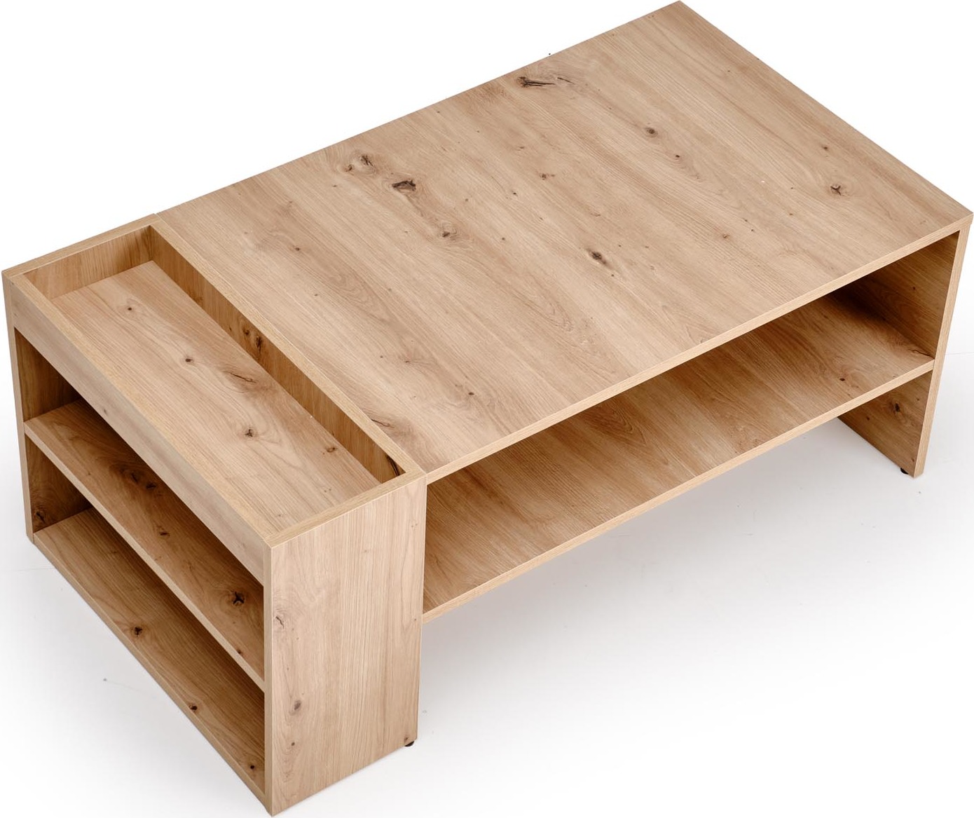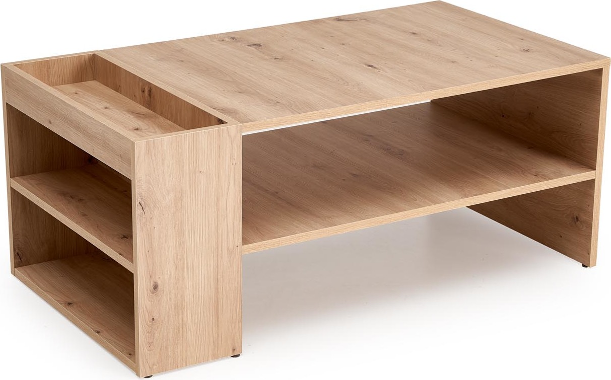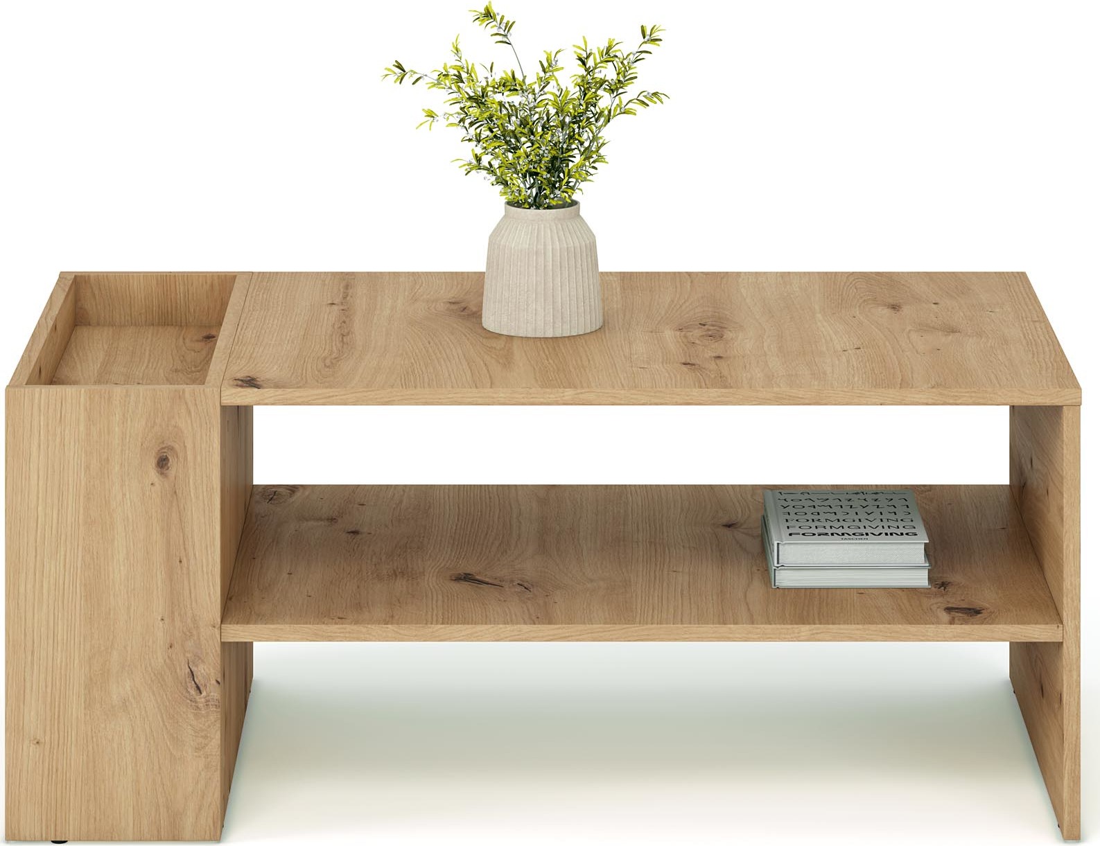 Jednoduchý a elegantní konferenční stolek v moderním stylu se hodí do každého interiéru. Tento konferenční stolek vytvoří dostatečně veliký odkládací prostor. Stolek je vyroben z laminované dřevotřískové desky, která zaručuje odolnost a pevnost. Okládací prostor je ve formě horní desky, police a regálu na jedné straně stolku.