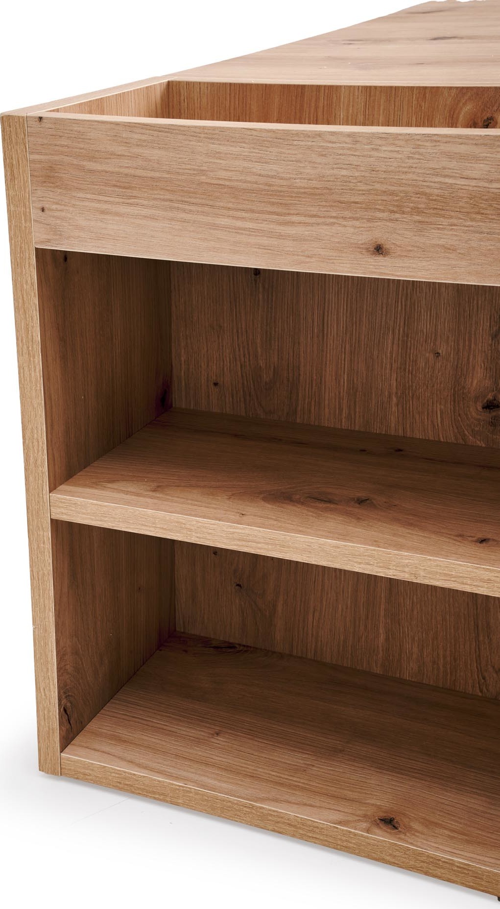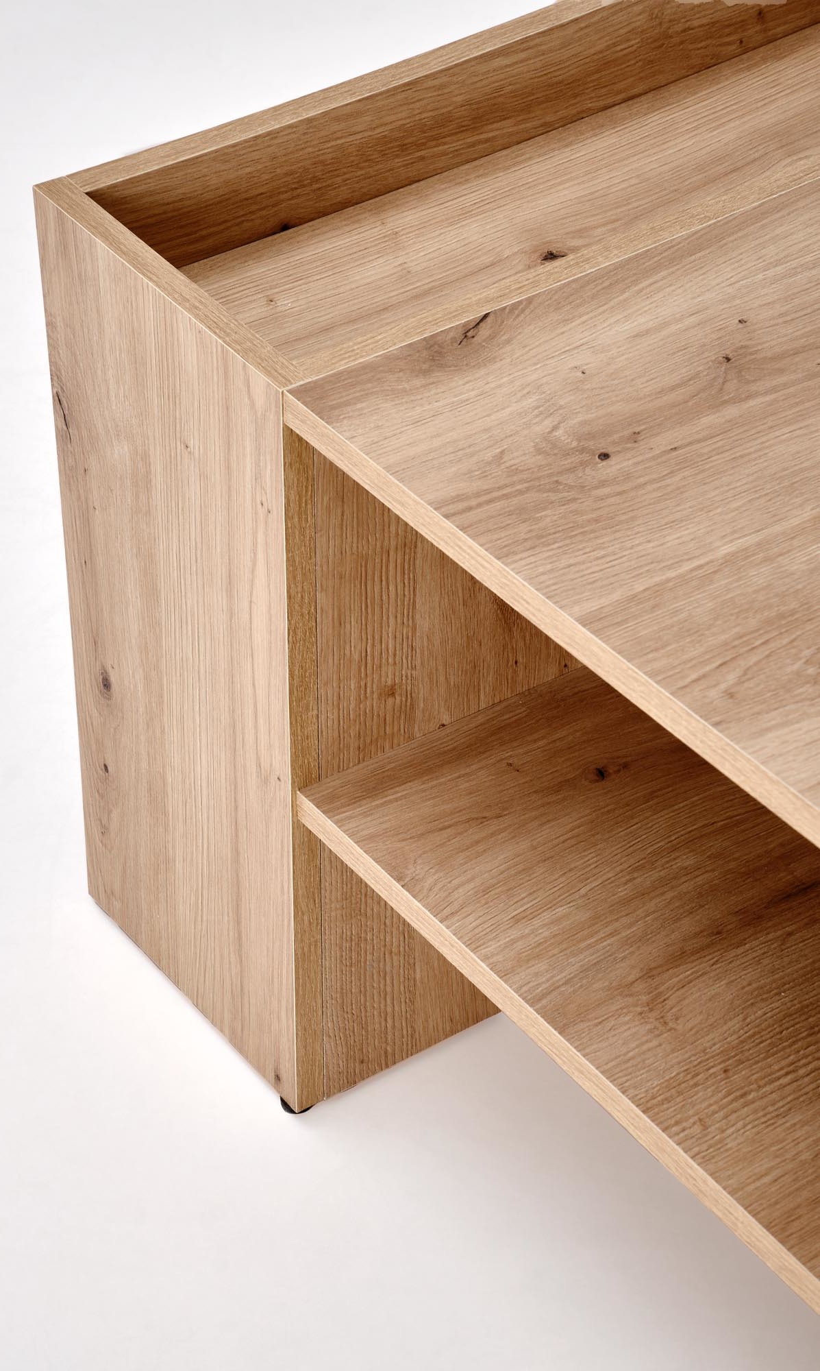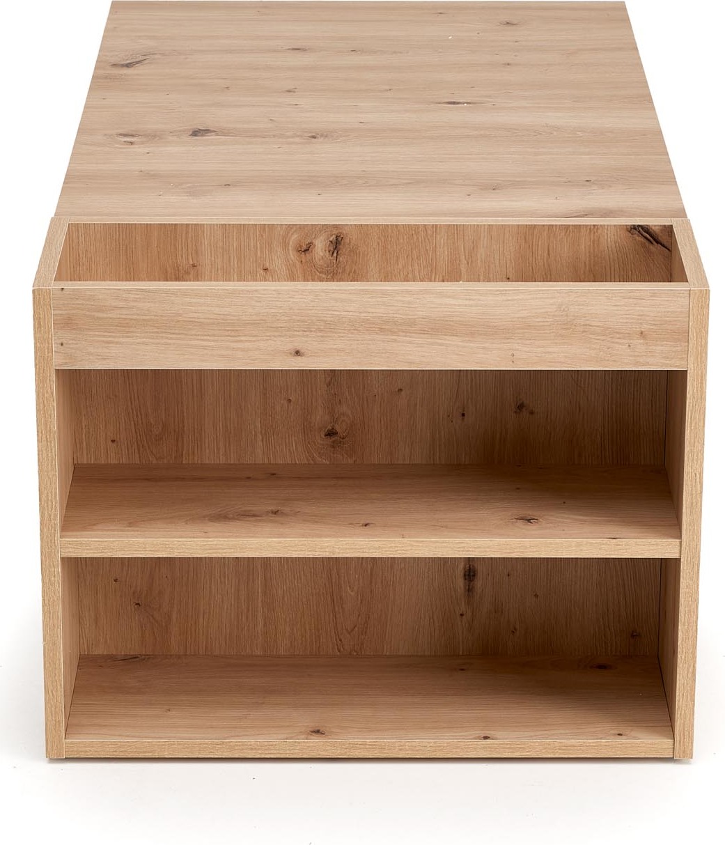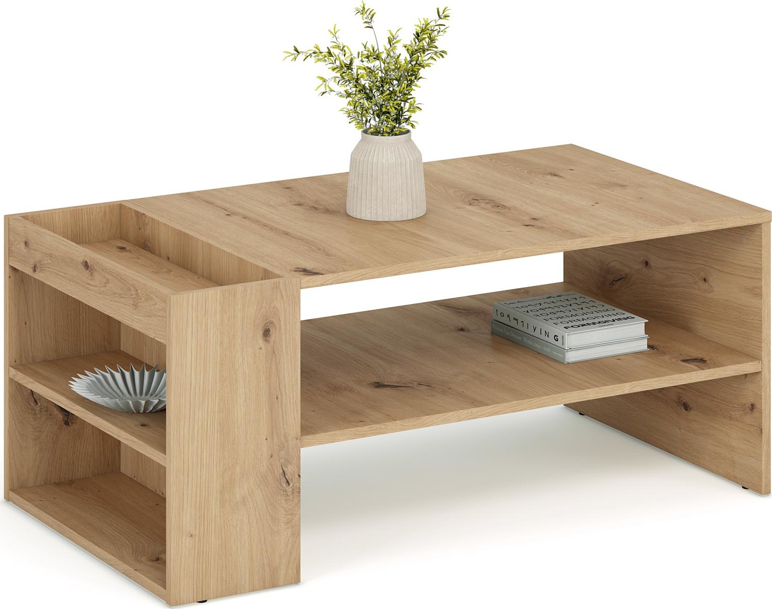Jednoduchý a elegantní konferenční stolek v moderním stylu se hodí do každého interiéru. Tento konferenční stolek vytvoří dostatečně veliký odkládací prostor. Stolek je vyroben z laminované dřevotřískové desky, která zaručuje odolnost a pevnost. Okládací prostor je ve formě horní desky, police a regálu na jedné straně stolku.