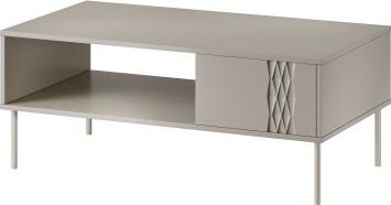 Konferenčí stolek, který zaujme svým neotřelým designem. Stolek kombinuje nadčasový vzhled s kovovými nožkami a profilovanou částí čela, které mu dodává moderní vzhled. Korpus je vyroben z 16mm lamino desky v kombinaci s 16mm MDF deskou v profilované části. Kovové nohy s výškou 15 cm jsou nejen estetické, ale i pevné. Dovolují bezproblémový úklid i pod stolkem.