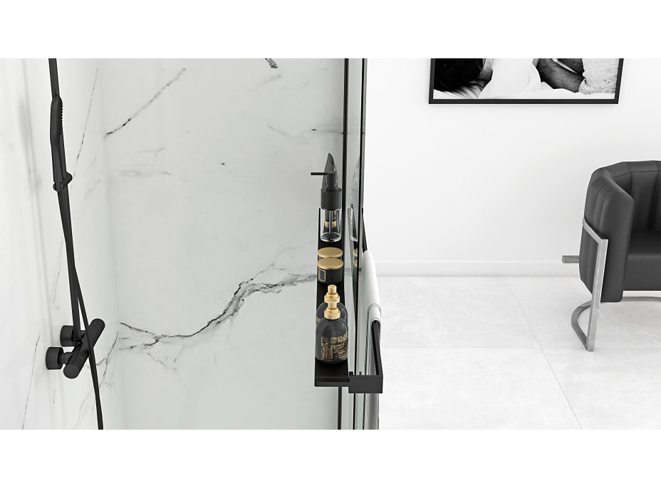 Zástěna je vybavena hliníkovou policí EVO v černé matné barvě, která nabídne z jedné strany prostornou polici na odkládání hygienických potřeb a z druhé strany praktický jednoramenný věšák na přehození osušky.