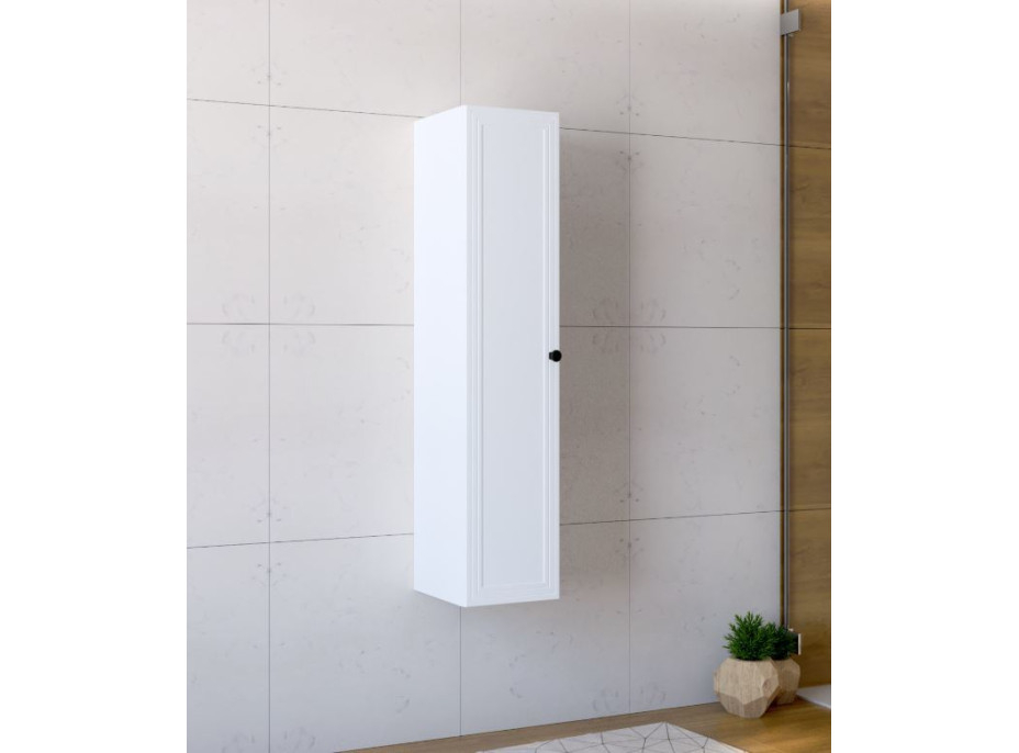Elegantní vysoká závěsná skříňka Toreto bude skvěle sloužit pro ukládání osušek, ručníků nebo kosmetiky. Korpus skříňky je vyrobený z laminované nábytkové desky v bílé matné barvě. Dvířka jsou vyrobena z laminované MDF desky. Díky ozdobným dvířkům a kovovému úchytu v černé barvě se skříňka skvěle hodí do koupelen zařízených v tradičním stylu. Skříňka je osazena soft close panty, které zaručují snadné používání.