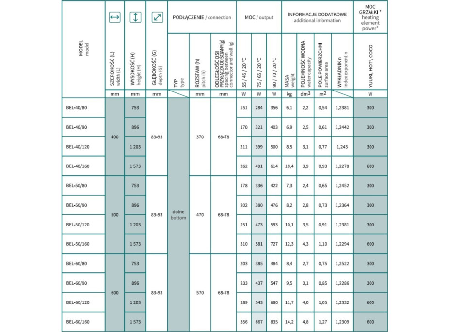 - Rozměr radiátoru: 400 × 896 mm, výkon 321 W, 400 × 1203 mm, výkon 399 W, 400 × 1573 mm, výkon 491 W, 500 × 753 mm, výkon 336 W, 500 × 896 mm, výkon 380 W, 500 × 1203 mm, výkon 473 W, 500 × 1573 mm, výkon 581 W, 600 × 753 mm, výkon 385 W, 600 × 896 mm, výkon 437 W, 600 × 1203 mm, výkon 543 W, 600 × 1573 mm, výkon 667 W, 400 × 753 mm, výkon 284 W