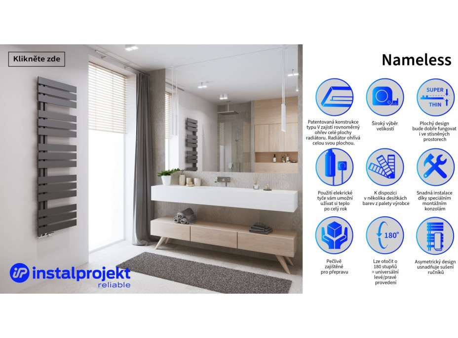 Radiátor do koupelny už dávno není nudný bílý žebřík. To ostatně ukazuje radiátor NAMELESS, který nabízí svěží design. Díky své konstrukci se na koupelnový radiátor snadno věší ručníky. Ty rychle usychají. Vytápění je možné pomocí elektrické topné tyče či klasickým oběhovým čerpadlem.