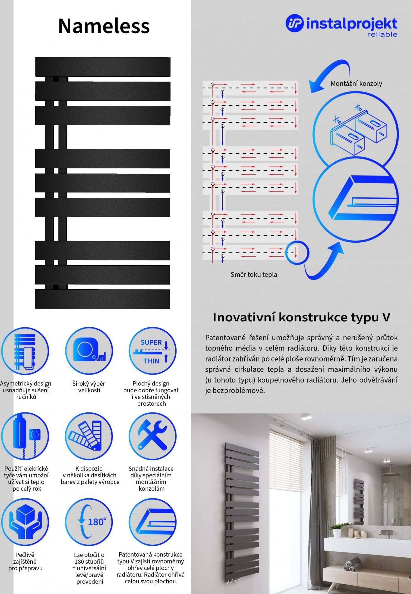 Radiátor do koupelny už dávno není nudný bílý žebřík. To ostatně ukazuje radiátor NAMELESS, který nabízí svěží design. Díky své konstrukci se na koupelnový radiátor snadno věší ručníky. Ty rychle usychají. Vytápění je možné pomocí elektrické topné tyče či klasickým oběhovým čerpadlem.