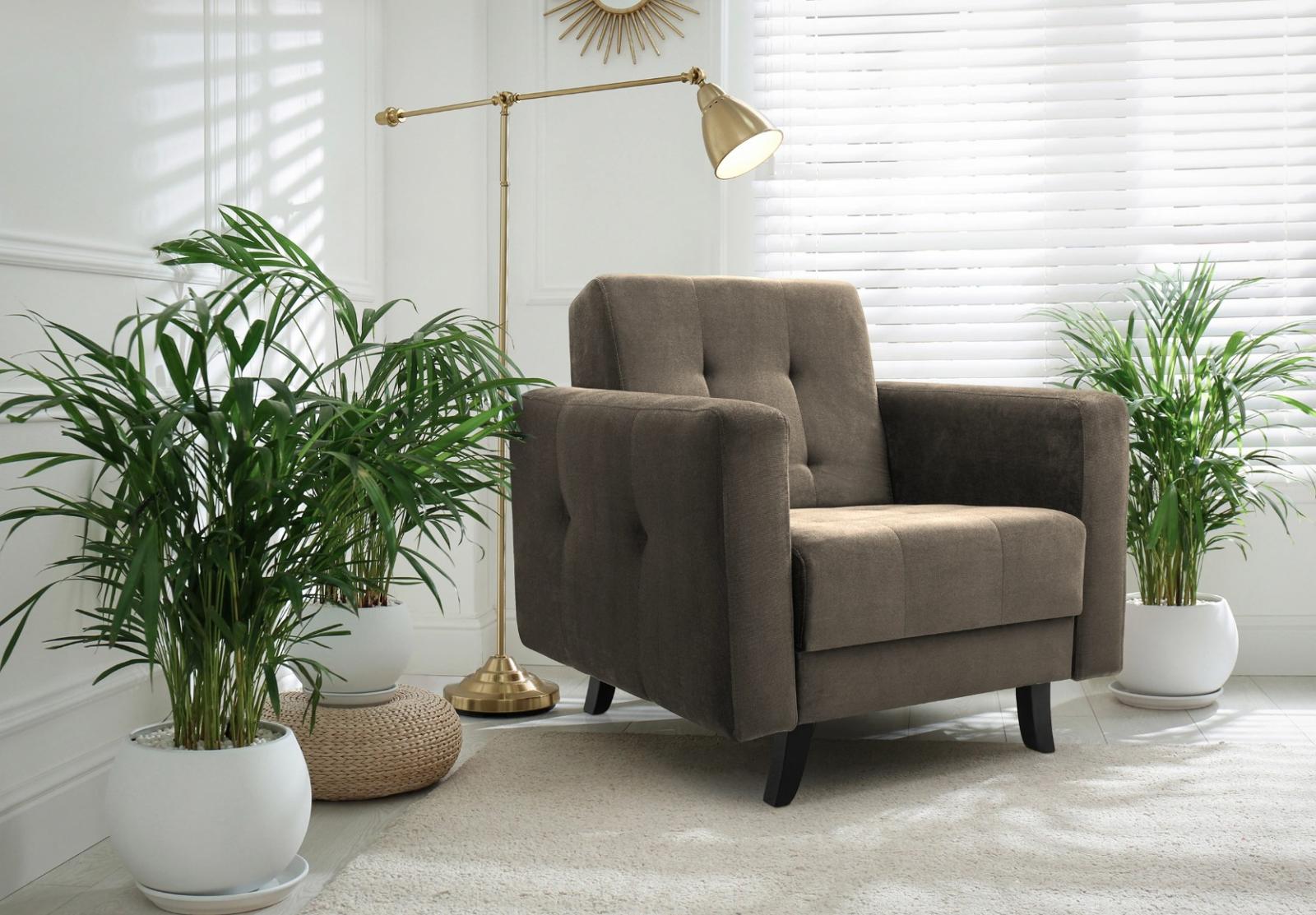 Křeslo LISABON skvěle zapadne do všech interiérů. Dekorativním prvkem jsou dřevěné černé nohy. Zadní strana je potažená látkou, což umožňuje jeho umístění kdekoliv v místnosti.