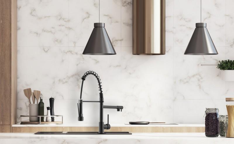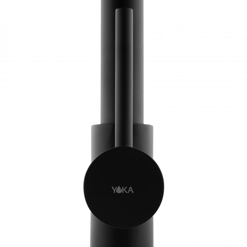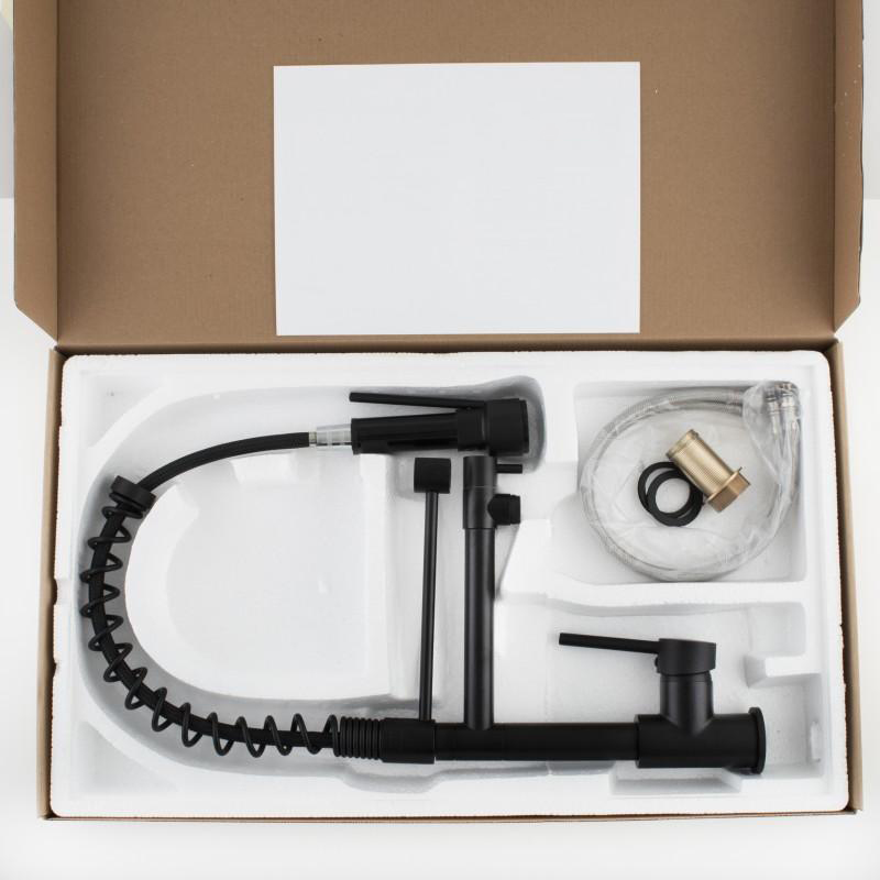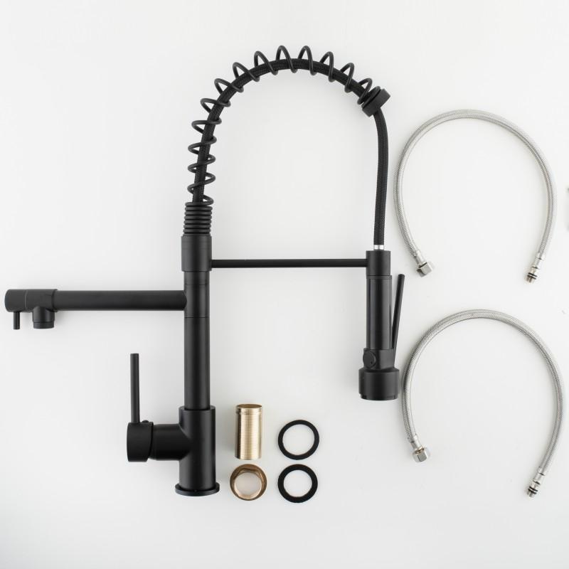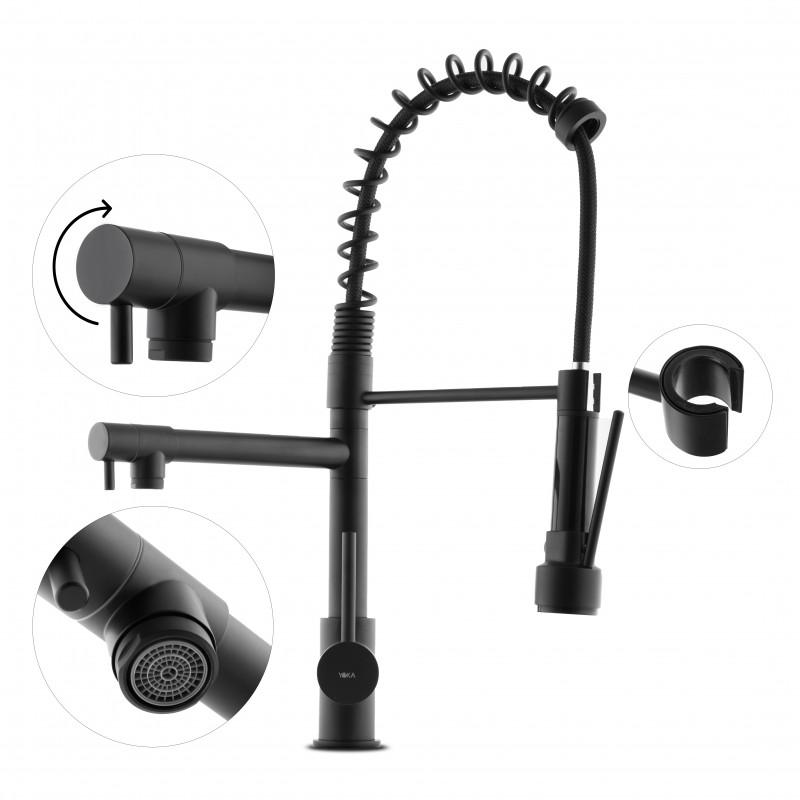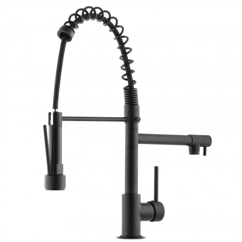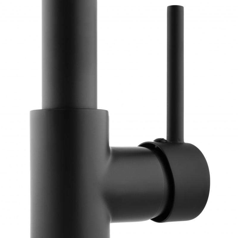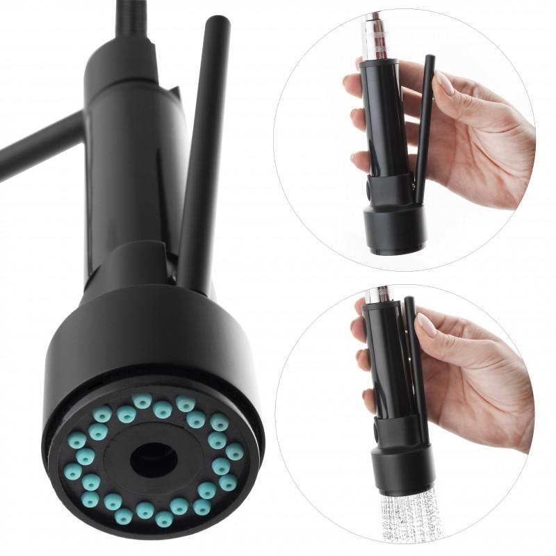 Tělo moderní vodovodní baterie je vyrobeno z mosazi s černou matnou povrchovou úpravou. Tato technika chrání baterii před poškrábáním a korozí. Baterie se hodí do každé kuchyně a lze ji bez problému usadit do otvoru v desce i dřezu.