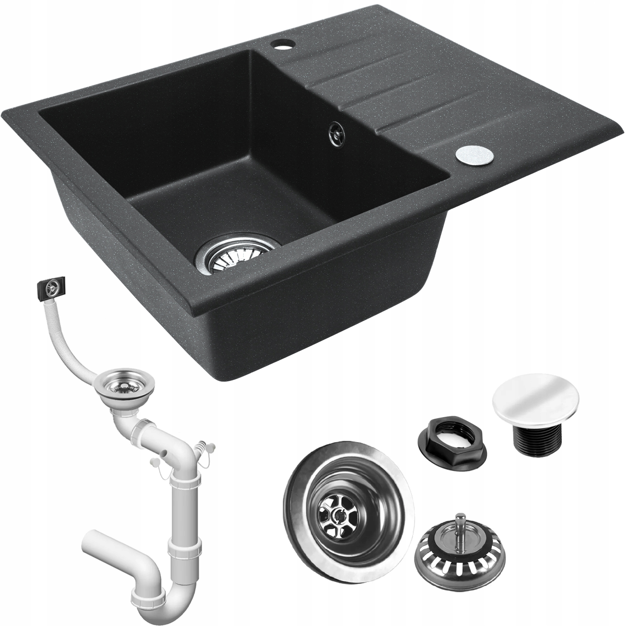 Sada obsahuje sifon, na který lze připojit odpad z myčky/pračky, s uzavíratelnou zátkou se sítkem. Ve dřezu jsou připraveny dva otvory, které využijete například na baterii a dávkovač mycího prostředku. Pokud ale využijete pouze jeden otvor, tak je součástí balení zátka pro vyplnění druhého otvoru.