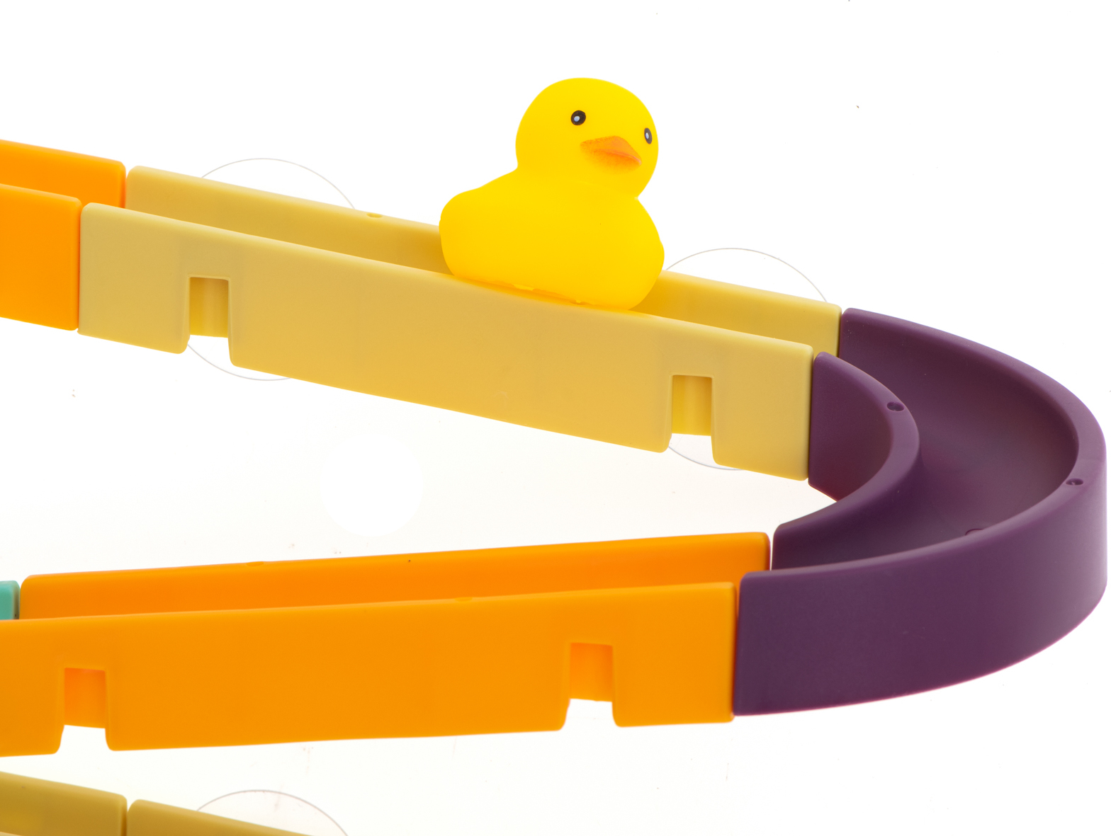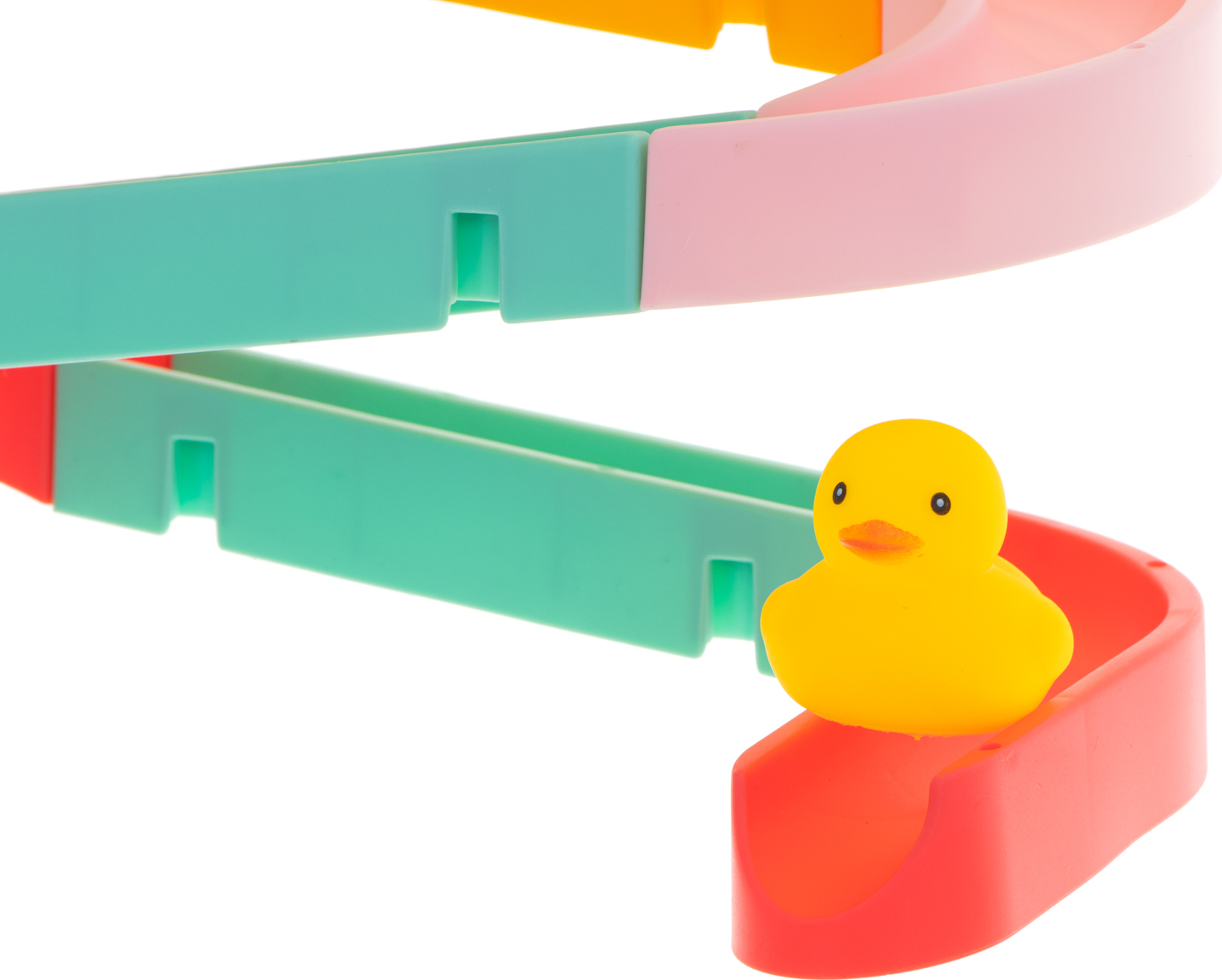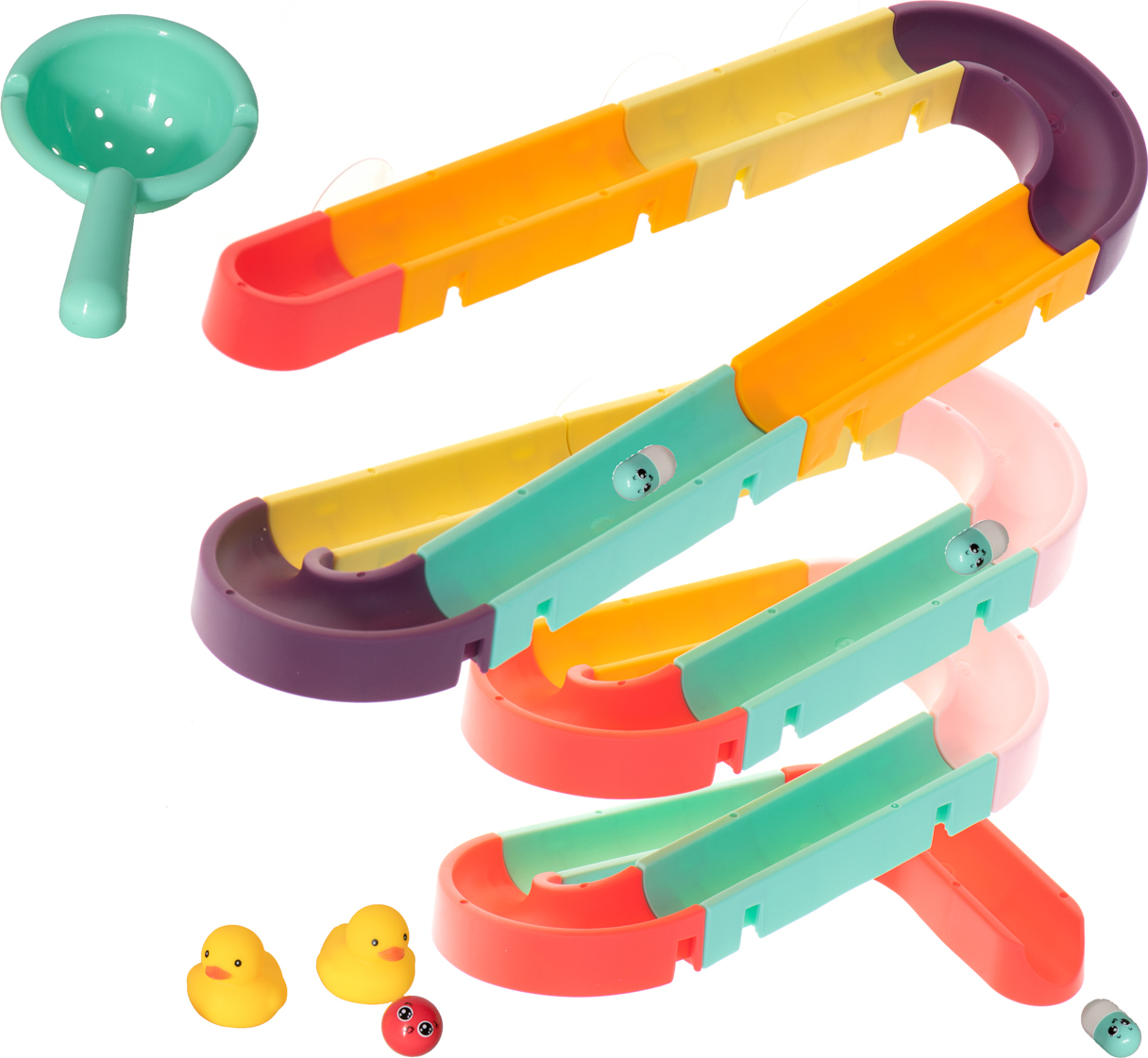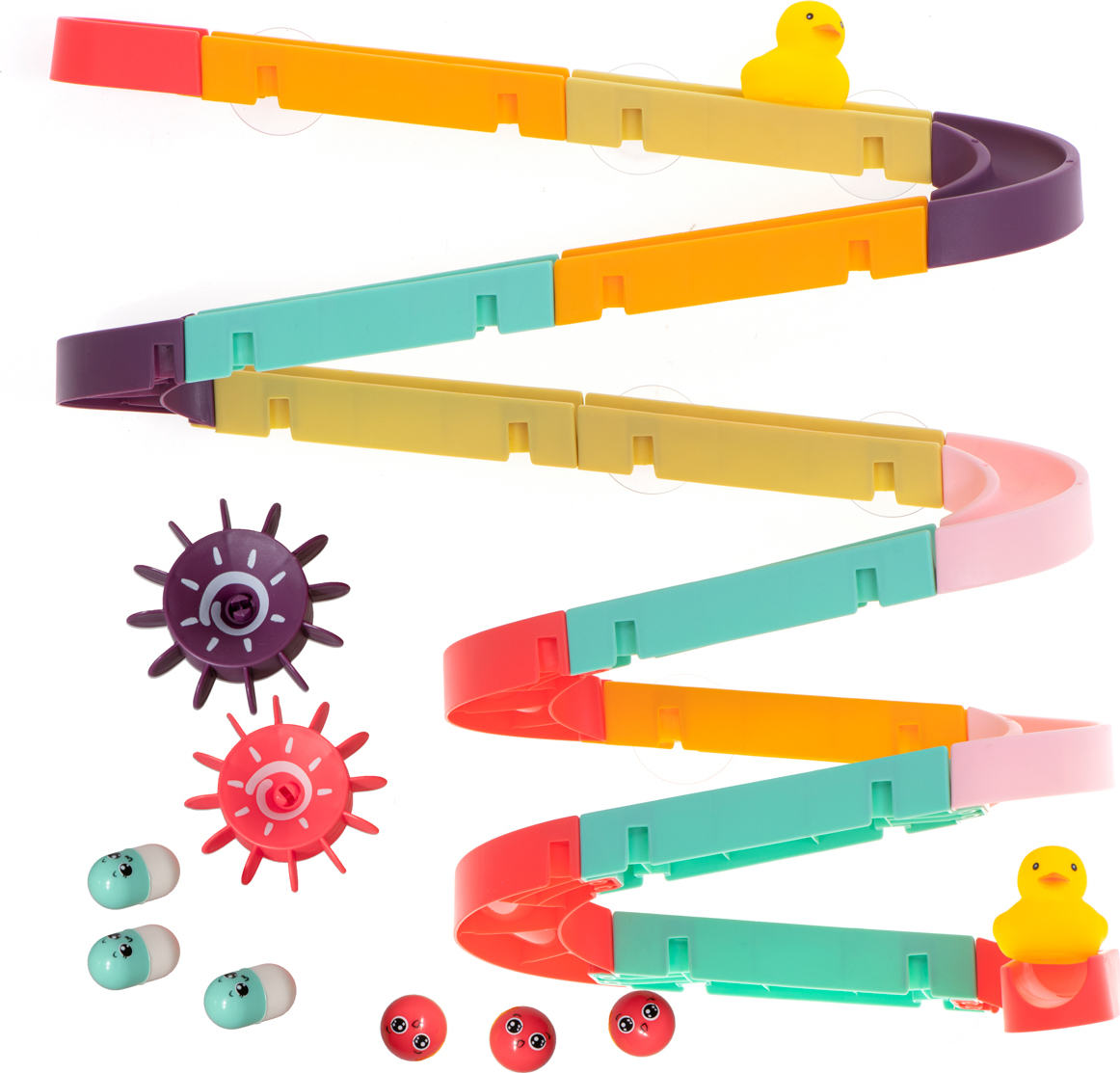 Báječně barevná kuličková dráha pro fazole a míčky bude nedílnou součástí každé koupele. Rozvrhněte trať a zjistěte, která fazole bude rychlejší a lépe zvládne trať. Sada obsahuje vše, co potřebujete pro fanatickou zábavu. Dvě roztomilé žluté gumové kachničky s pískátky vám zpestří hraní. Hračka je dodávána s přísavkami, které usnadňují připevnění dráhy k obkladu nebo vaně.