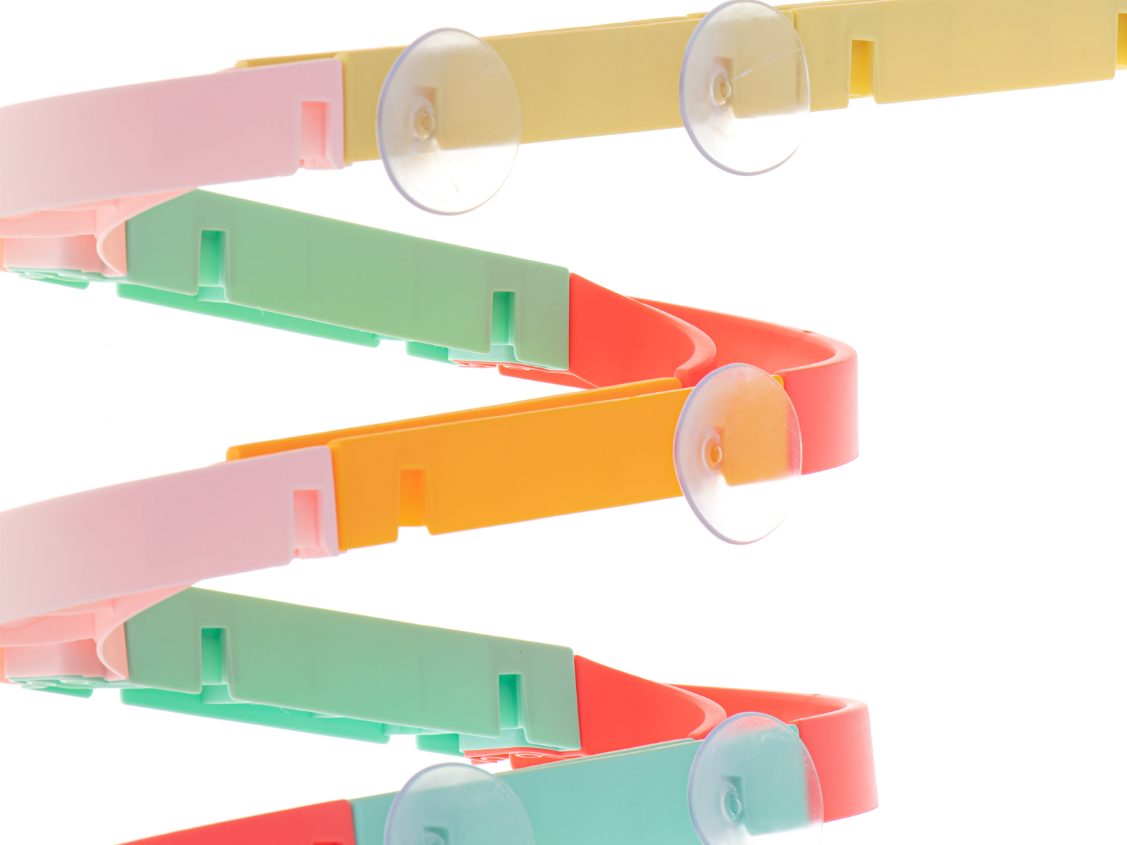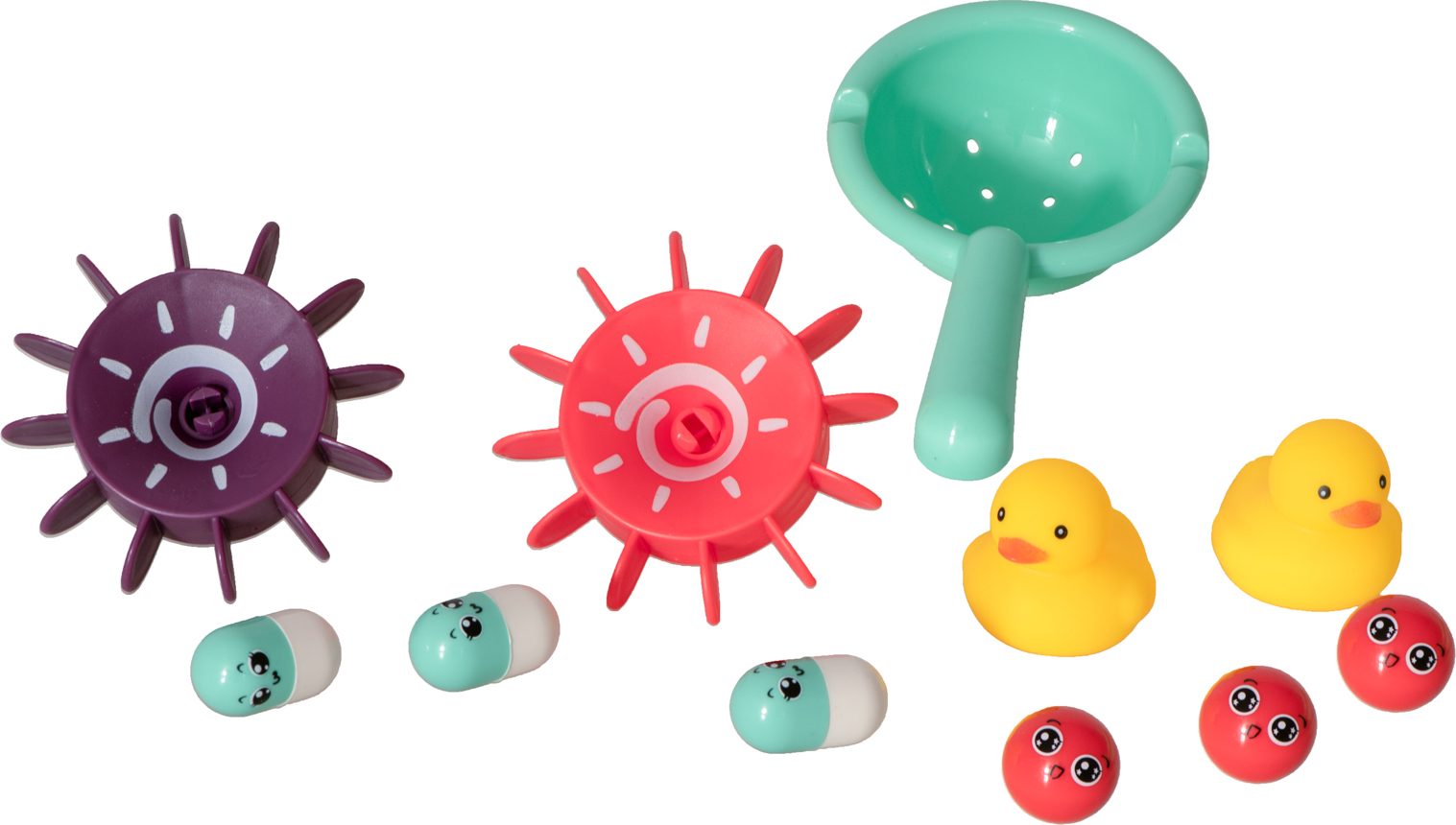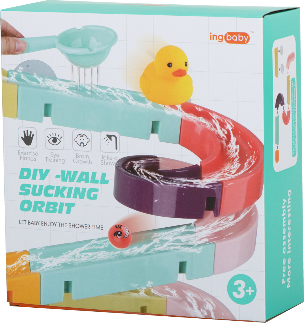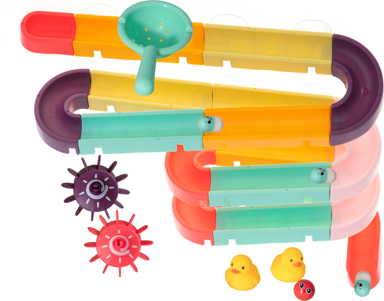 Báječně barevná kuličková dráha pro fazole a míčky bude nedílnou součástí každé koupele. Rozvrhněte trať a zjistěte, která fazole bude rychlejší a lépe zvládne trať. Sada obsahuje vše, co potřebujete pro fanatickou zábavu. Dvě roztomilé žluté gumové kachničky s pískátky vám zpestří hraní. Hračka je dodávána s přísavkami, které usnadňují připevnění dráhy k obkladu nebo vaně.