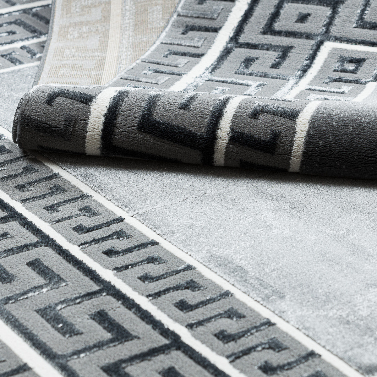 Kusový koberec Allure 1960 grey je ukázkou moderní elegance v tmavém provedení. Grafitově šedý podklad doplňuje výrazná bordura s motivem řeckého klíče v kontrastní černo-bílé kombinaci. Tento design působí odvážně, noblesně a dokáže dodat interiéru sofistikovanou atmosféru s nádechem luxusu. Koberec je vyrobený ze směsi 60 % polypropylenu a 40 % polyesteru, což zajišťuje jeho odolnost i příjemnou hebkost. Dvě výšky vlasu vytvářejí jemný 3D efekt, který podtrhuje strukturu bordury i detailní vzor. Certifikace OEKO-TEX garantuje zdravotní nezávadnost. Výška vlasu: 10 mm.