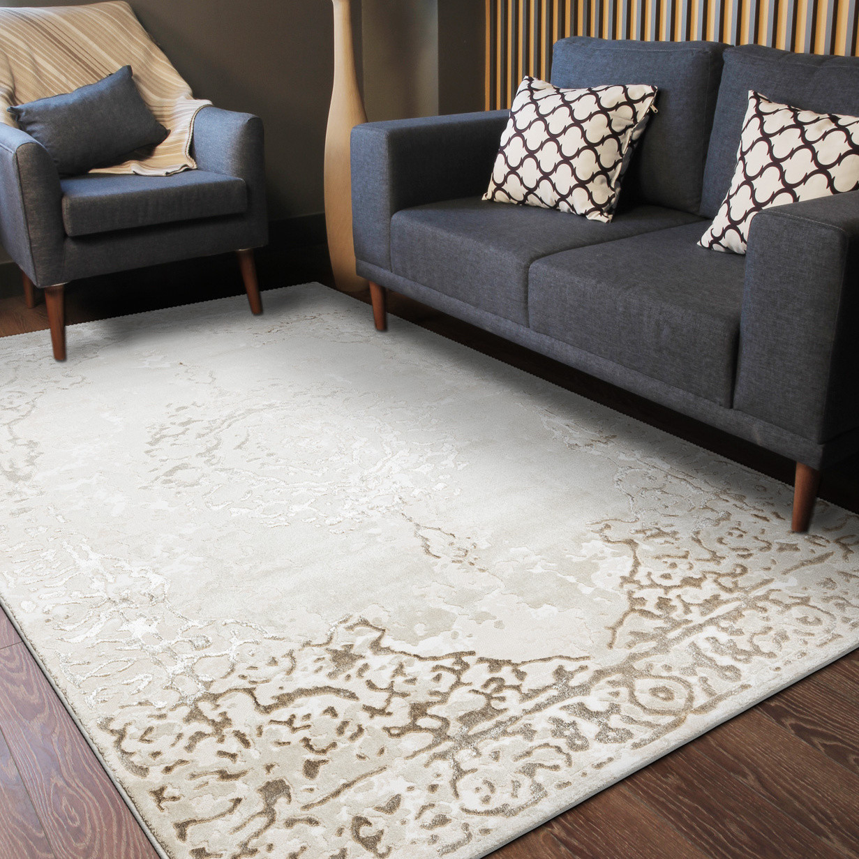 Koberec Allure 1961 cream/gold září svou decentní elegancí a přirozenou harmonií. Jemný béžový podklad v kombinaci s ornamentálním vzorem v hnědých tónech působí teple a útulně, takže dokáže okamžitě zútulnit každý interiér. Tradiční motiv je zpracovaný v moderním duchu a vytváří dokonalou rovnováhu mezi klasikou a současným designem. Vyrobený je ze směsi 60 % polypropylenu a 40 % polyesteru, což mu dodává odolnost a zároveň příjemně měkký povrch. Dvě výšky vlasu vytvářejí jemný 3D efekt, který podtrhuje reliéfní vzor a dodává koberci hloubku i luxusní vzhled. Díky certifikaci OEKO-TEX je zcela bezpečný pro alergiky i děti a hodí se i k použití s podlahovým vytápěním. Allure 1961 se skvěle vyjímá v obývacím pokoji, kde vnese pocit tepla a pohodlí, v ložnici, kde podpoří klidnou atmosféru, i v pracovně, kde dodá prostorům nádech prestiže. Výška vlasu: 10 mm.