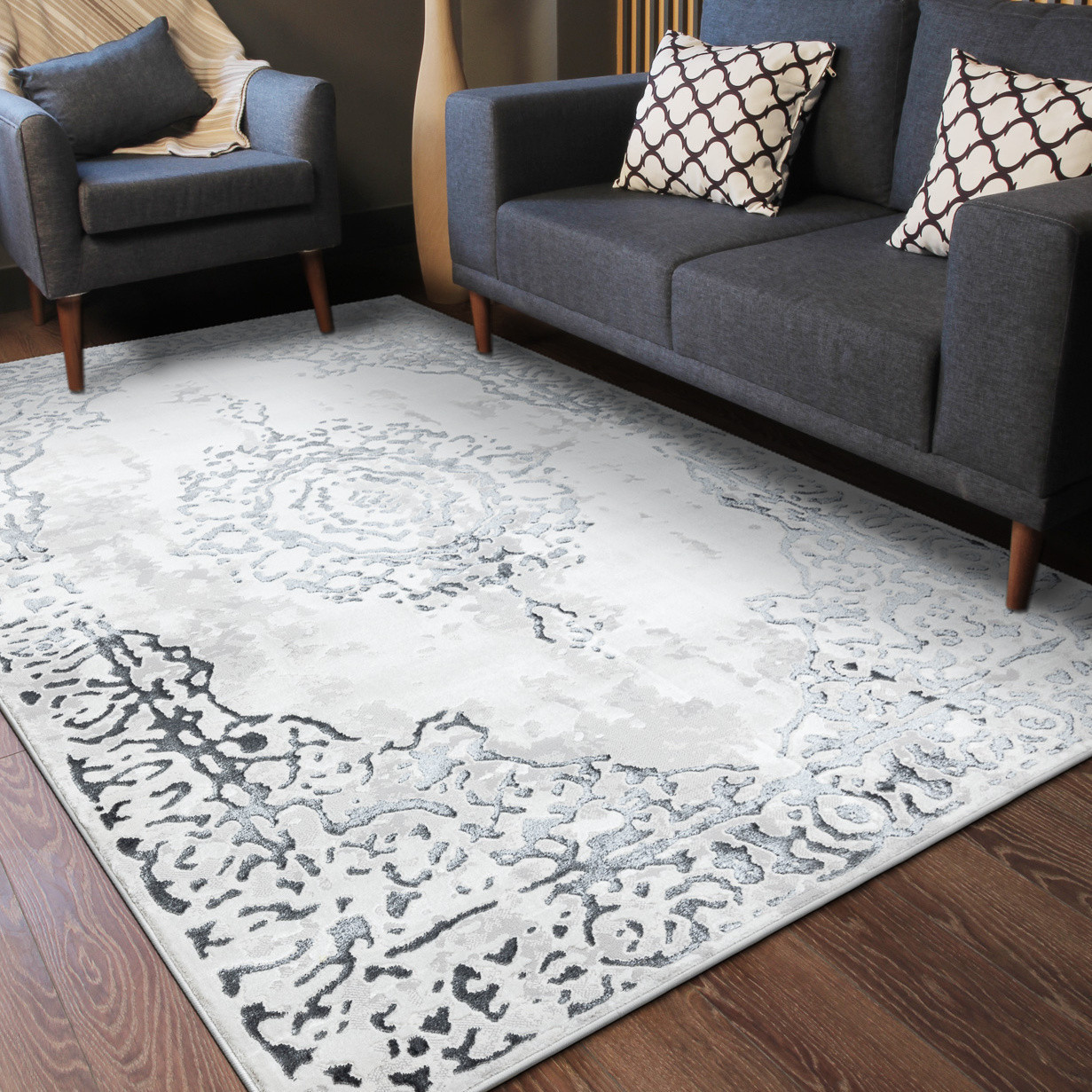 Kusový koberec Allure 1961 white/grey je ztělesněním elegance v moderním pojetí orientálního stylu. Na světlém podkladu vystupuje dekorativní středový motiv v šedo-černém provedení, který působí decentně a přesto výrazně. Celý vzor připomíná klasické orientální ornamenty, ovšem zpracované minimalističtějším, současným způsobem. Koberec je vyrobený ze směsi 60 % polypropylenu a 40 % polyesteru, takže je odolný, měkký a příjemný na dotek. Dvě výšky vlasu vytvářejí jemný 3D efekt, který zvýrazňuje reliéfní kresbu a dodává koberci hloubku i vizuální zajímavost. Díky certifikaci OEKO-TEX je naprosto bezpečný pro domácnosti s dětmi či alergiky. Výška vlasu: 10 mm.