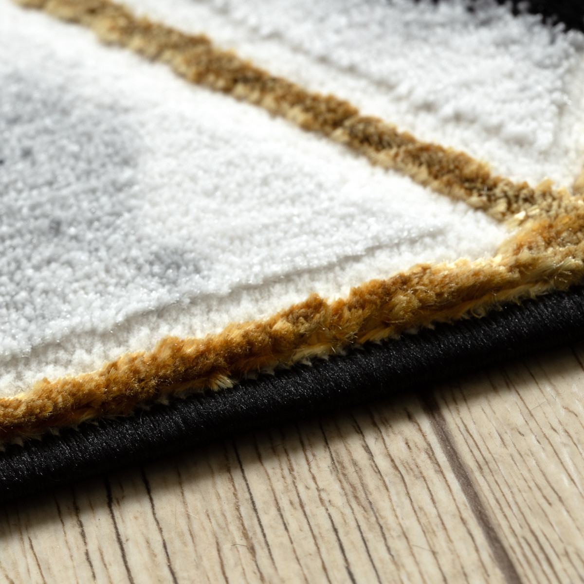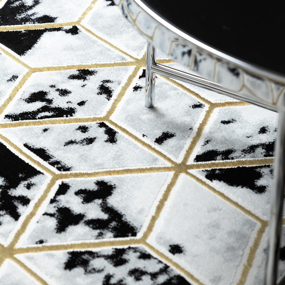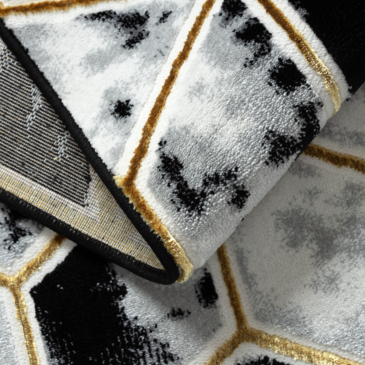 Koberec Allure 1966 black/gold přináší do interiéru odvážný geometrický design s iluzí trojrozměrnosti. Černobílý podklad s mramorovým efektem doplňují jemně zlaté linie, které vytvářejí dojem prostorových kostek. Tento kontrastní a elegantní vzor působí moderně, originálně a okamžitě přitáhne pozornost. Koberec je vyrobený ze směsi 60 % polypropylenu a 40 % polyesteru, což mu dodává vysokou odolnost i příjemnou měkkost. Dvě výšky vlasu vytvářejí jemný 3D efekt, který ještě více podtrhuje geometrický vzor a dodává koberci hloubku. Díky certifikaci OEKO-TEX je zcela bezpečný pro domácnosti s dětmi a alergiky a vhodný i k použití s podlahovým vytápěním. Výška vlasu: 10 mm