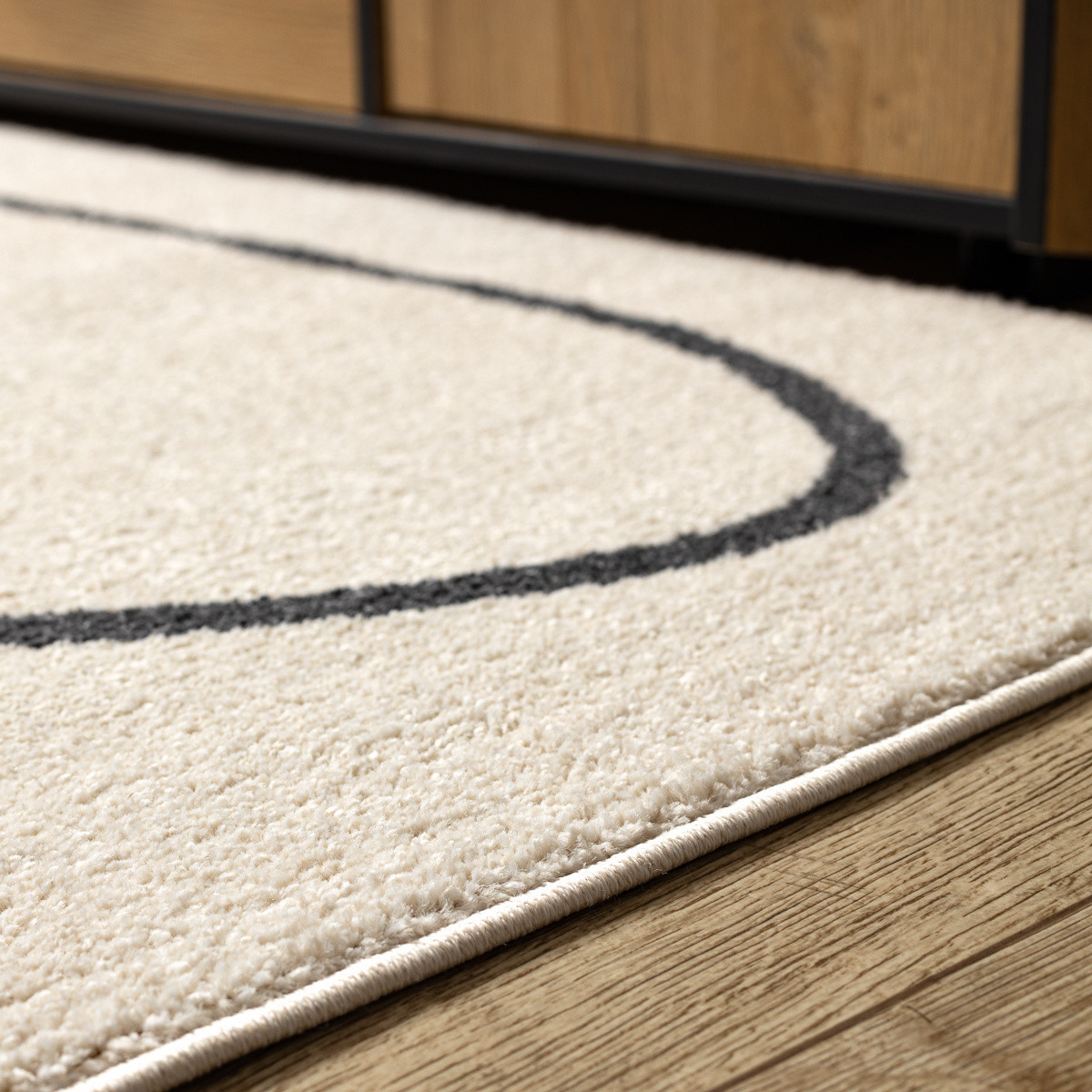 Koberec na první pohled zaujme svou jednoduchou, a přesto výraznou estetikou. Krémově světlý podklad působí čistě a jemně, zatímco černá abstraktní linie, která se volně klikatí po celé ploše, dodává koberci moderní a umělecký charakter. Díky střiženému polypropylenovému vlasu je povrch hebký a příjemný na dotek, zároveň snadno udržovatelný a odolný vůči běžnému opotřebení. Koberec je pečlivě obšitý po celém obvodu, takže si dlouhodobě zachovává svůj elegantní vzhled. Hodí se zejména do moderně laděných interiérů, kde dokáže vytvořit originální atmosféru a stát se nepřehlédnutelným designovým prvkem. Výška vlasu: 10 mm.