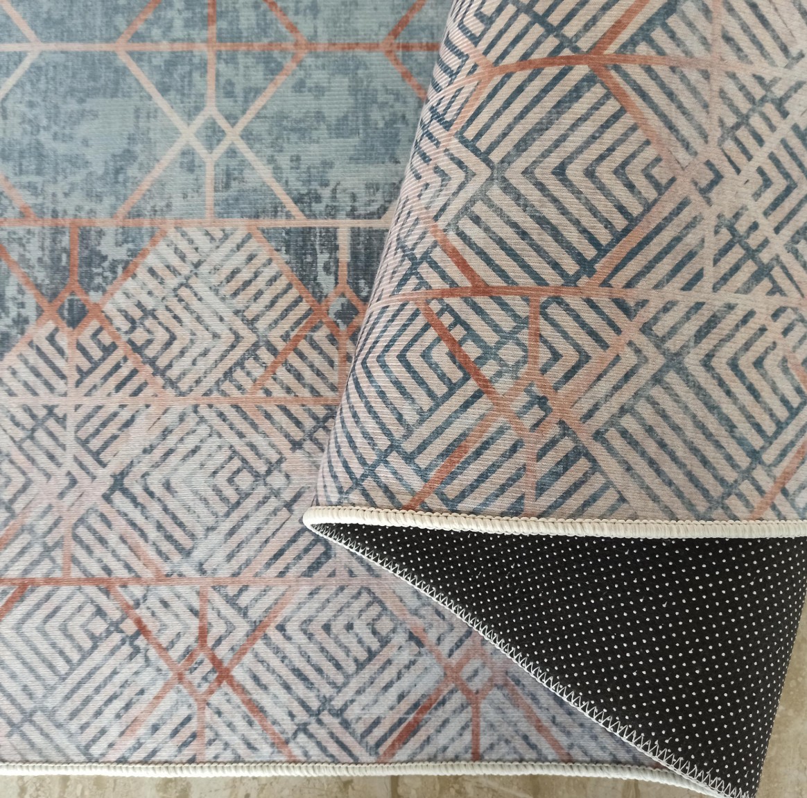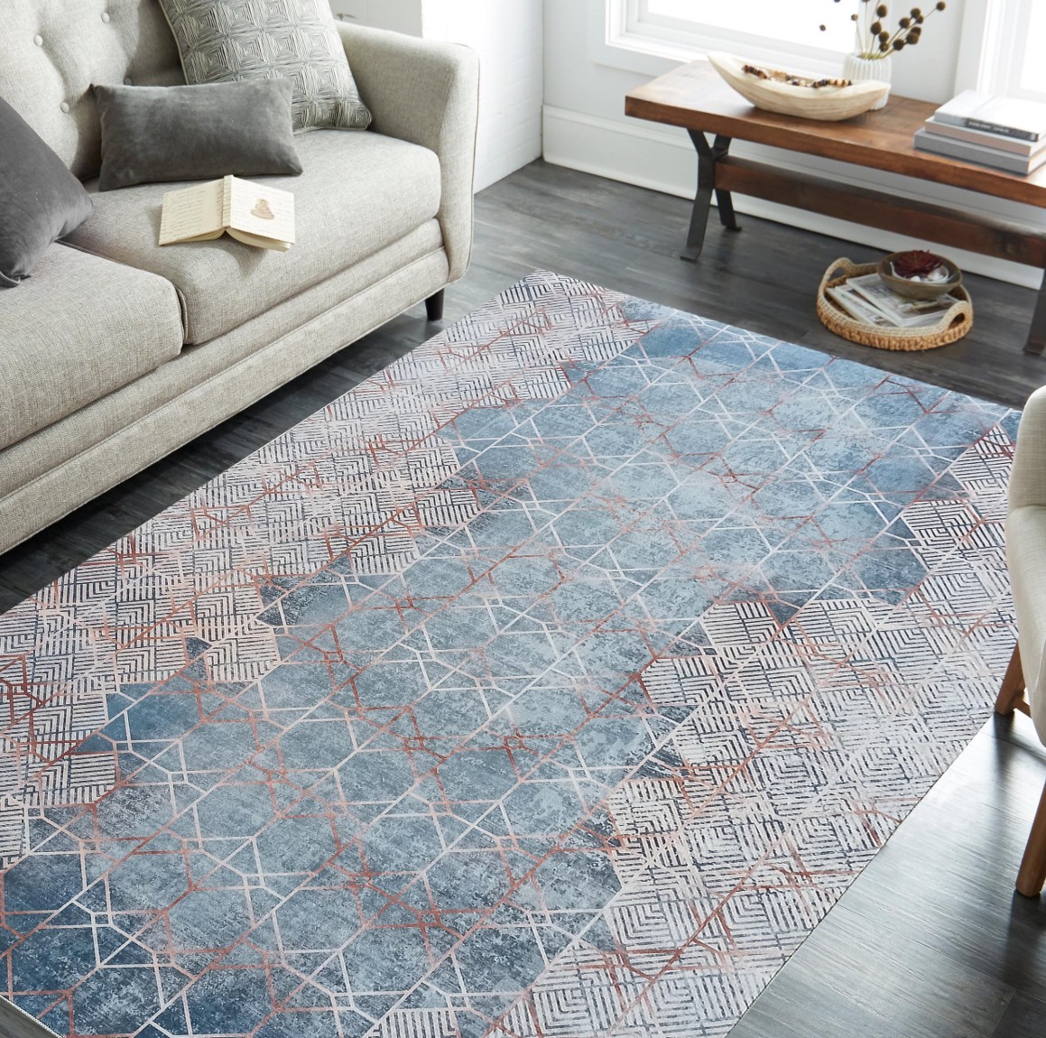 Modrý moderní koberec, který zaujme originálním geometrickým vzorem a krásnými barvami. Vyberte si ho do stylového boho obývacího pokoje, moderní ložnice nebo jídelny inspirované stylem art deco. V jakémkoli z těchto stylů koberec zateplí interiér a dodá mu útulnost. Model HONOR Geometry je protiskluzový koberec. Je vyroben z polyesteru, takže je odolný, snadno se každodenně udržuje a doporučuje se pro alergiky, protože se na něm nehromadí škodlivé mikroorganismy.