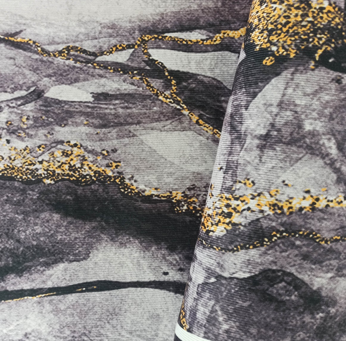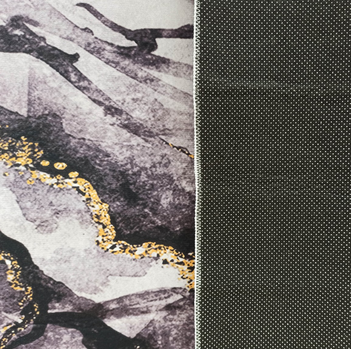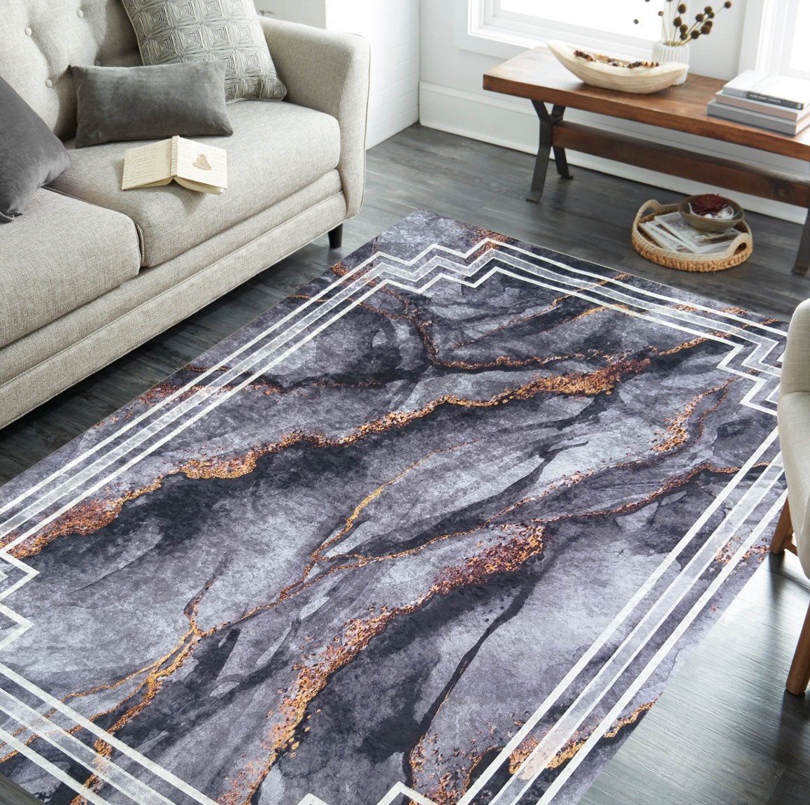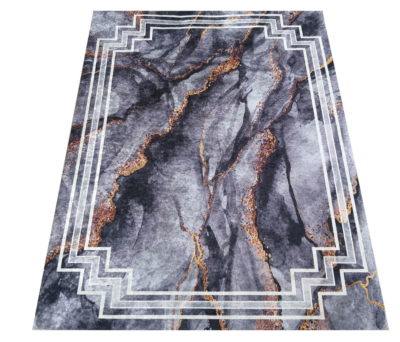 Tmavě šedý moderní koberec s velmi módním vzorem inspirovaným kresbou kamene. Sytě šedé a zlaté akcenty mu dodávají jedinečný, elegantní charakter. Koberec HONOR Rock skvěle doplní každý interiér, ať už klasický, nebo moderní. Je stvořen i pro stylový obývací pokoj, ale najde si cestu i do krásné ložnice nebo reprezentativní jídelny. Zlatě zvýrazněné "polstrování" a geometrické linie jsou receptem na útulný, harmonický a poutavý interiér. Koberec má protiskluzový podklad, takže neklouže po podlaze a můžete ho snadno položit na panely, desky nebo keramickou dlažbu. Je vyroben z kvalitního polyesteru - je trvanlivý, odolný vůči mechanickému poškození a lze jej prát na 30 stupňů. Svůj krásný vzhled si zachová po velmi dlouhou dobu. Nebude měnit barvu ani se deformovat.