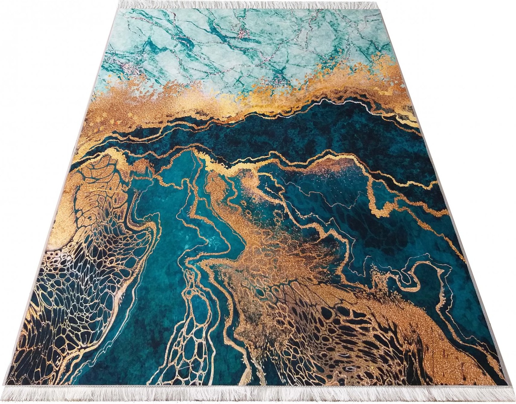 Elegantní a nápadný koberec - moderní vzor připomínající mořské pobřeží a sytá zlatozelená barva jsou jeho největšími přednostmi. Vyberte si tento model do stylového obývacího pokoje, jídelny nebo ložnice. Je protiskluzový a velmi odolný, takže bude dobře fungovat i v intenzivně využívaných prostorách. Koberec vypadá efektně a zároveň stylově. Skvěle bude vypadat s tmavě zelenou pohovkou, zejména s trendy velurovým čalouněním. Hodí se také ke zlatým a mosazným doplňkům, šedé, bílé a zemitým barvám. Obdélníkový protiskluzový koberec je vyroben z polyesteru a je k dispozici v několika velikostech. Snadno si tak můžete vybrat ideální model do místnosti jakékoli velikosti.