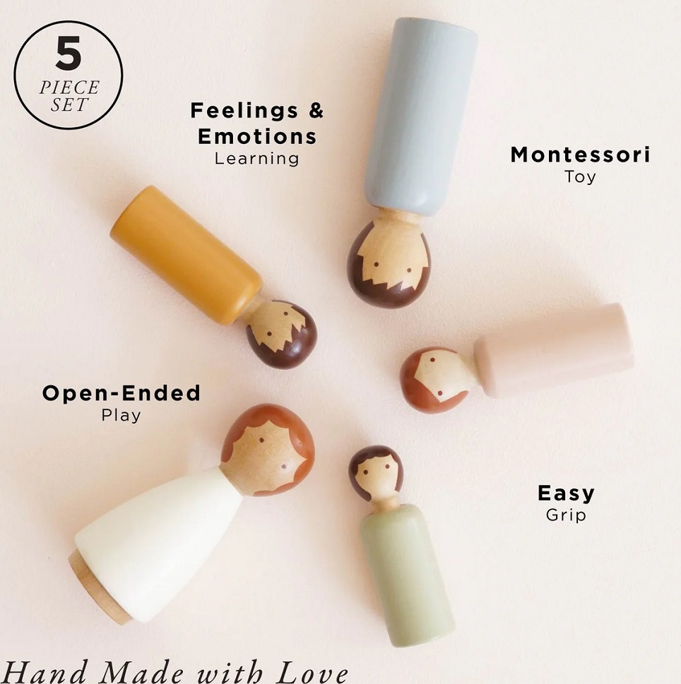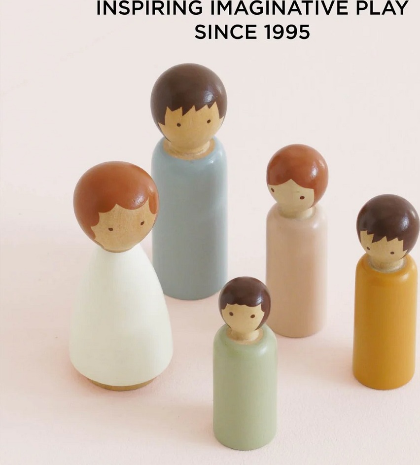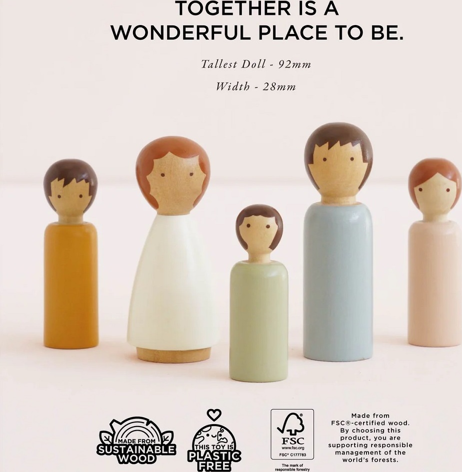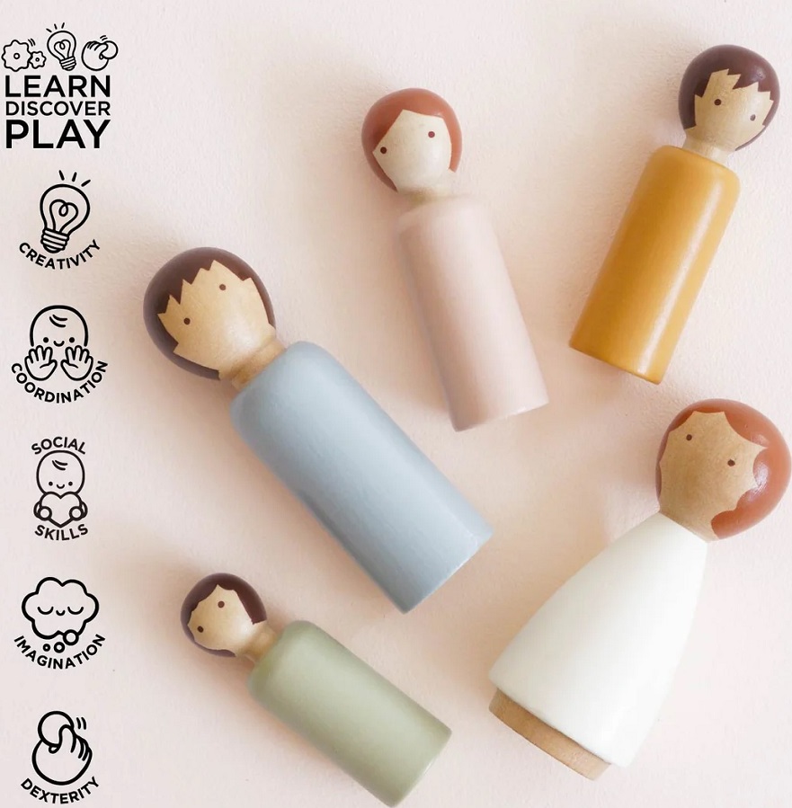 Dubois Wooden Family Dolls, to je malá dřevěná rodinka pro Vaše nekonečné hraní. Přineste dětským hrám kouzlo přirozenosti a jednoduché elegance s tímto ručně vyráběným setem. Sada pěti dřevěných panenek je vyrobena z jednoho kusu FSC® certifikovaného dřeva, každý kus je originální a má jemnou, přírodní strukturu a měkké, neutrální barevné ladění.Panenky jsou navrženy minimalisticky, bez plastů, s hladkým povrchem a netoxickým vodou ředitelným lakem, jsou tak ideální pro malé ruce a bezpečnou dětskou hru. Díky svému jednoduchému tvaru a přirozenému vzhledu podporují rozvoj fantazie a kreativního vyprávění.Tento set je perfektním doplňkem k domečkům pro panenky, mini-světům, hracím sadám nebo jako samostatná sada pro imaginární hry. Je to ekologická, stylová a trvanlivá hračka, která podporuje kreativní hru, jemnou motoriku a sociální interakci.