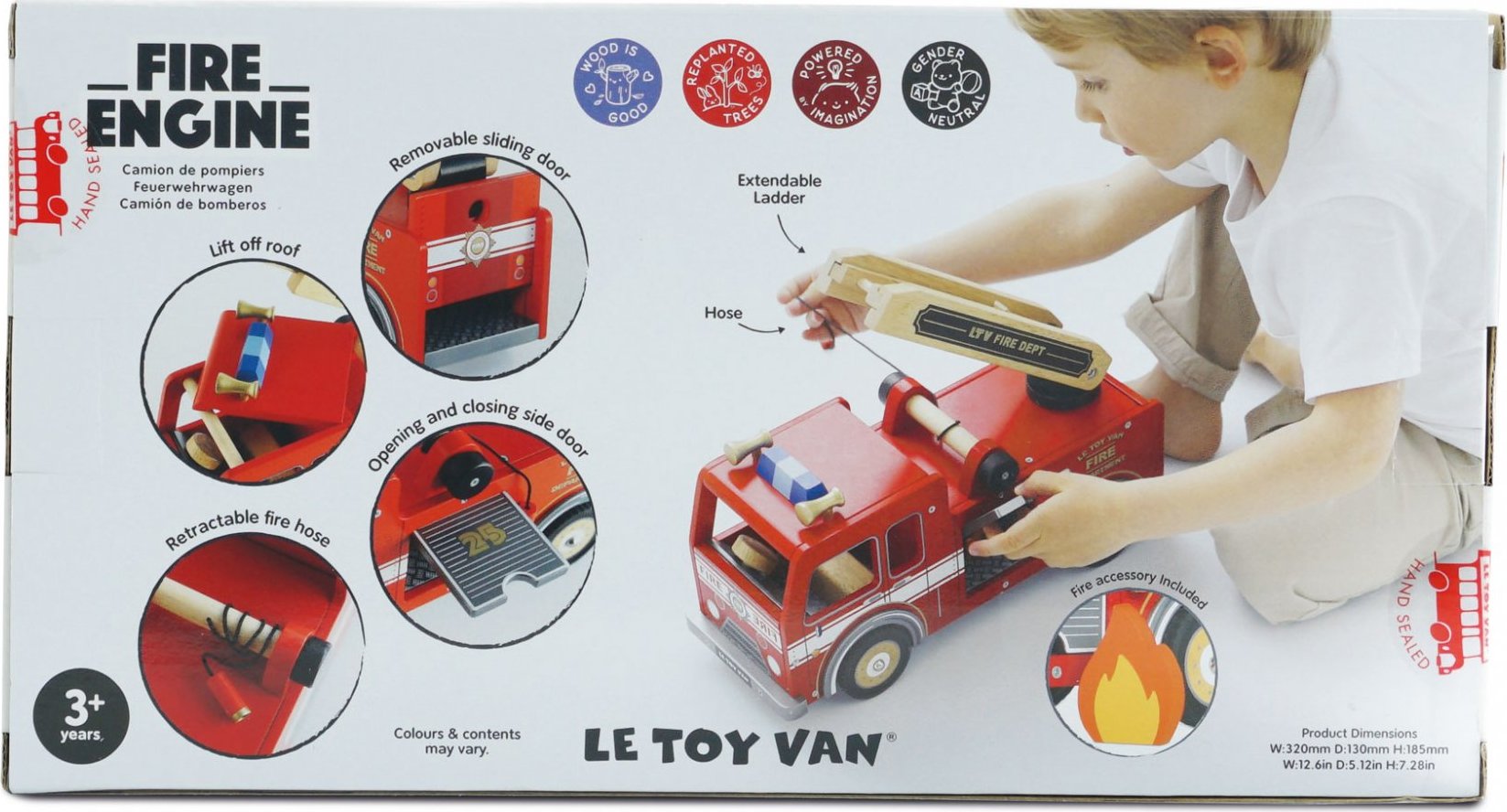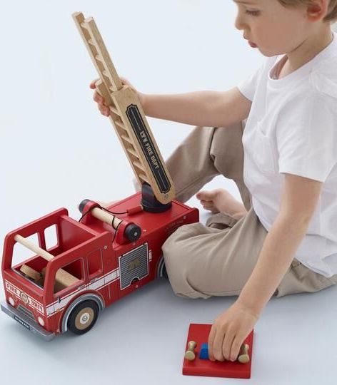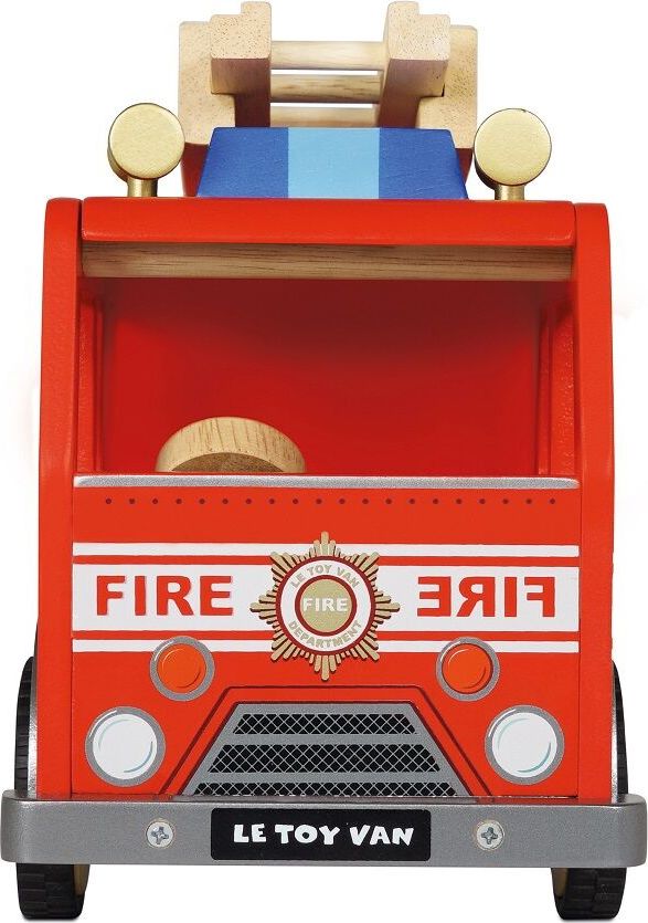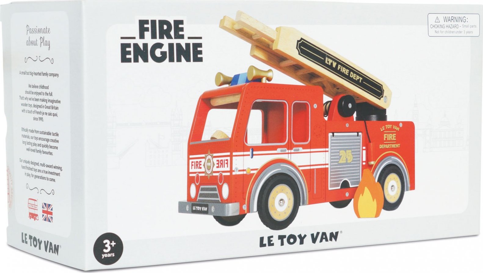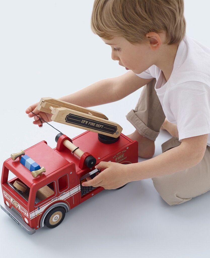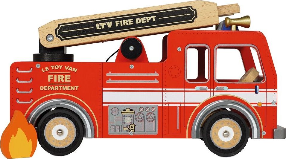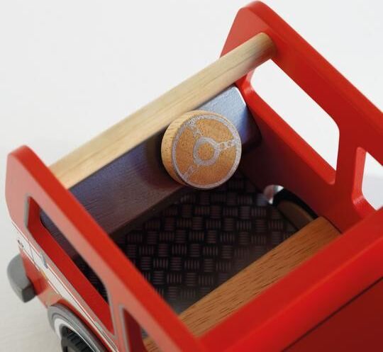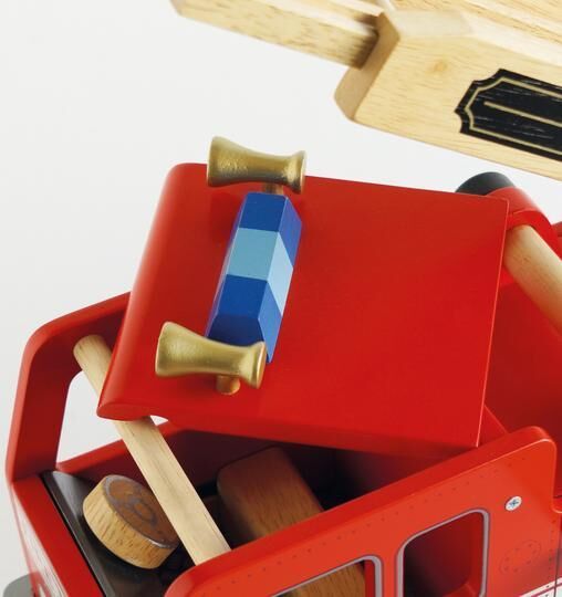 Hoří, ale hasiči v dřevěném voze jsou již naštěstí na cestě! Odolné dřevo z udržitelných lesů je malováno netoxickými barvami na bázi vody. Díky červenému odstínu všichni poznají hasičské auto na první pohled. Představivé hračce nechybí výsuvný a otočný žebřík, ani navíjecí hadice. Perfektní pro každodenní představivou hru, u které si děti procvičí jemnou motoriku a zručnost. Hračka bez obsahu plastu.