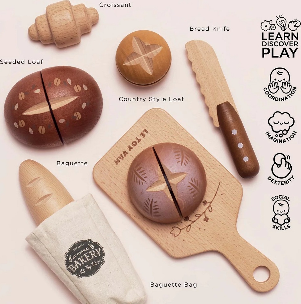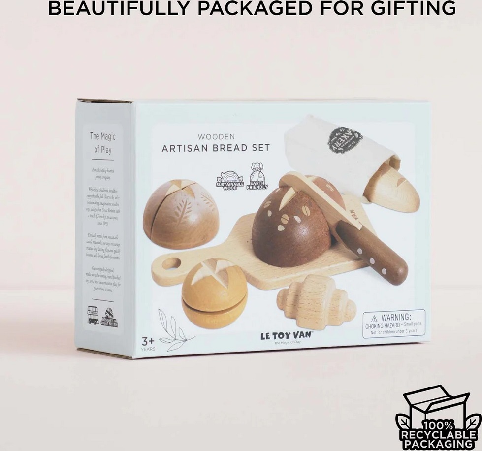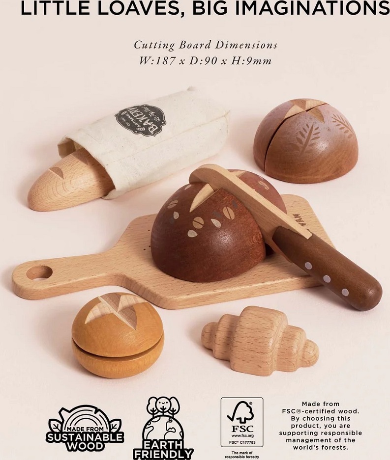 Přiveďte do dětského pokojíčku atmosféru malé pekárny nebo tržnice. Ideální vola pro malé pekaře a kreativní děti. Tento krásně zpracovaný dřevěný set zahrnuje různé druhy pečiva: semínkový chléb, country-chléb, housku, croissant i bagetu. Součástí je také měkký látkový pytlík, dřevěný nůž a dřevěné prkénko s rytými detaily. Pečivo je spojeno suchý zipem.Jedná se o ekologickou, udržitelnou hračku vyrobenou ze dřeva s certifikací FSC®. Materiál je pevný, přírodní a zodpovědně získaný. Povrch je upraven netoxickými barvami na vodní bázi, což je bezpečné pro děti. Tento set podporuje prostorovou představivost, kreativitu a jemnou motoriku. Děti si mohou hrát na pekárnu, obchod, domácí kuchyň nebo tržnici, sdílet hraní s kamarády či sourozenci, nacvičovat společenské interakce a představivou hru.