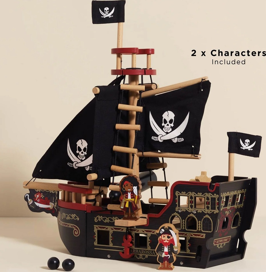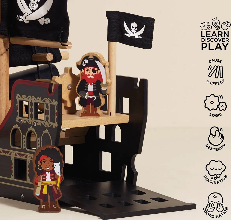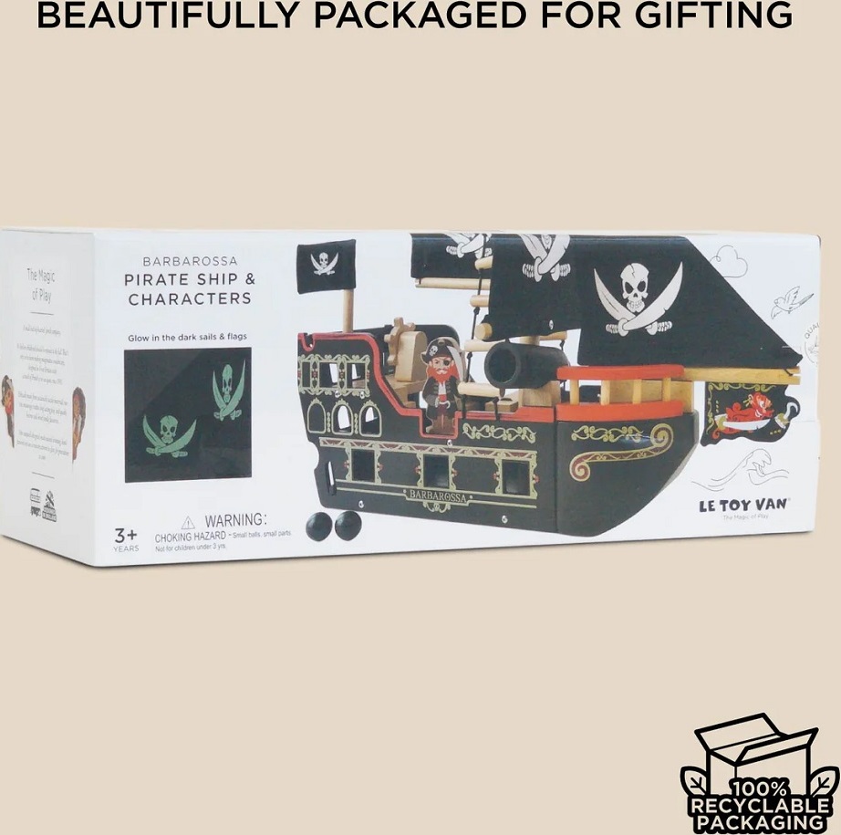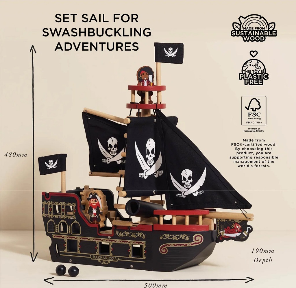 Velkolepá Barbarossa je připravena k plavbě! Loď je malována černou barvou, její černé plachty s lebkou a překříženými meči varují, piráti se plaví! Krásná hračka s mnoha detaily je vyrobena z odolného a udržitelného dřeva. Je plná interaktivních funkcí, které děti mohou objevovat během představivé hry – vraní hnízdo, popravčí prkno, lanoví, dělo s koulemi (střílí díky pružiny), kotva s navijákem, dveře do podpalubí a otevírací záď. Hračka bez obsahu plastu je vhodná pro figurky do 10 cm. Součástí balení jsou dvě figurky - pirát a pirátka. Hračky s účelem