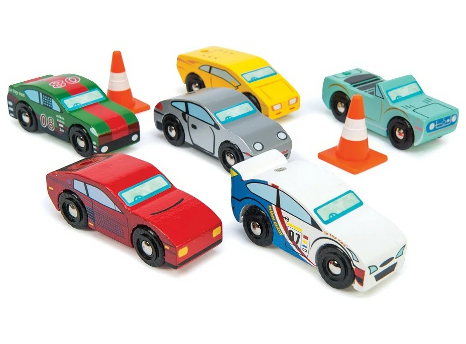 Připravit, pozor, start! S touto sadou šesti sporťáků se nebudete nudit. Každé auto má unikátní barevný design s mnoha detaily, nechybí ani dva dopravní kužely, které mohou značit start a cíl. Hračka je vyrobena z udržitelného kaučukového dřeva a malována netoxickými barvami na bázi vody. Kompatibilní s dřevěnými garážemi a vláčkodráhrami Le Toy Van, také s vláčkodráhami jiných značek.