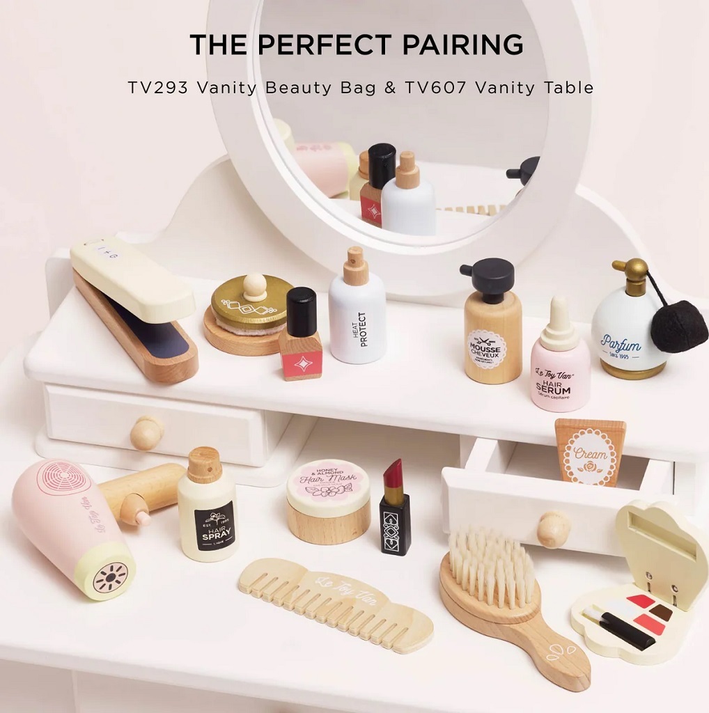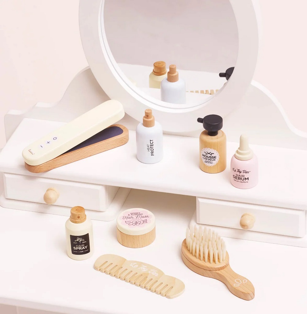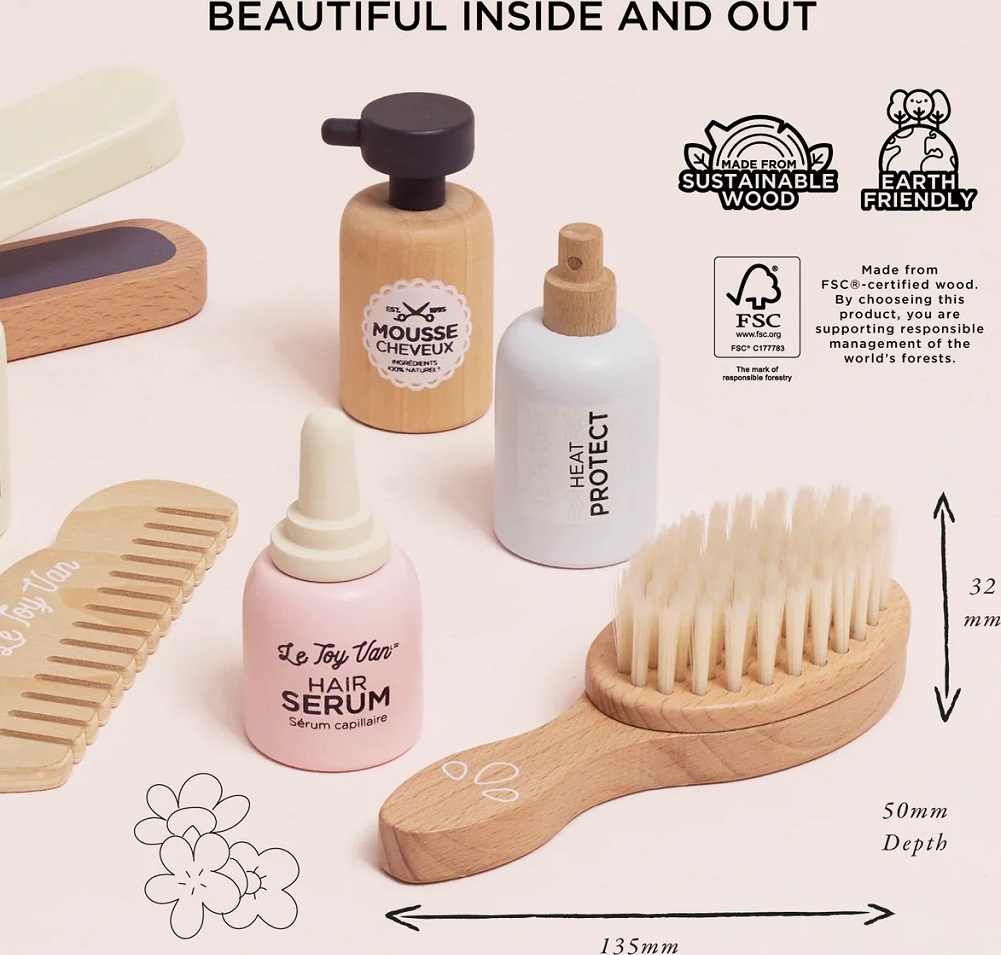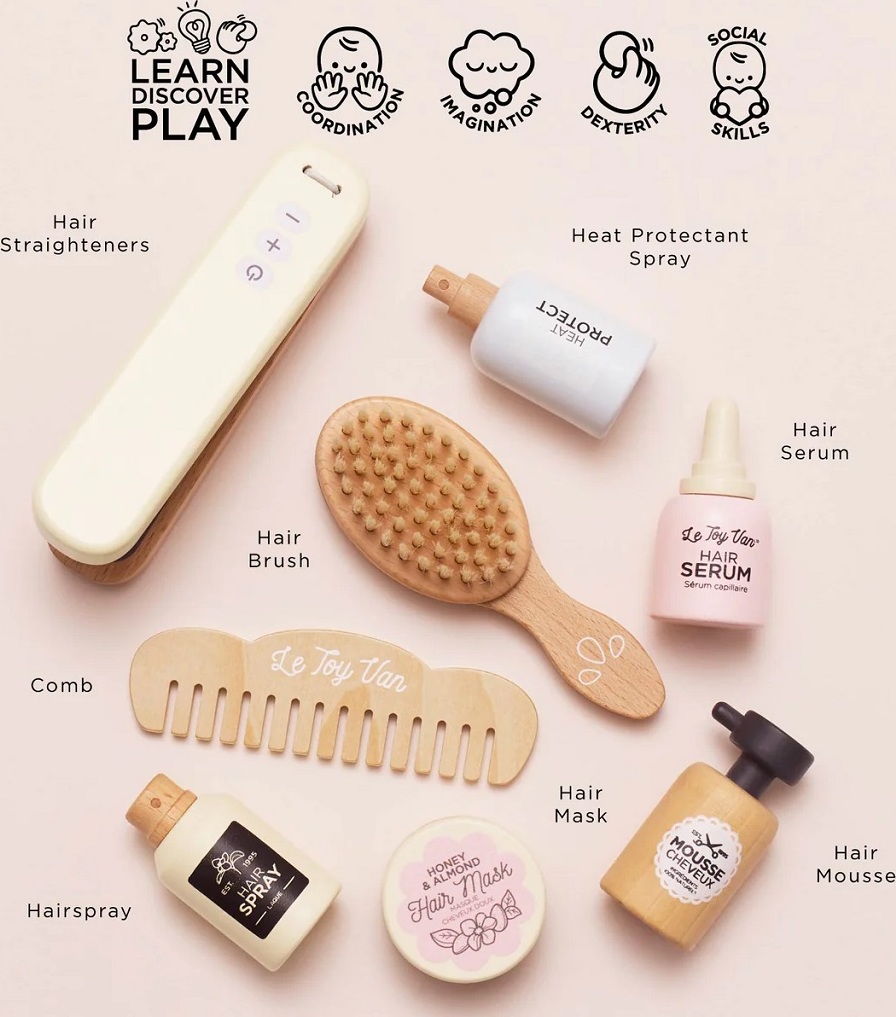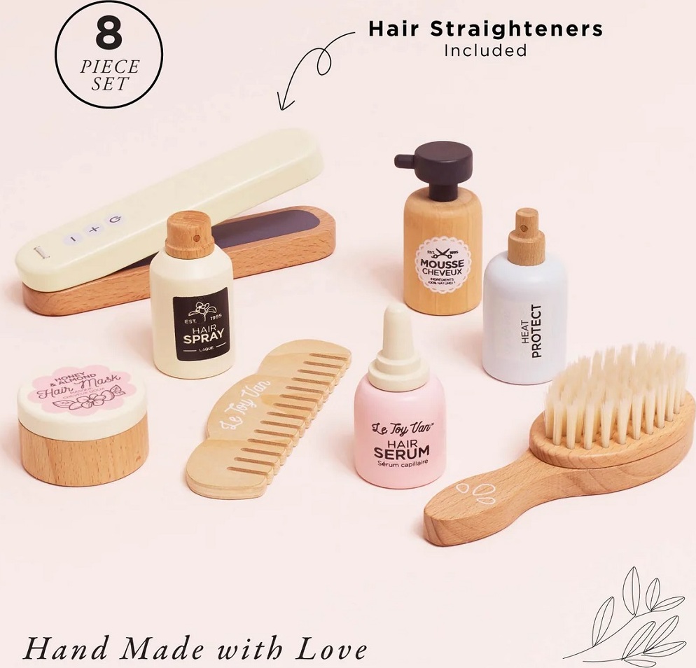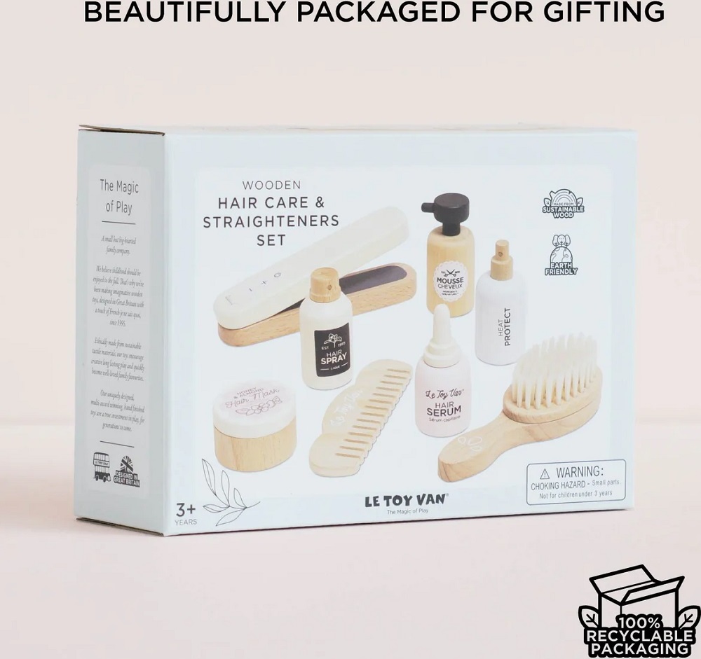 Hair Care & Straighteners Set, to je stylová sada pro malé kadeřnice a kadeřníky. Připravte se na hodiny dětské zábavy a kreativní hry s touto krásnou sadou. Ideální pro malé stylistky a stylisty, kteří milují hraní na kadeřnictví nebo salon. Hračka je navržena s ohledem na bezpečnost, kvalitu a dlouhodobou trvanlivost.Sada obsahuje žehličku na vlasy, hřeben, kartáč, a navíc detailní kosmetické doplňky pro fiktivní péči o vlasy jako jsou lahvičky se sprejem, maskou, sérem, pěnou, ochranným sprejem či lakem, což podporuje malé děti v představivém hraní a napodobování salónních procedur. Hra s touto sadou rozvíjí fantazii, sociální dovednosti a jemnou motoriku. Děti si mohou hrát na kadeřníky, upravit panenkám nebo kamarádům účes, kombinovat doplňky a vytvářet vlastní příběhy. Vyrobeno z certifikovaného dřeva FSC®, ručně malováno vodou ředitelnými netoxickými barvami a plně testováno podle přísných bezpečnostních standardů pro hračky.