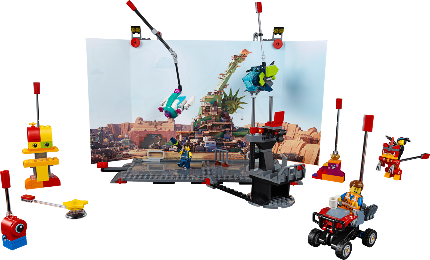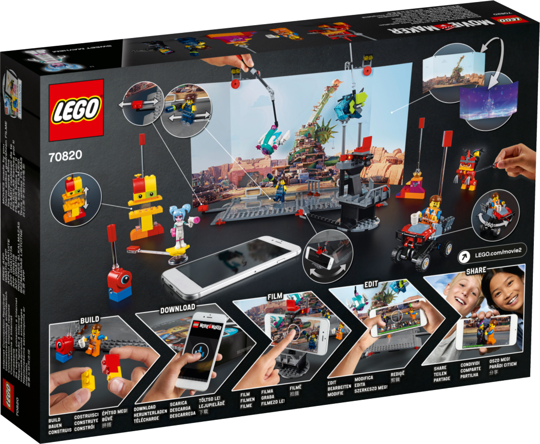 Staň se filmovým režisérem díky sadě LEGO® Movie Maker! Natoč si svůj vlastní film se sadou 70820 LEGO® Movie Maker k filmu LEGO PŘÍBĚH 2, která obsahuje scénu, stojan na kameru pro tvůj chytrý telefon a spoustu akčních rekvizit. Scéna zahrnuje rám s posuvnými nastavitelnými rameny v horní části pro uchycení rekvizit, postav a dalších prvků, oboustranné pozadí s alternativními prostředími, a navíc podložku se zabudovanými posuvníky, díky kterým můžeš s postavami pohybovat. Připoj stojan na některé ze 3 míst na scéně a získej záběry z různých úhlů. Tato sada k filmu LEGO PŘÍBĚH 2 obsahuje i akční rekvizity, včetně Emmetovy únikové buginy a Rexova Rexploreru, 3 minifigurky, figurku minipanenky, 4 sestavitelné figurky a figurku raptora. Obsahuje 9 postav z filmu LEGO® PŘÍBĚH 2: 3 nové minifigurky z filmu chystané na leden 2019 – Emmeta, Lucy a Rexe –, zcela novou minipanenku Milé Mely, která spatří světlo světa rovněž v lednu 2019, 4 sestavitelné figurky z kostek – válečnici Kitty, Hvězdu, královnu Libovůli a mimozemského narušitele – a také figurku raptora. Tato sada k filmu LEGO® PŘÍBĚH 2 obsahuje scénu, otočný stojan na chytrý telefon a akční rekvizity. Scéna obsahuje rám se 2 posuvnými nastavitelnými rameny v horní části pro uchycení rekvizit, postav a dalších prvků, oboustranné pozadí se 2 různými prostředími, a navíc podložku se 2 zabudovanými posuvníky, díky kterým můžeš s postavami pohybovat po scéně, 3 body pro umístění kamery pro záběry z různých úhlů a 2 dílky plotu. Na stojan lze připevnit chytrý telefon. Mezi rekvizitami najdeš Emmetovu únikovou buginu s otočným kokpitem pro minifigurku, Rexův sestavitelný Rexplorer, mini vesmírnou loď, mini Rexplorer a průhledné prvky, díky kterým budeš moct s postavami a vozidly pohybovat. Spoj Emmetovu únikovou buginu s válečnicí Kitty a vytvoř kombinovanou únikovou ultrabuginu. Mezi zbraněmi najdeš Lucyinu kuši, a zbraně Rexe a Milé Mely. Mezi příslušenstvím najdeš navíc 2 hlavy pro minifigurky Emmeta a Lucy s různými výrazy ve tváři. Přehrávej si znovu díky této skvělé stavebnici zábavné scény z filmu LEGO® PŘÍBĚH 2. Scéna měří přes 25 cm na výšku, 16 cm na šířku a 28 cm do hloubky. Stojan na kameru měří přes 14 cm na výšku, 15 cm na šířku a 6 cm do hloubky. Úniková bugina měří přes 5 cm na výšku, 1 cm na délku a 4 cm na šířku. Rexův Rexplorer měří přes 4 cm na výšku, 7 cm na délku a 6 cm na šířku. Mimozemský narušitel měří přes 10 cm na výšku. Téma: LEGO® Movie 2™Vlastnosti