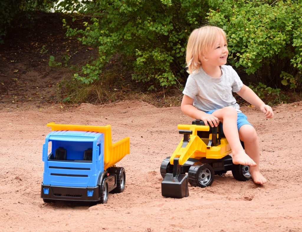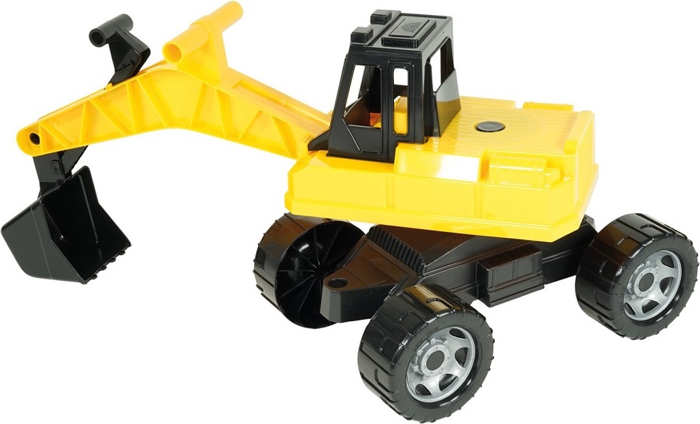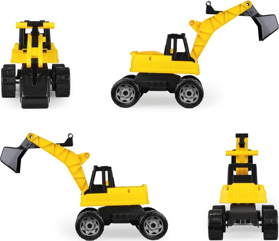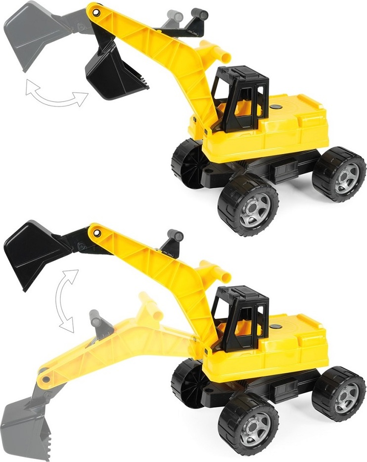 Robustní dětský bagr, na který se děti mohou bez obav posadit, s pohodlným ovládáním lžíce pomocí táhel na rameni. Maximální nosnost lžíce je 25 kg. Horní část bagru je otočná o 360°, což umožňuje realistickou manipulaci. Hračka je určena pro hraní doma i venku, zejména na písku, a je dodávána v pestrobarevné krabici s průhledem.