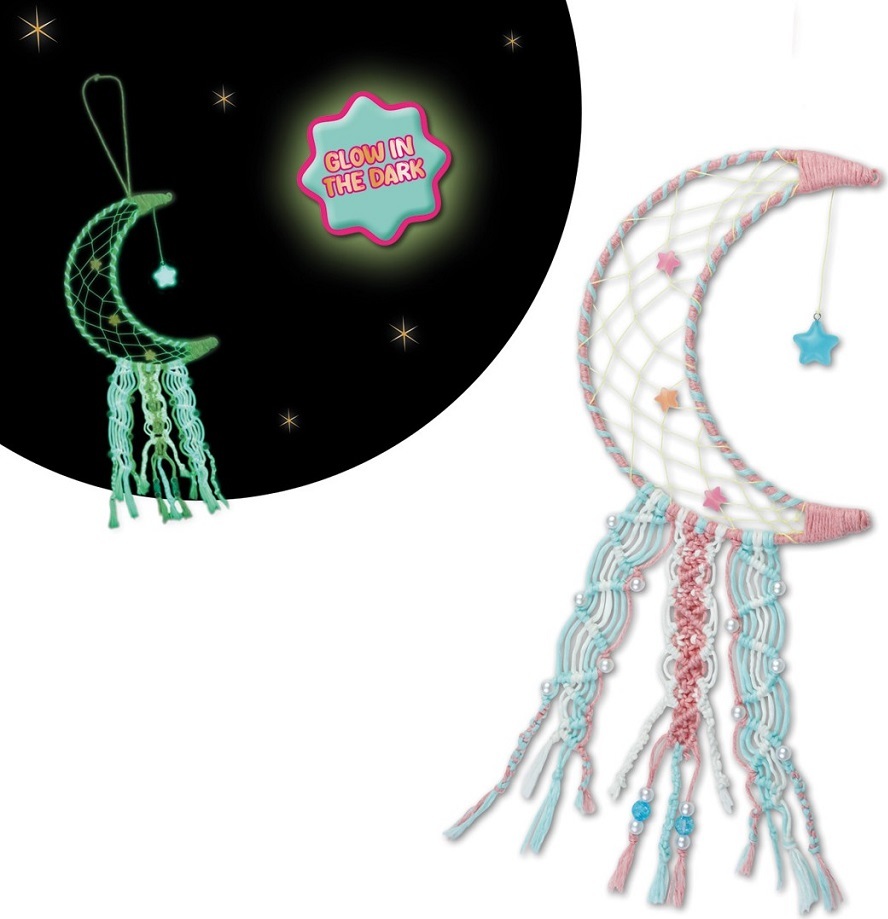 LENA Svítící lapač snů, Glow in the Dark Dreamcatcher, je kouzelná kreativní sada, díky které si děti mohou vyrobit vlastní lapač snů ve tvaru měsíce, který ve tmě svítí. Kreativní hračka podporuje jemnou motoriku, trpělivost, fantazii a přináší dětem radost z tvoření i krásnou dekoraci do pokoje. Součástí sady je kovový rám ve tvaru měsíce, svítící nit, barevné příze, korálky, hvězdičky, dekorativní doplňky a podrobný barevný návod, díky kterému si děti snadno vytvoří vlastní originální lapač snů. Po nasvícení září ve tmě, takže je ideální jako svítící dekorace do dětského pokoje, nad postel, k oknu nebo na zeď. Skvělý kreativní dárek pro holky od 8 let, které milují tvoření, módní doplňky a stylové svítící dekorace.