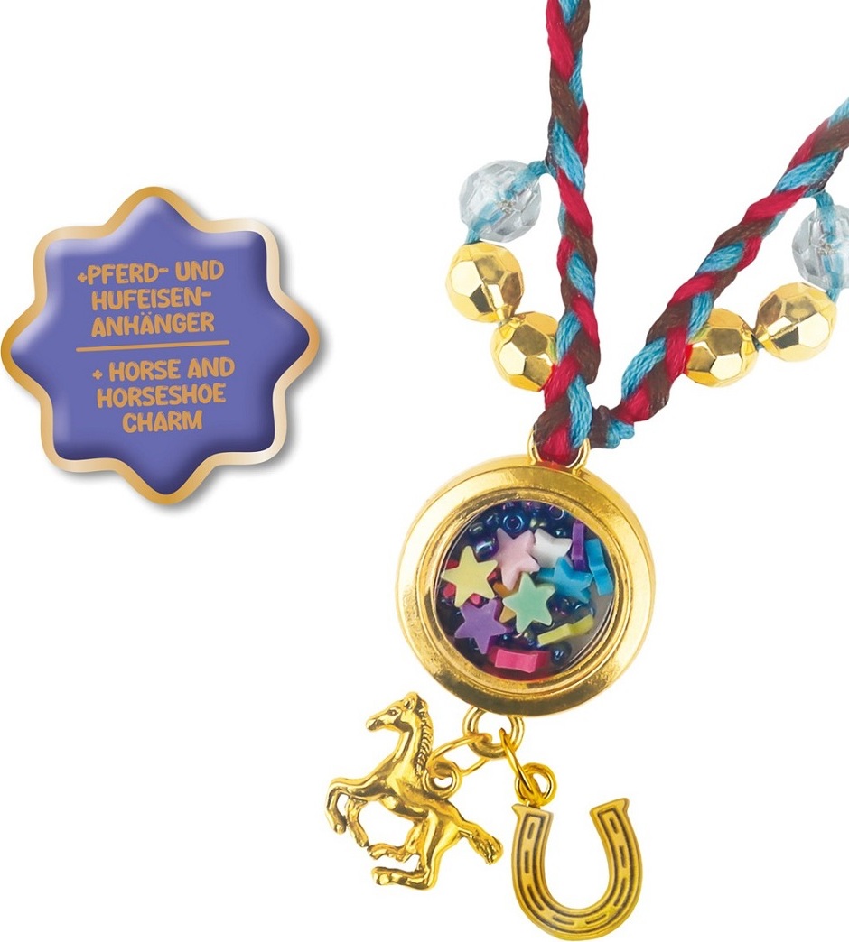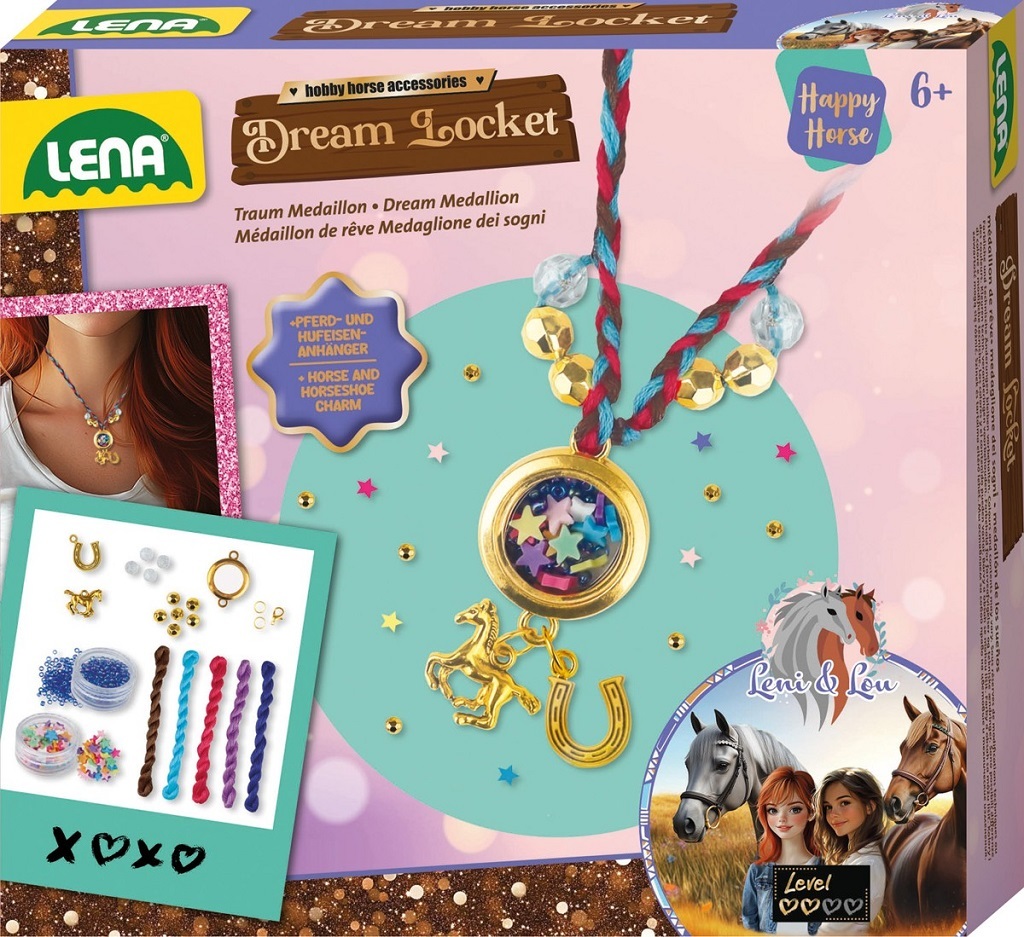 Kreativní sada Medailonek snů Šťastný kůň potěší všechny milovníky koní a tvoření. Děti si mohou vlastnoručně vytvořit originální šperk, který následně mohou nosit nebo darovat jako milou vzpomínku. Sada obsahuje vše potřebné k výrobě medailonku – řetízek s medailonkem, 2 přívěsky, flitry pro vyplnění, příze a podrobný barevný návod. Stačí zapojit fantazii a pustit se do zdobení pomocí barevných flitrů a dalších doplňků. Výsledkem je krásný a jedinečný doplněk s motivem koně. Skvělá sada pro děti, které si chtějí vytvořit vlastní originální šperk a užít si radost z tvoření.
