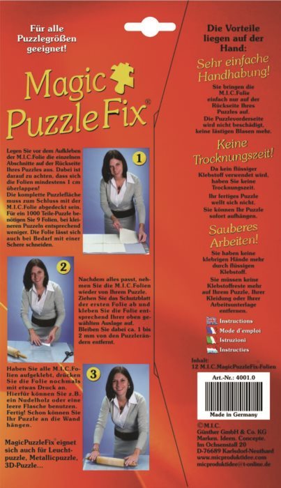 Už žádné zasychání - se samolepicí fólií pro snadné a rychlé nalepení puzzle jednoduše zarámujete složený obrázek i Vy! Výhody lepicí fólie Magic PuzzleFix: - díky lepení z rubové strany není vzhled obrázku (přední strana) narušená a nevznikají nevzhledné bubliny - ihned po nalepení lze obrázek pověsit (není potřeba čekat na zaschnutí jako u lepidla) - nehrozí ušpinění od lepidla Výrobek obsahuje 12 listů folie, každý o rozměru 25 x 17,5 cm. Pro puzzle s 1000 dílky bude potřeba přibližně 9 archů. Návod na použití: Složené puzzle položte obrázkem dolů a na jeho zadní stranu si rozložte fólie Magic PuzzleFix tak, aby přesahovaly přes sebe aspoň 1 cm. Fólii lze stříhat nůžkami, avšak vždy ponechejte 1-2mm na okraji obrázku. Jakmile je pokrytý celý obrázek, postupně odlepte z archů fólie krycí vrstvu a nalepte ji na vybrané místo. Po aplikaci všech lepicích fólií je pevně přitiskněte, případně pro tento účel použijte váleček na těsto nebo prázdnou láhev.Vlastnosti