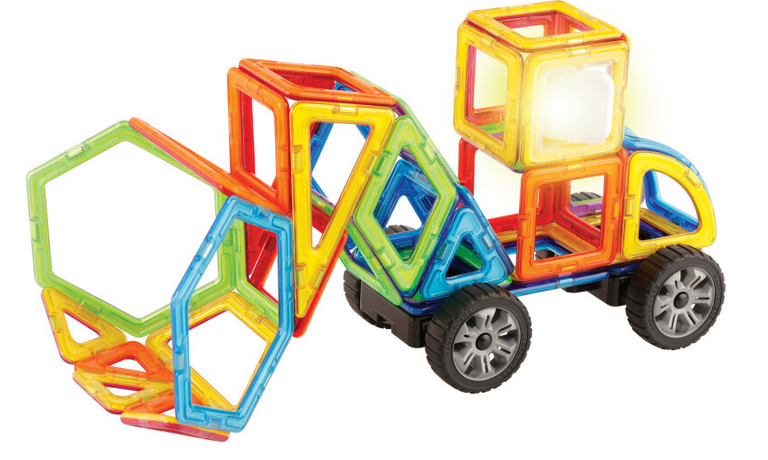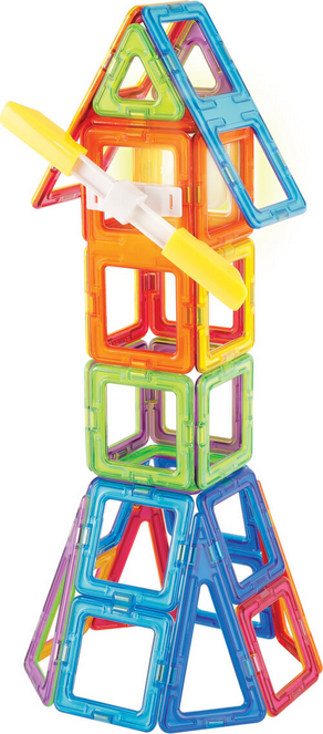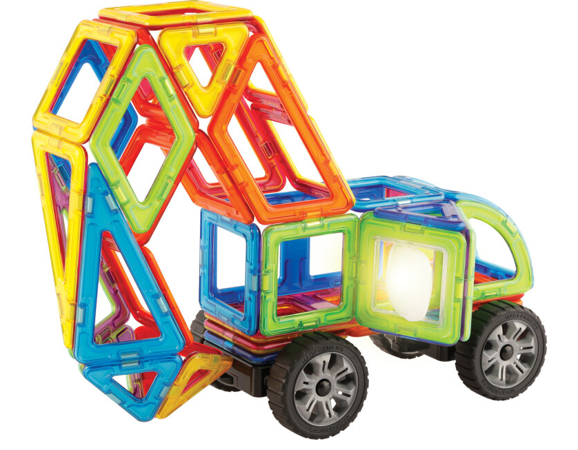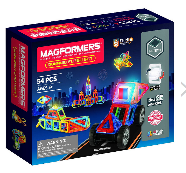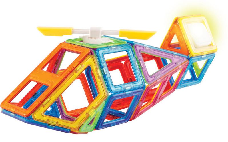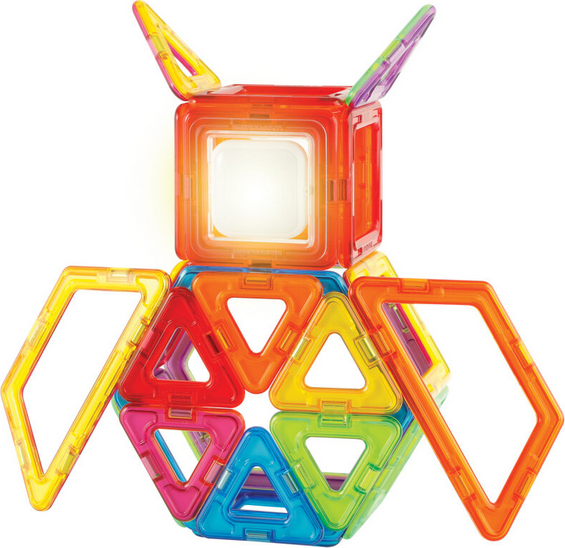 Tato nová univerzální stavebnice poskytuje stavby nepřeberného množství modelů od zvířat a paláců až po šperky a různé dopravní prostředky. Nejvýraznějším prvkem je nový typ lucerny, která se otáčí uvnitř čtvercového rámečku kolem středové osy o 360°. Mačkáním přepínače lze volit různé barvy a světelné režimy, takže v přítmí může každá stavba sloužit jako unikátní lampička. Nastavit lze např. režim blikajícího policejního majáku, stavební a hasičská světla, nebo svítit nepřetržitě. Stisknutím a podržením tlačítka po dobu 3 sekund LED lucernu vypnete nebo se sama automaticky vypne po 10 minutách. Balení obsahuje rovněž nový typ vrtule se 2 roztažitelnými listy, kterou lze ve složeném stavu použít také jako výstražný maják např. pro policejní auta, stavební stroje či vozidla a čluny záchranné služby (na rozdíl od LED lucerny ovšem bez světelného zdroje). Nová kolečka můžete navzájem mezi sebou propojit díky háčku na straně nápravy. Takto můžete vytvořit stabilní konstrukci aut. Pro provoz LED lucerny je třeba baterie CR2032, která je vyměnitelná (je součástí balení). Počet dílků: 54 dílků + obrázkový návod: 12 trojúhelníků 22 čtverců 4 vysoké trojúhelníky 3 obdélníky 2 výseče 1 oblouk 2 šestiúhelníky 2 lichoběžníky 2 kosočtverce 1 vrtule,siréna 2 podvozky koleček 1 otočná LED lucerna Kreativní magnetická stavebnice Magformers umožňuje sestavovat velké množství trojrozměrných objektů, pomocí dvourozměrných plastových mnohoúhelníků. Magformers procvičuje jemnou motoriku, podněcuje tvořivost, učí děti barvy a základní geometrické tvary. Rozměry dílků a vhodně volené tvary zajišťují maximální možnou bezpečnost hračky. Materiál, z kterého je stavebnice vyrobena splňuje nejpřísnější hygienická a zdravotní kritéria. Dílky jsou dostatečně velké, nelze je spolknout a jsou prakticky nerozbitné. MAGFORMERS lze velmi dobře kombinovat i se známou magnetickou stavebnicí Geomag.Vlastnosti