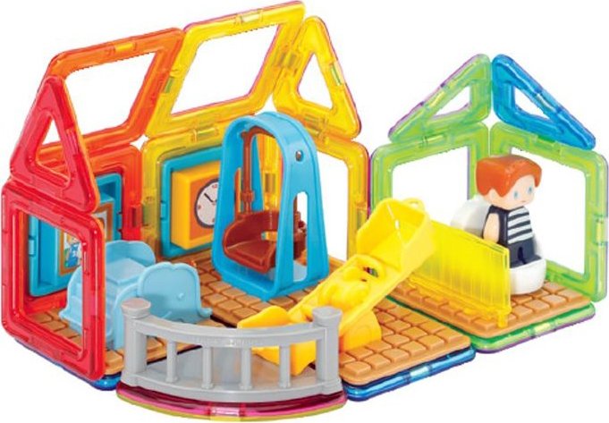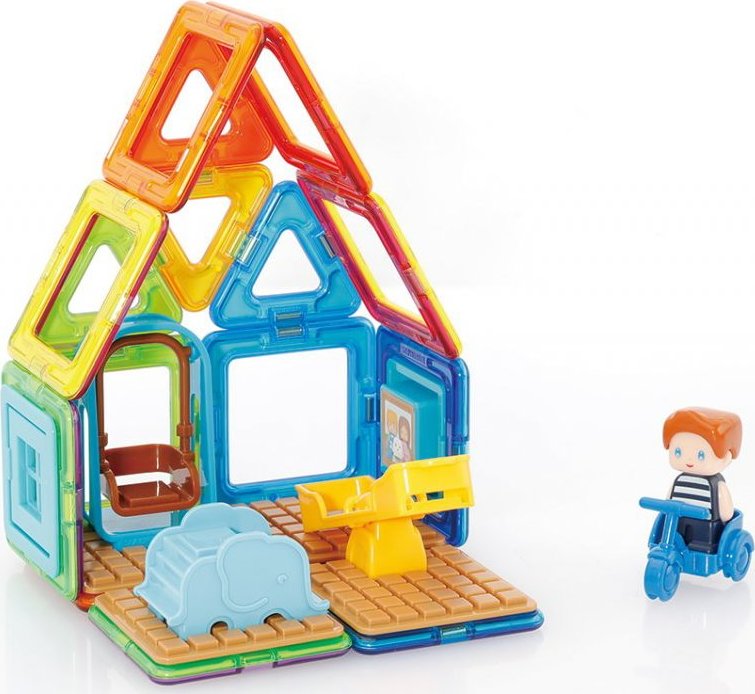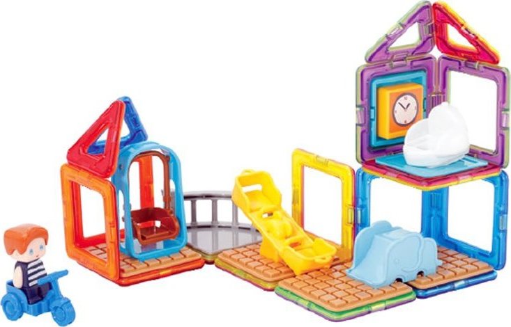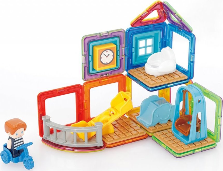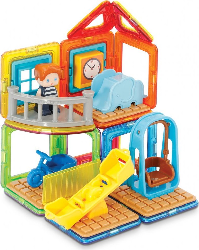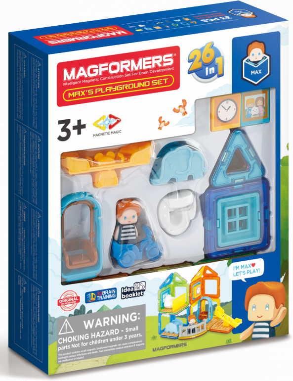 Užijte si zábavu s Maxem a jeho hřištěm. Kreativní magnetická stavebnice umožňuje sestavovat velké množství trojrozměrných objektů, pomocí dvourozměrných plastových mnohoúhelníků. Magformers procvičuje jemnou motoriku, podněcuje tvořivost, učí děti barvy a základní geometrické tvary. Rozměry dílků a vhodně volené tvary zajišťují maximální možnou bezpečnost hračky . Materiál, z kterého je stavebnice vyrobena splňuje nejpřísnější hygienická a zdravotní kritéria. Dílky jsou dostatečně velké, nelze je spolknout a jsou prakticky nerozbitné Balení obsahuje: 4 trojúhelníky 12 čtverců 1 výseč 15x plastové příslušenství 1 postavička Lze sestavovat různě architektonicky řešené tvary herny či polozastřešeného dětského hřiště, kde si dítě rozmístí klouzačky a prolézačky dle vlastní fantasie. Výsledné stavby mají formu poloodkrytého průřezu, kde jsou z jedné strany patrné vnější kontury stavby a z druhé interiérové řešení, které lze postupně obměňovat. Vhodné pro děti od 3 let.Vlastnosti