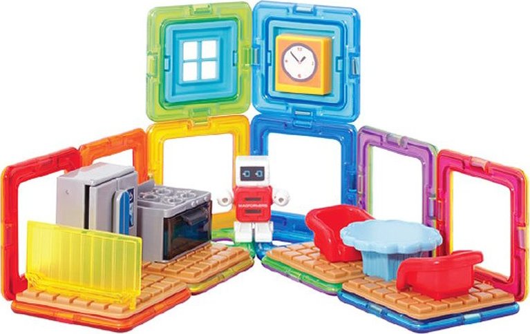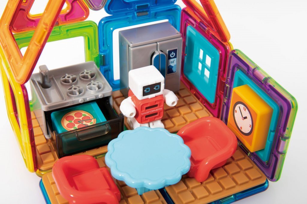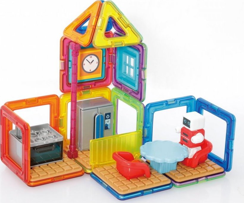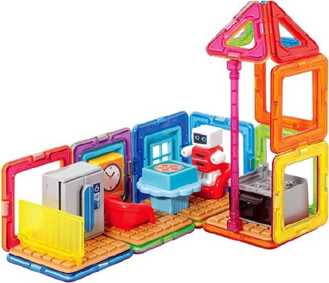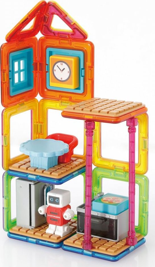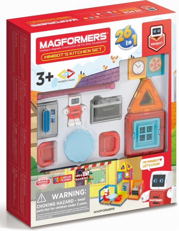 Užijte si zábavu s robůtkem v jeho vybavené kuchyni. Kreativní magnetická stavebnice umožňuje sestavovat velké množství trojrozměrných objektů, pomocí dvourozměrných plastových mnohoúhelníků. Magformers procvičuje jemnou motoriku, podněcuje tvořivost, učí děti barvy a základní geometrické tvary. Rozměry dílků a vhodně volené tvary zajišťují maximální možnou bezpečnost hračky . Materiál, z kterého je stavebnice vyrobena splňuje nejpřísnější hygienická a zdravotní kritéria. Dílky jsou dostatečně velké, nelze je spolknout a jsou prakticky nerozbitné Balení obsahuje: 4 trojúhelníky 12 čtverců 2 magnetická tyčinka 14x plastové příslušenství 1 postavička Lze sestavovat různě architektonicky řešené tvary kuchyňských prostor, kde si dítě rozmístí své zařízení a doplňky dle vlastní fantasie. Výsledné stavby mají formu poloodkrytého průřezu, kde jsou z jedné strany patrné vnější kontury prostoru a z druhé interiérové řešení, které lze postupně obměňovat. Vhodné pro děti od 3 let.Vlastnosti
