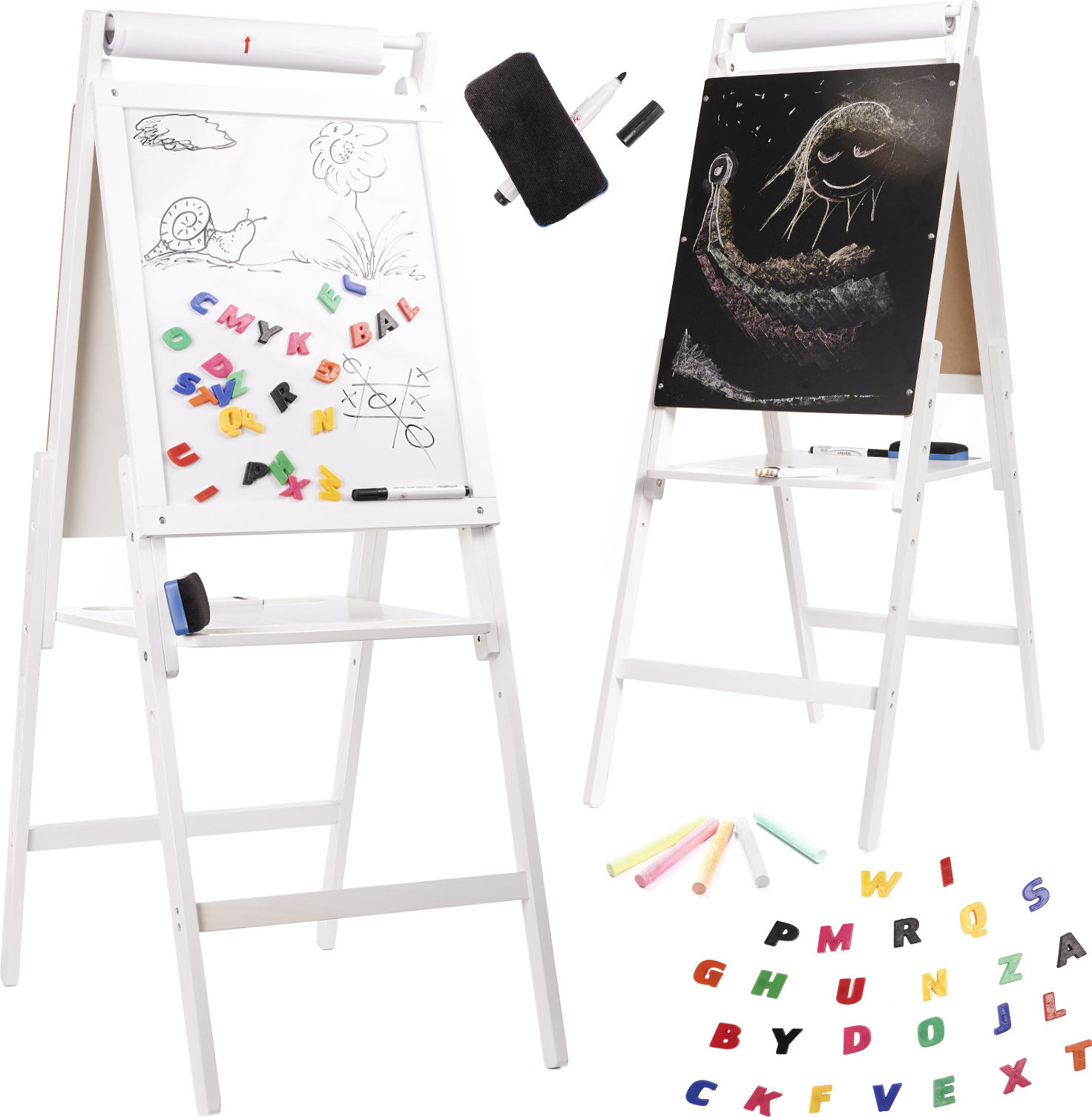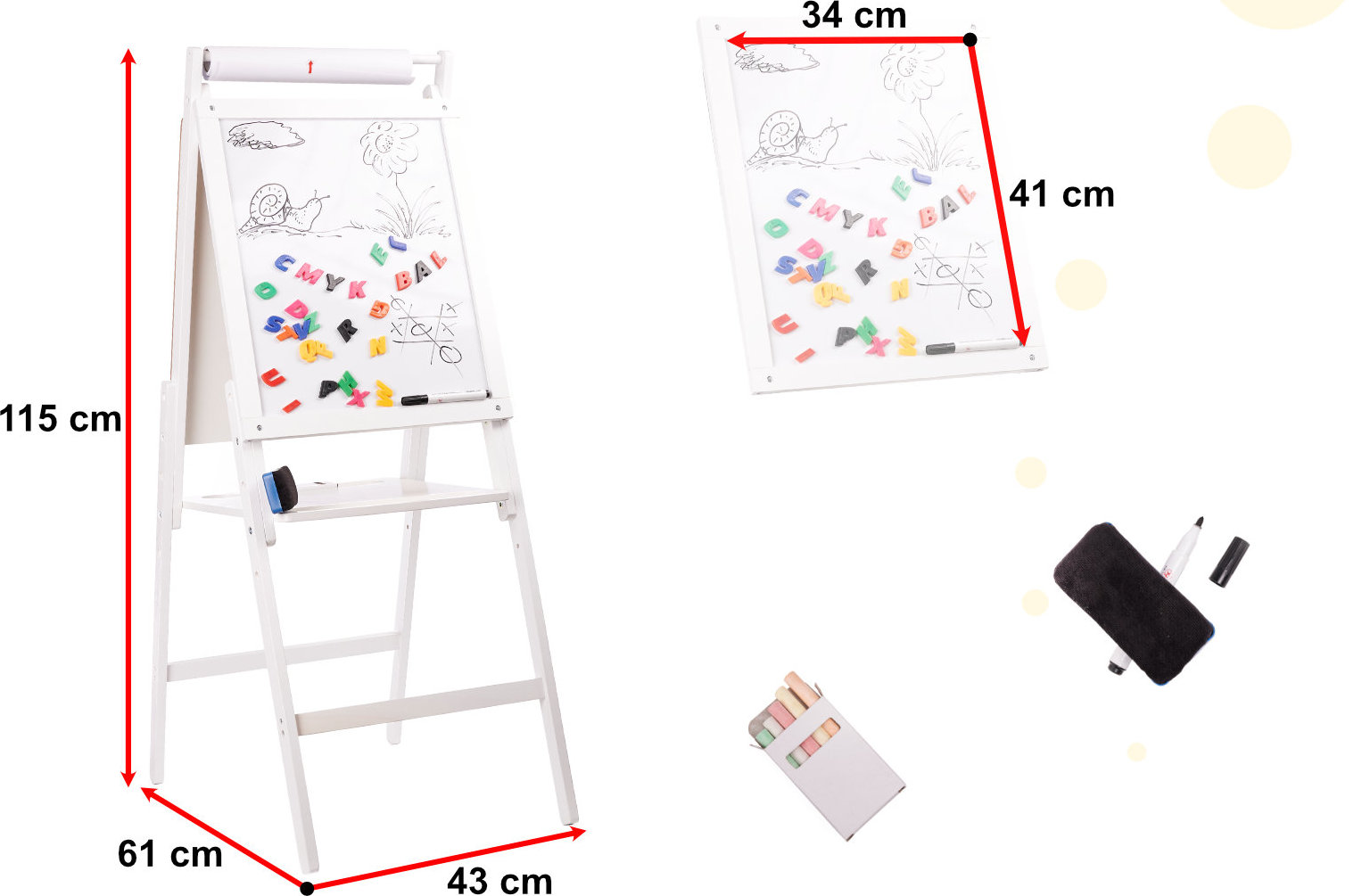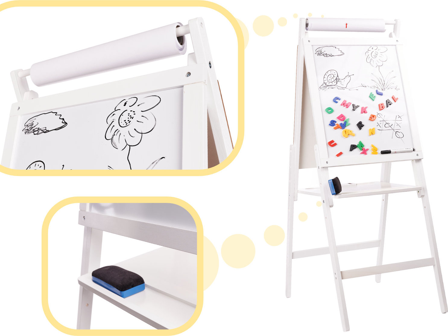 Oboustranná magnetická tabule představuje vynikající způsob, jak spojit hru a učení. Bude velmi užitečná při výuce psaní, počítání a učení písmen. Stane se nepostradatelnou součástí každé rodinné hry. Malý umělec si na něm bude moci zdokonalovat své umělecké dovednosti jako skutečný malíř. Skvěle se hodí jako zápisník na důležité myšlenky nebo jako seznam úkolů.