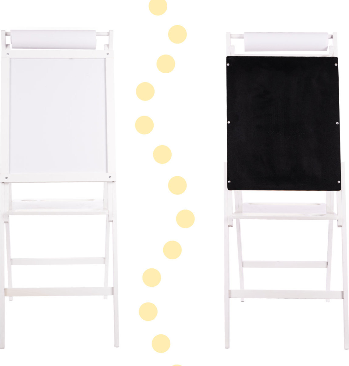Tato oboustranná tabule bude splněným dětským snem. Vytvořeno s ohledem na malé objevitele a začínající umělce. Bílá strana tabule je určena pro psaní nebo kreslení fixami a lze na ni připevnit i magnety. Po otočení na druhou stranu se objeví tabule na psaní křídou. Celek je umístěn na stabilním dřevěném podstavci s místem na houbu nebo křídu.