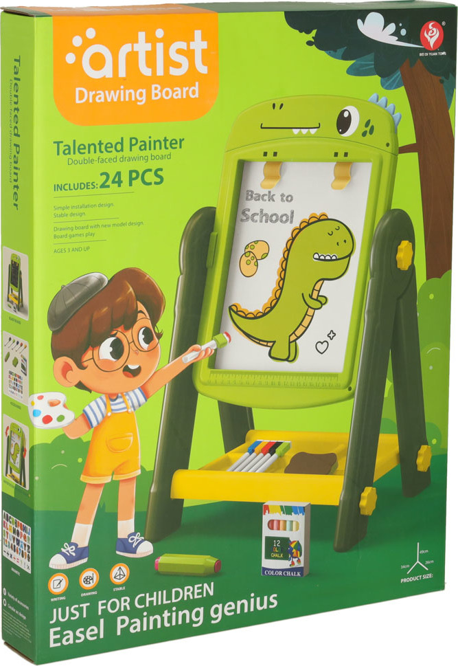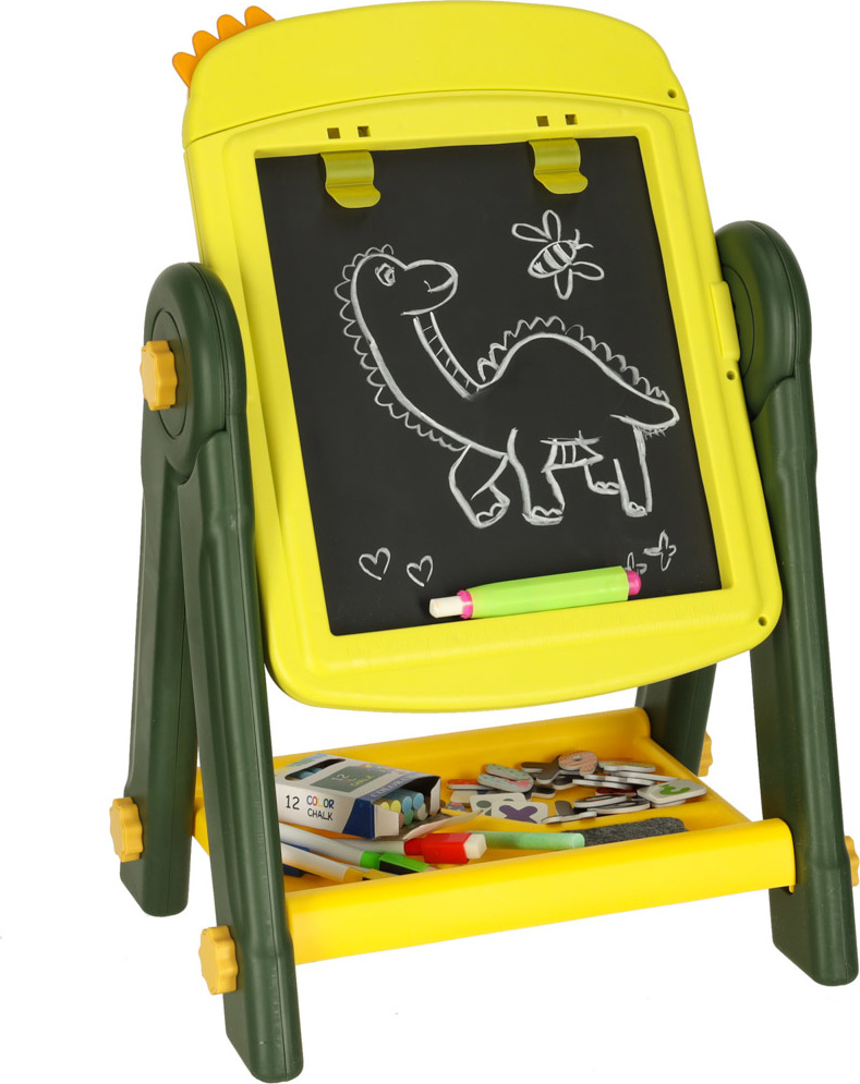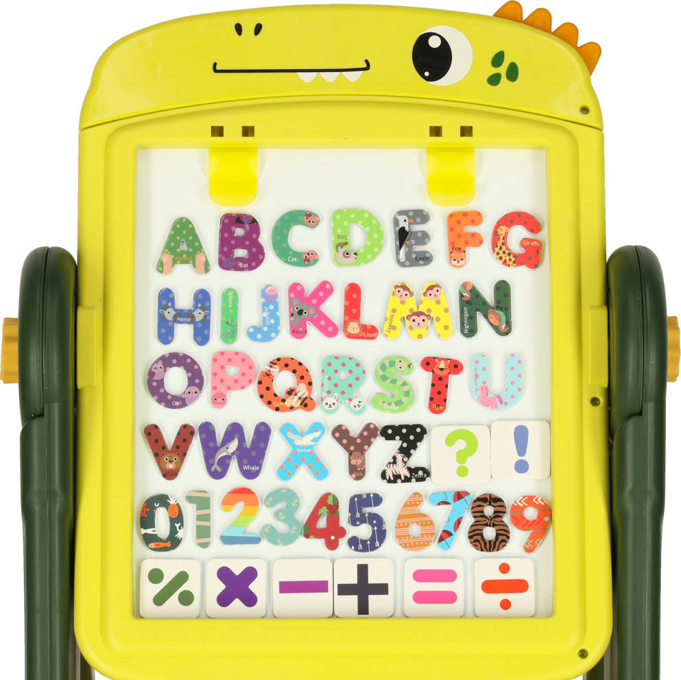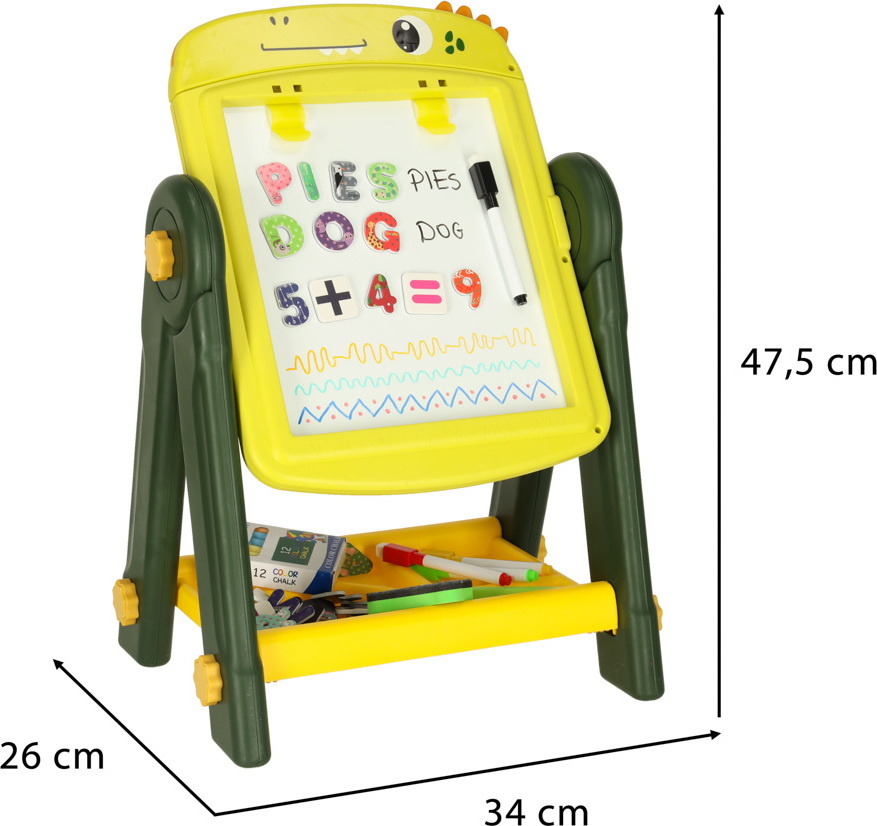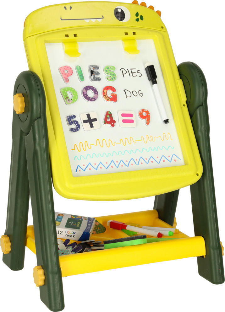 Na jedné straně může vaše dítě psát a kreslit křídou, rozvíjet tak jemnou motoriku a kreativní myšlení, a na druhé straně může používat magnetický povrch pro suché stírání, který je ideální pro hraní s edukativními magnety, logické hry a učení praxí. Díky pevnému stojanu a kompaktním rozměrům je lehká a snadno se umístí kamkoli. Je to perfektní příklad mobilní tabule navržené s ohledem na malé děti. Tato tabule je ideální pro děti od 3 let. Je to skvělý nástroj pro hravé učení, který vaše dítě zaujme na celé hodiny. Je perfektní jak jako vzdělávací nástroj, tak i jako kreativní způsob trávení času. Díky přiloženým magnetům, písmenům, číslům a matematickým symbolům se děti mohou zábavnou a přirozenou formou pustit do dobrodružství se čtením, psaním a počítáním. Další výhodou je roztomilý motiv žlutého dinosaura, který evokuje pozitivní asociace a povzbuzuje děti k učení hrou. Je to perfektní kombinace radosti, kreativity a vzdělávání v jedné sadě!
