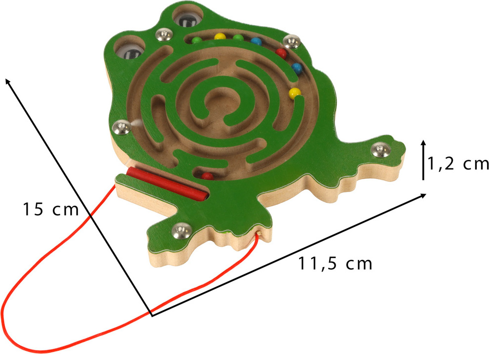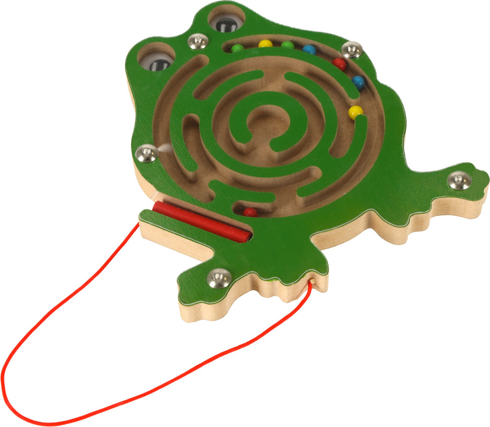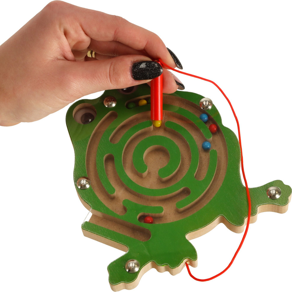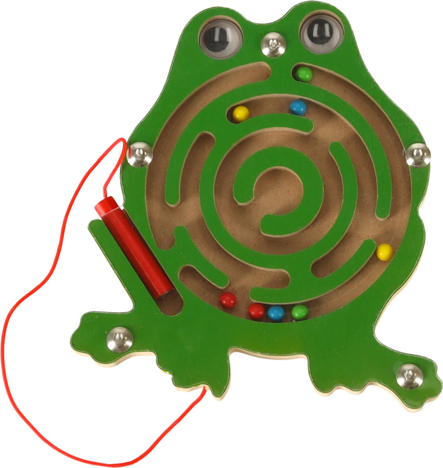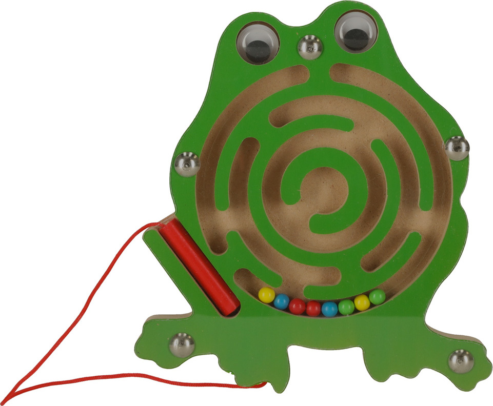 Roztomilá žabka má uvnitř bludiště s kovovými kuličkami. Hra spočívá v použití stylusu s magnetem k přesunu barevných kuliček do středu. Pro větší náročnost lze kuličky bludištěm navádět otáčením hračky různými směry. Celé bludiště je skryté pod tenkým, průhledným plastovým krytem. Tato hračka zabaví vaše dítě na celé hodiny.