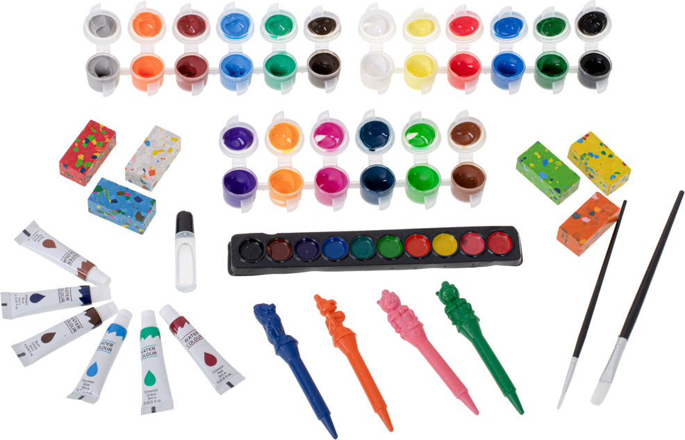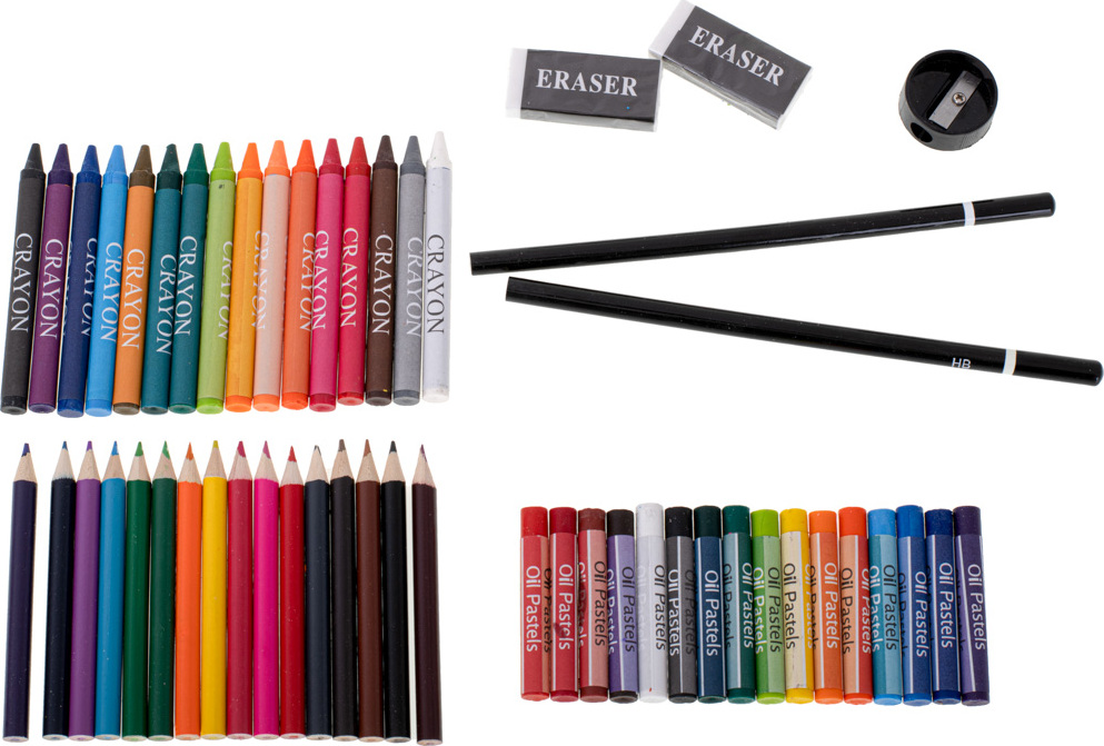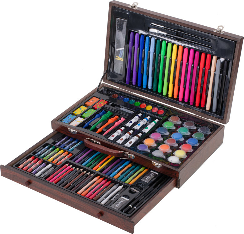 Praktické dřevěné pouzdro obsahující vše potřebné pro tvorbu vlastních krásných obrázků! Rozmanitost příslušenství v sadě vytváří nekonečné možnosti pro přenesení vaší fantazie na papír! Široký výběr dostupných barev vám umožní najít ten správný odstín! Sada nabízí možnost vytvářet obrázky různými metodami díky širokému výběru nástrojů, jako jsou tužky, fixy, olejové pastely a různé druhy barev a pastelek. Sada navíc obsahuje užitečné příslušenství, jako jsou gumy, pravítko, lepidlo, štětce, ořezávátko a palety.