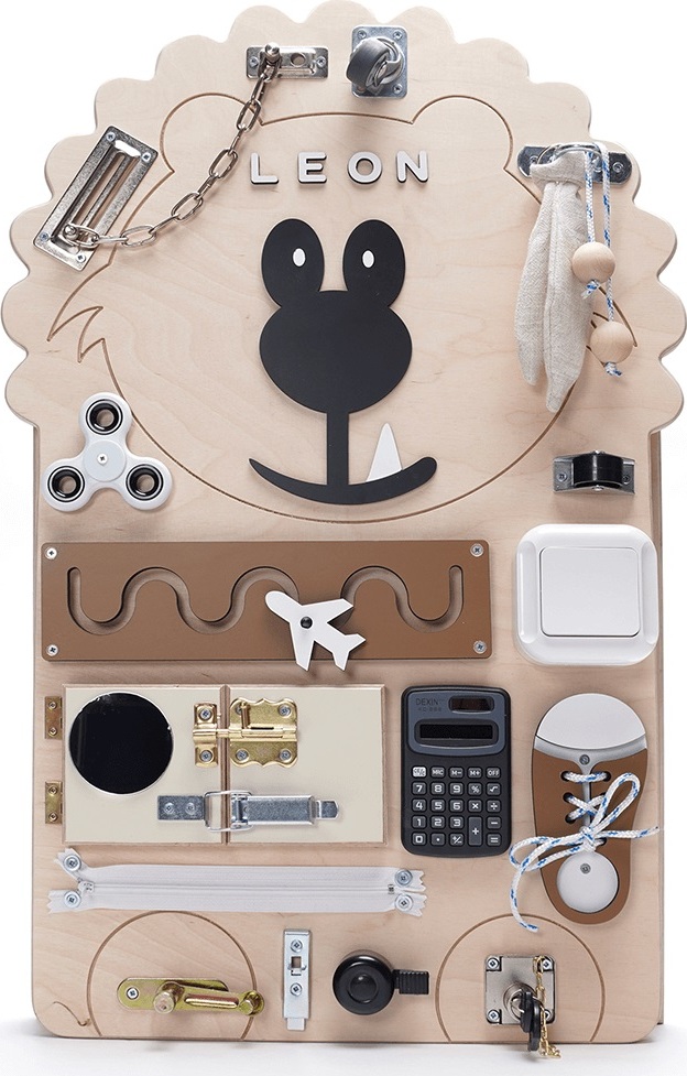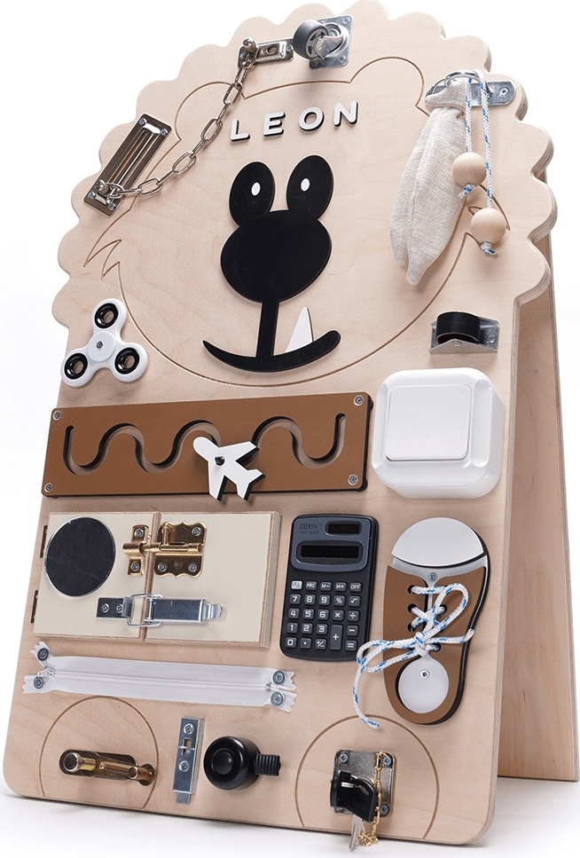 Senzorická deska Activity board poskytuje dětem bohaté smyslové podněty, což podporuje rozvoj jejich hmatu, zraku a sluchu. Ideální hračka pro metodu Montessori. Jsou to speciálně navržené hračky, které vycházejí z pedagogické metody vyvinuté italskou lékařkou a pedagožkou Marií Montessori. Tyto hračky jsou navrženy tak, aby podporovaly přirozený vývoj dítěte a umožňovaly jim objevovat svět okolo sebe pomocí vlastního zájmu a aktivity. Montessori pedagogika klade také důraz na respekt k individuálnímu rytmu každého dítěte. Senzorická deska je tak skvělým nástrojem pro podporu celkového rozvoje dětí, zejména v raném věku, kdy je smyslové vnímání klíčové pro jejich správný vývoj. Senzorická deska Activity board lev Leon (jméno není součástí desky) je skvělá vzdělávací hračka pro děti, skládající se z 21 prvků připevněných na dřevěné desce, která rozvíjí psychomotorické a smyslové dovednosti a podněcuje dětskou fantazii. Díky němu si dítě může hrát a učit se mnoho hodin. Přírodní dřevo použité při jeho výrobě zajišťuje bezpečnost a krásný nadčasový vzhled, perfektní doplněk při zařizování dětského pokoje. Při hře s motorickou deskou se děti učí sdílet, spolupracovat a komunikovat. To podporuje rozvoj sociálních dovedností a přípravu na interakce s vrstevníky. Všechny materiály, ze kterých je vyrobena, mají bezpečnostní certifikáty a zaručují odolnost hračky.