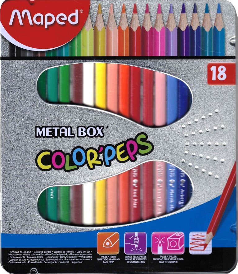 Souprava 18 kusů pastelek MAPED Color'Peps v plechovém pouzdře potěší každého malého umělce i školáka. Pastelky mají jasné barvy a měkkou odolnou tuhu. Trojhranný tvar usnadňuje dětem jejich držení.