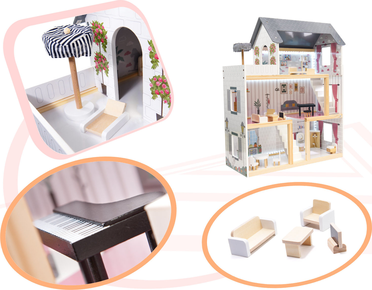 Které dítě nesní o krásné vile pro své panenky, maskoty a figurky? Nejlépe takovou, ve které mohou hostit i panenky svých kamarádů. Tento krásný dřevěný domeček pro panenky v moderním stylu bude splněným snem každého dítěte.